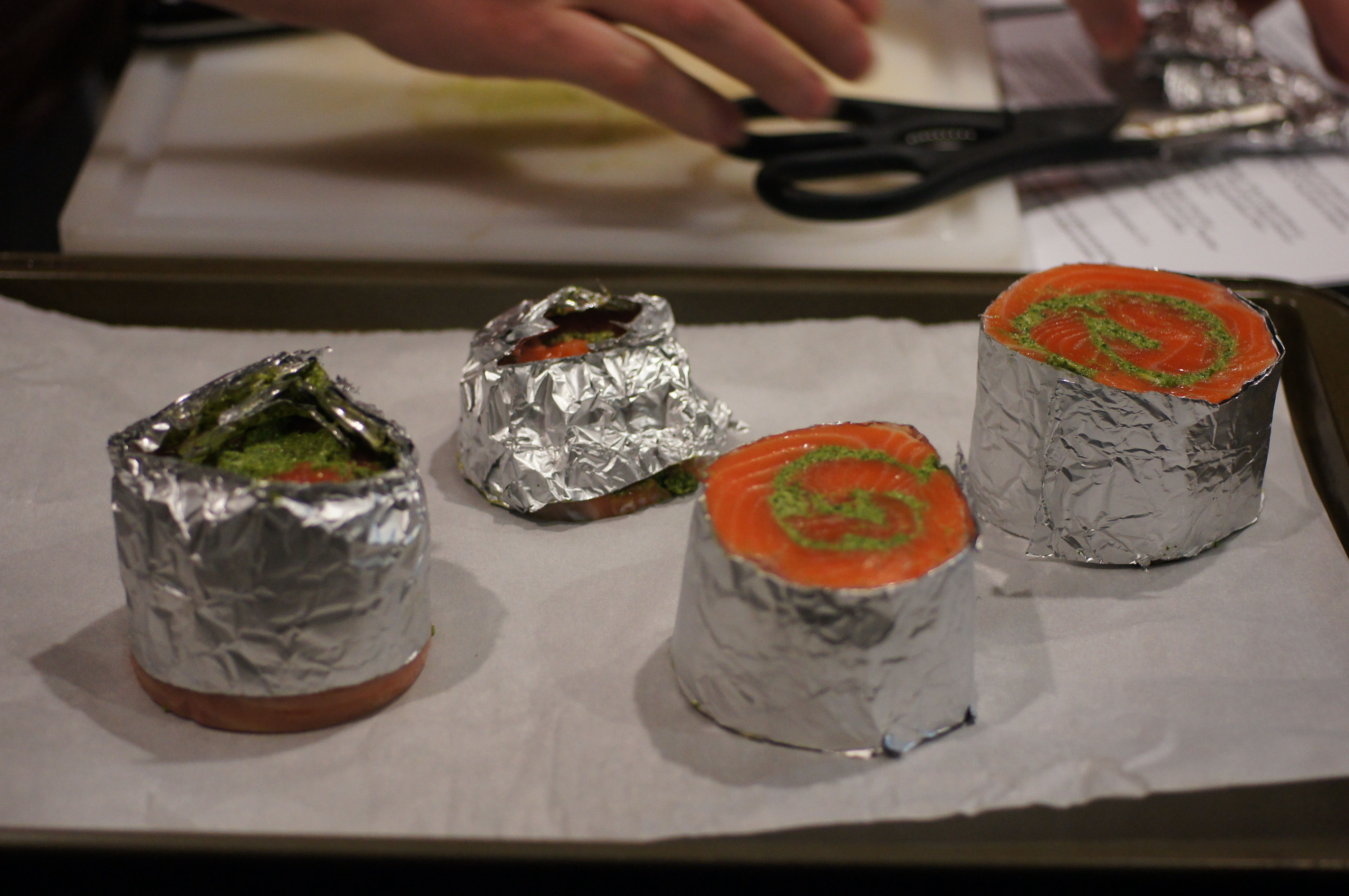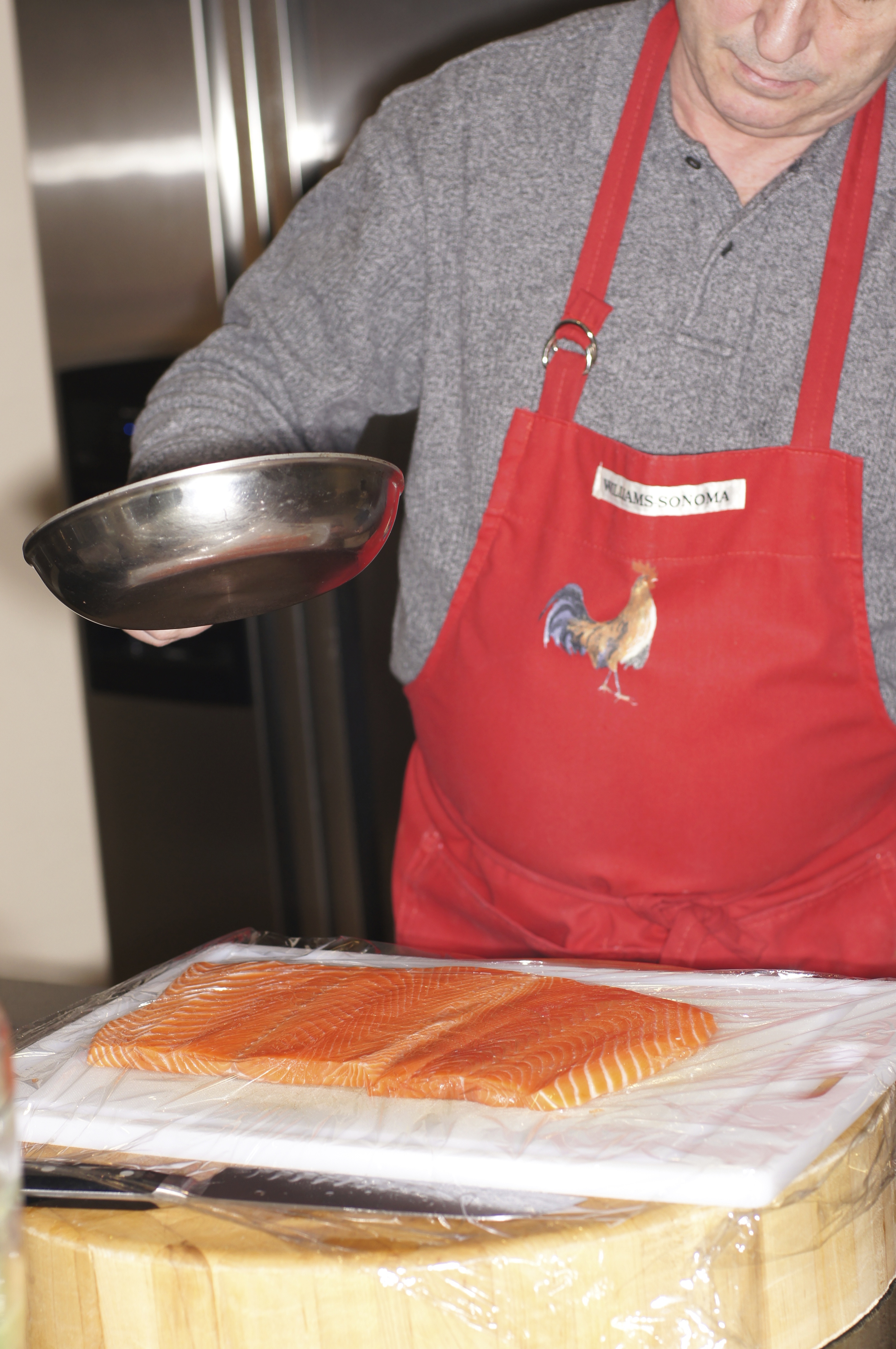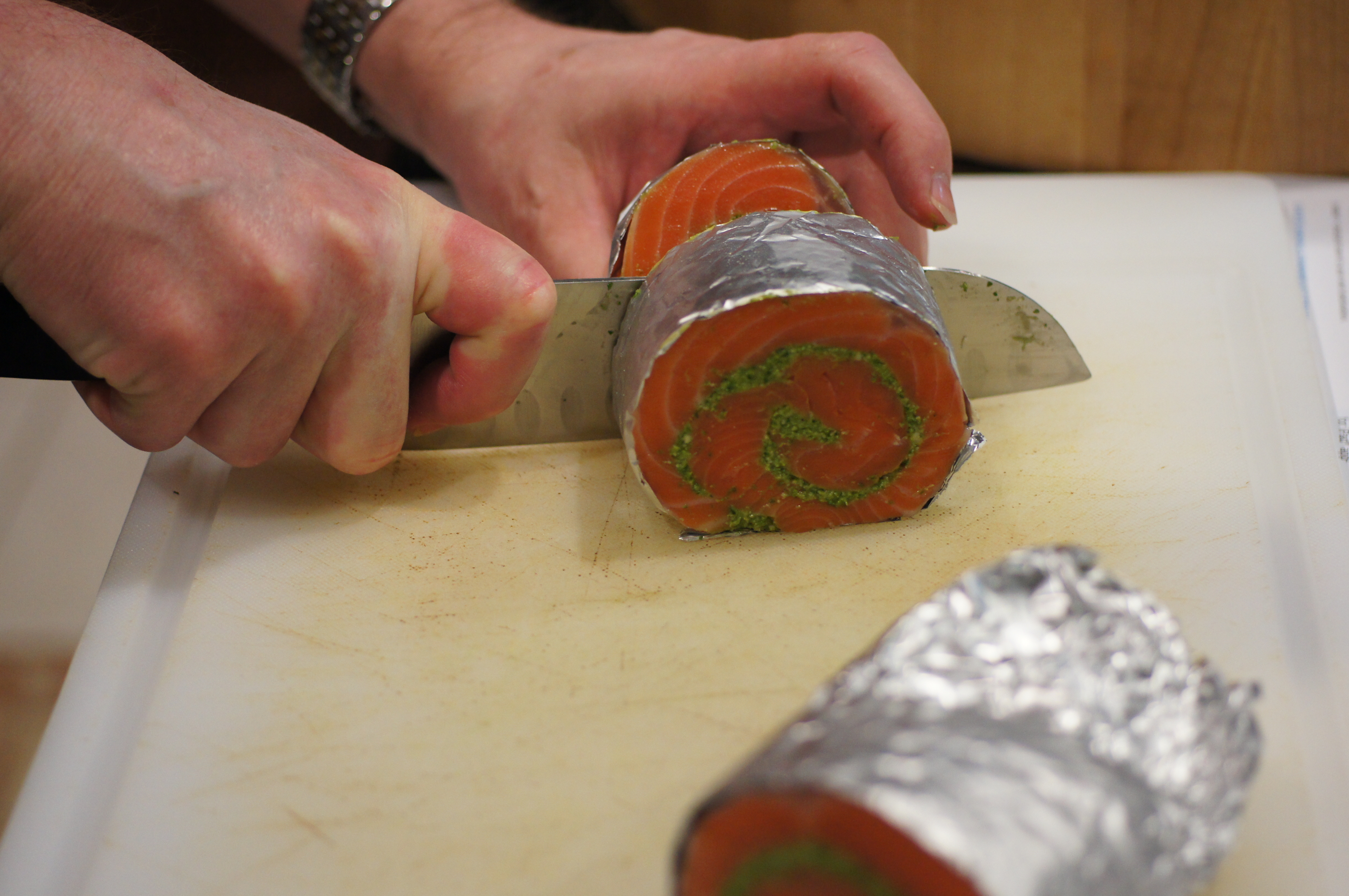 Roll salmon like you would a sushi roll. Notice I let the Baby Lady roll the salmon because she does it better than me. 🙂