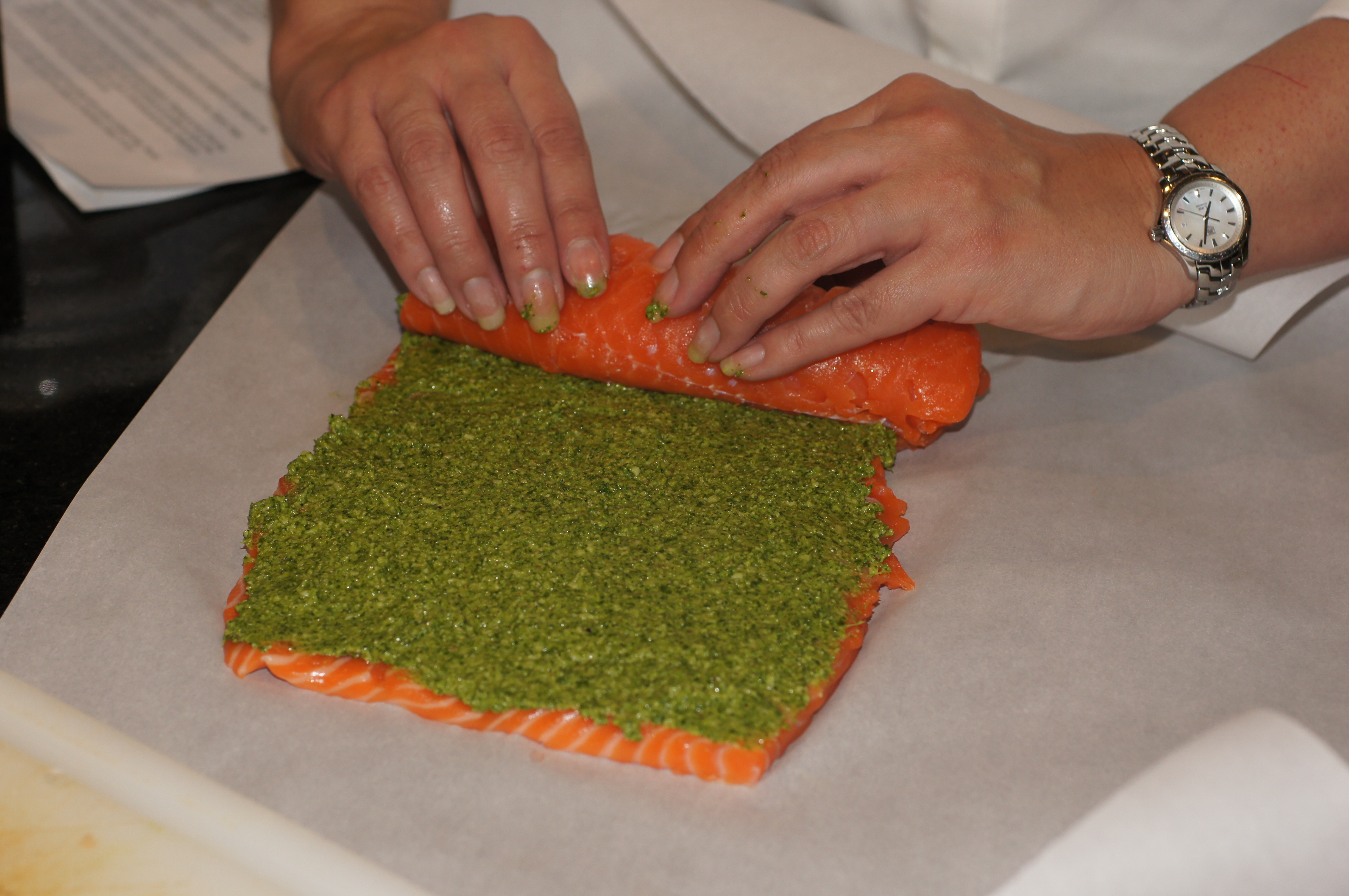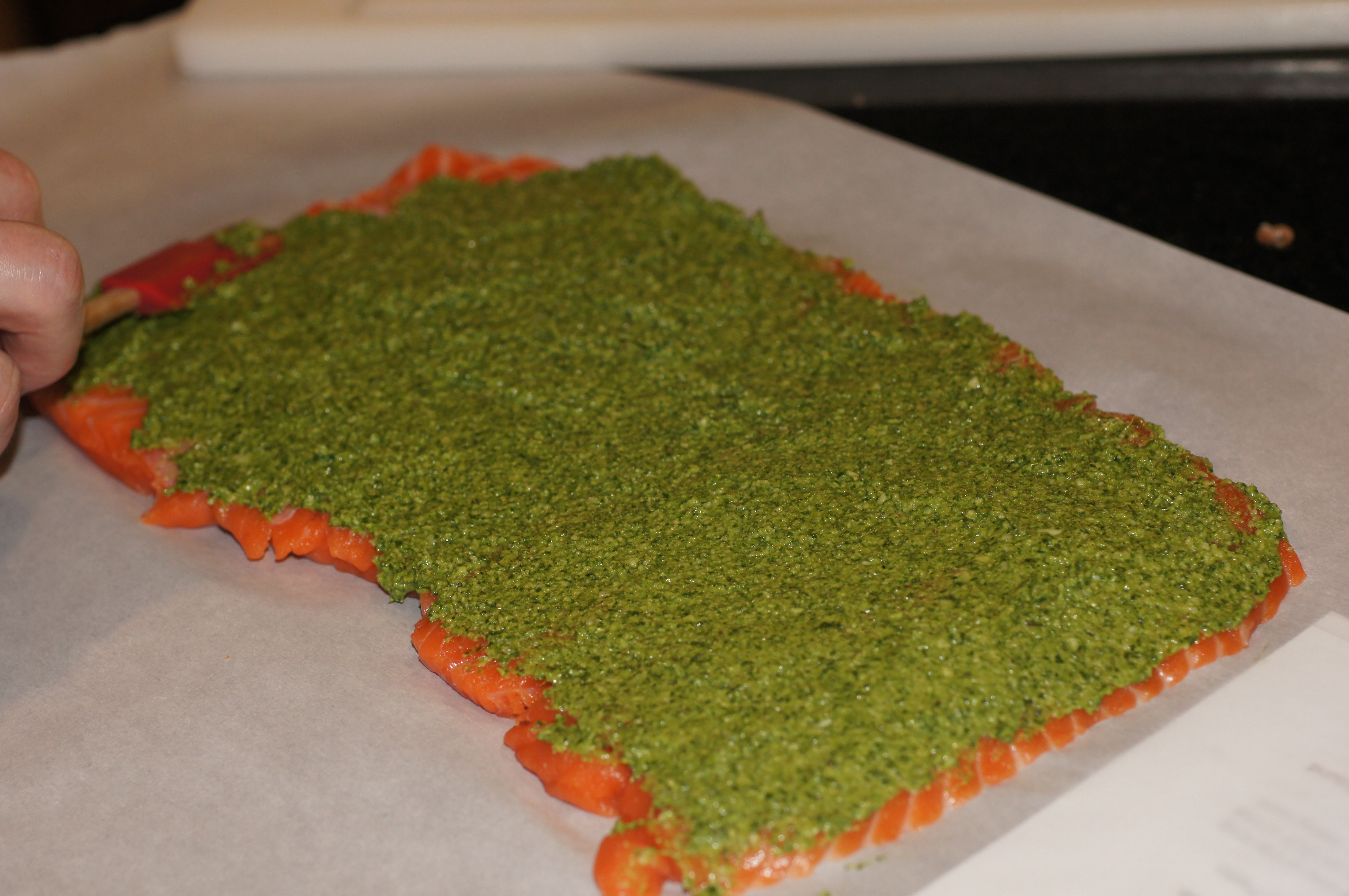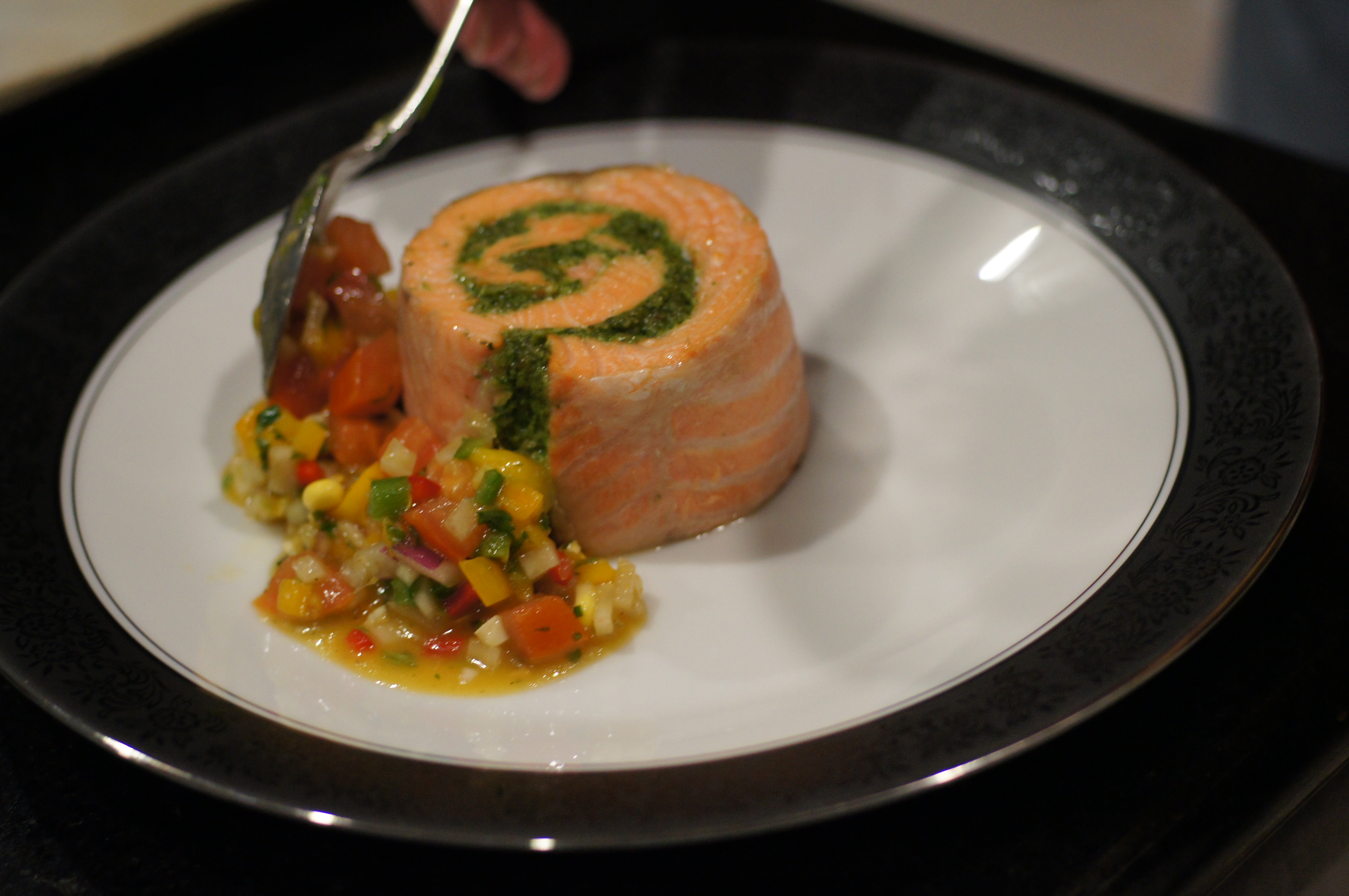 I make a similar dish with chicken as a roulade with a chicken forcemeat, ham slices and spinach (or chard) leaves in the roll. Rather than baking, though, it’s poached in the foil for about 15 mins and sliced on an angle after de-foiling. Maybe the salmon dish would come out OK like this? BTW I agree with some of the correspondents that a little cilantro goes a long way. How about dill in the pesto or the salsa?