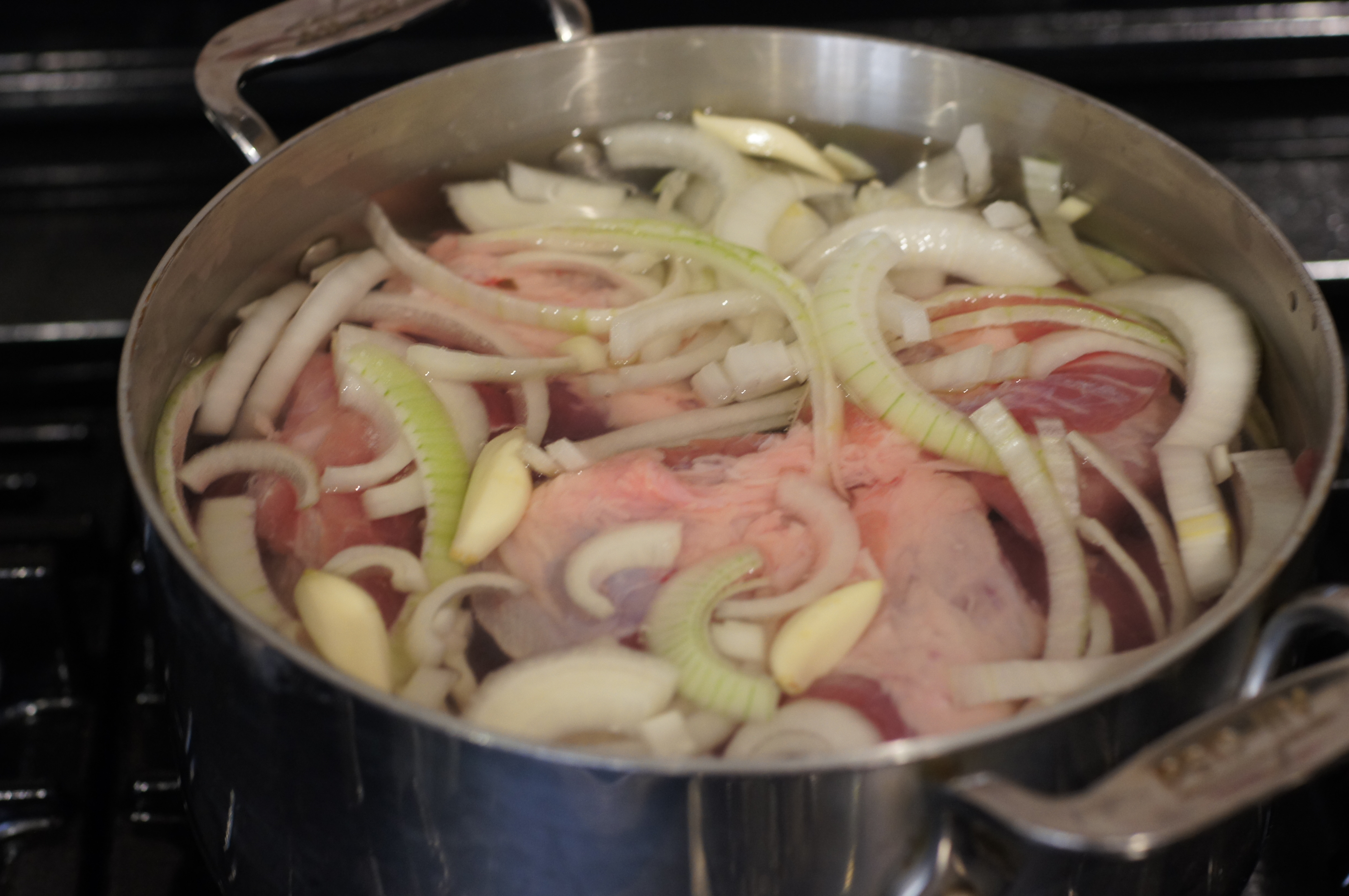 Step One. Take the pork, whole garlic cloves and sliced onions and place them in a large pot. Cover with water. Place over high heat and bring to a boil.