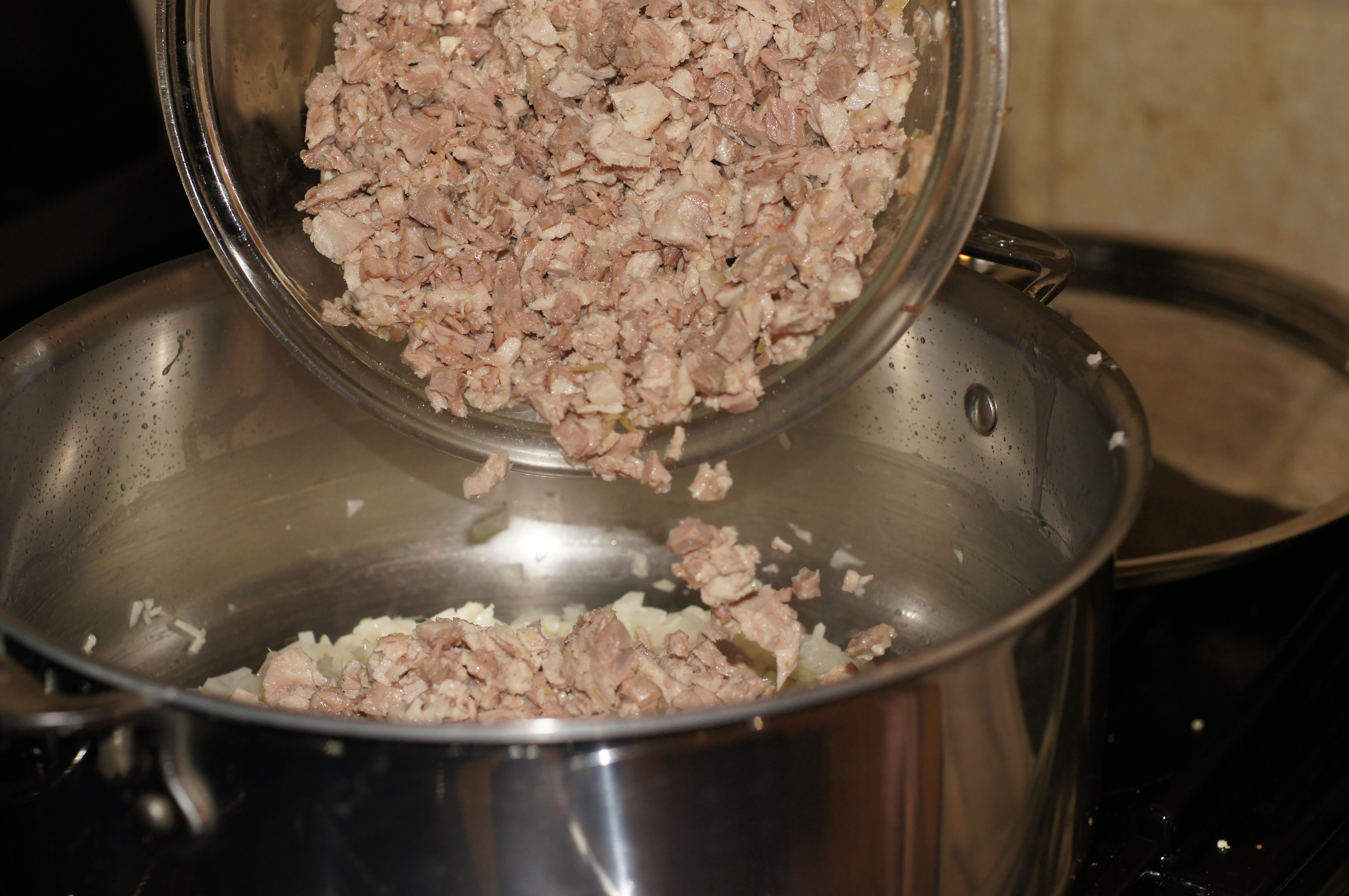 When the onions are soft and translucent, add the chopped pork to the pot.