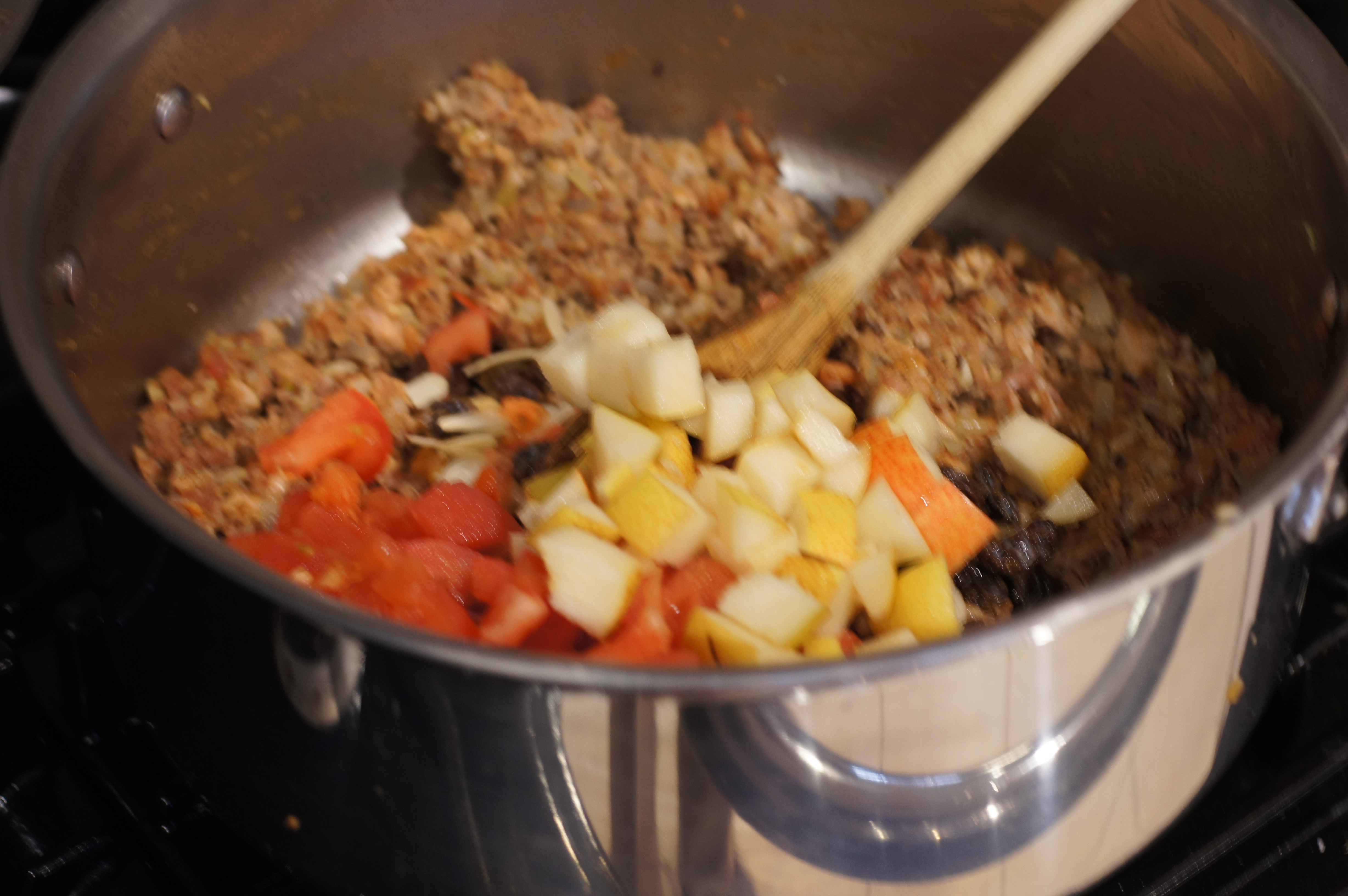 Add, the almonds, raisins, seasonings and pears to the pot.