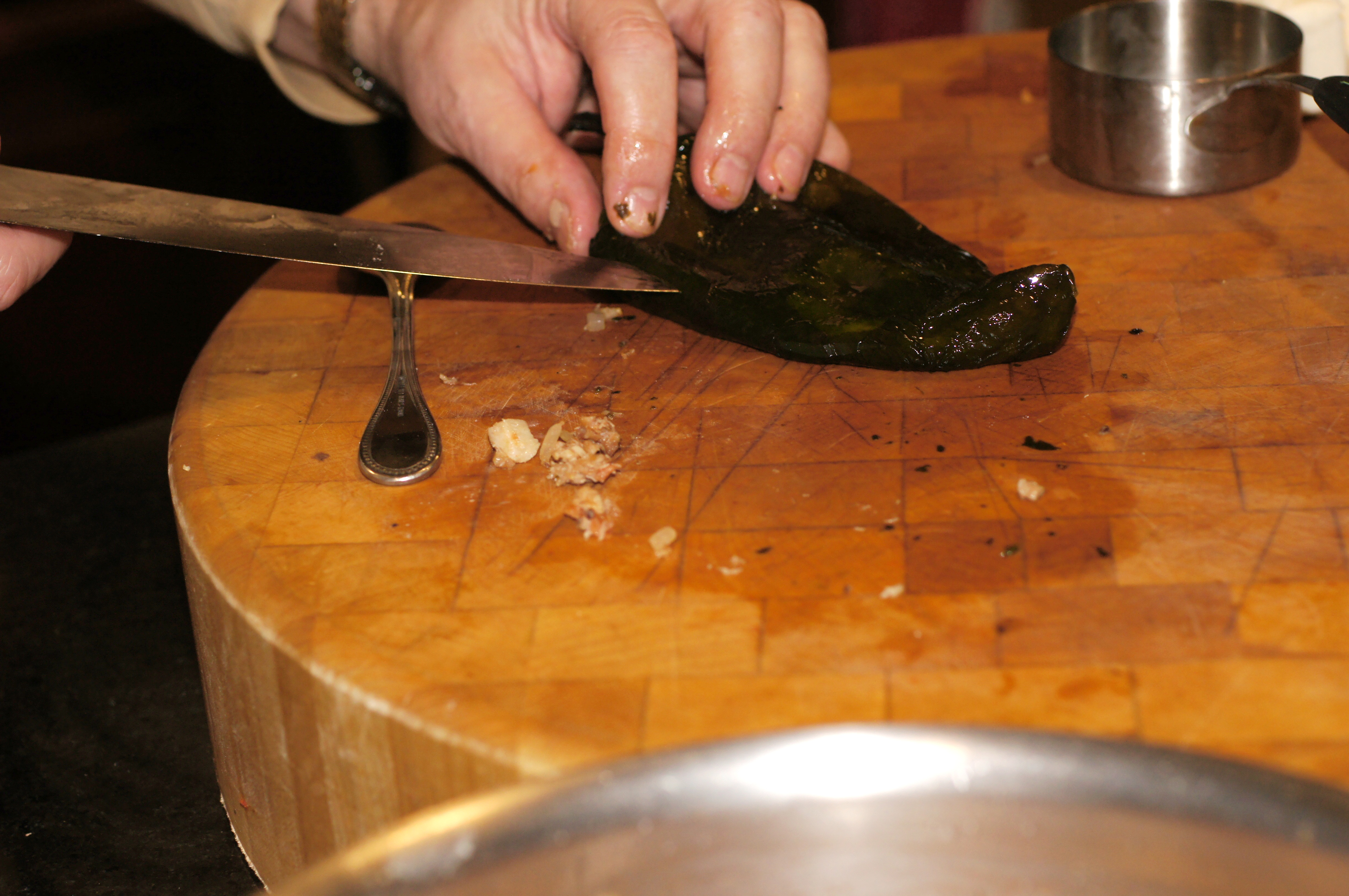 Like any traditional dish, there are numerous Chile Relleno an Nogada recipes. Some people proclaim their recipe to be “authentic.” Others take a more sophisticated approach. Still others simplify the recipe and tell you it can all be accomplished in an hour (something about which I have serious doubts). Then, there is the constant debate over whether it should be served “capeado” (battered) or merely roasted, i.e. naked. It’s kinda like the debate between cajuns and variations of gumbos (with or without okra) or the disagreement among Texans and the variations on chili (with or without beans).