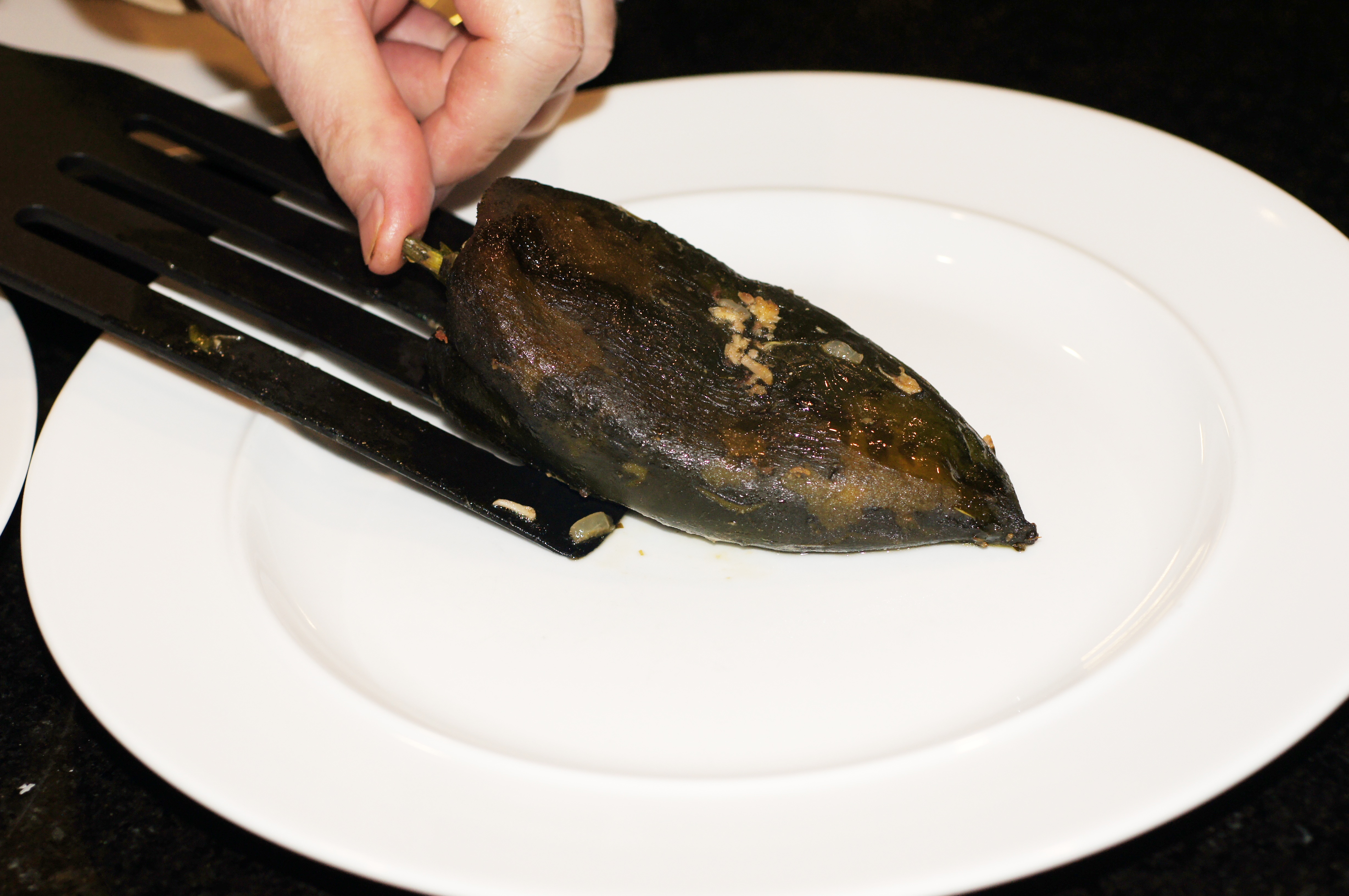 Slit a roasted poblano along the side edge. You will need a 1-1/2 inch to 2 inch slit.