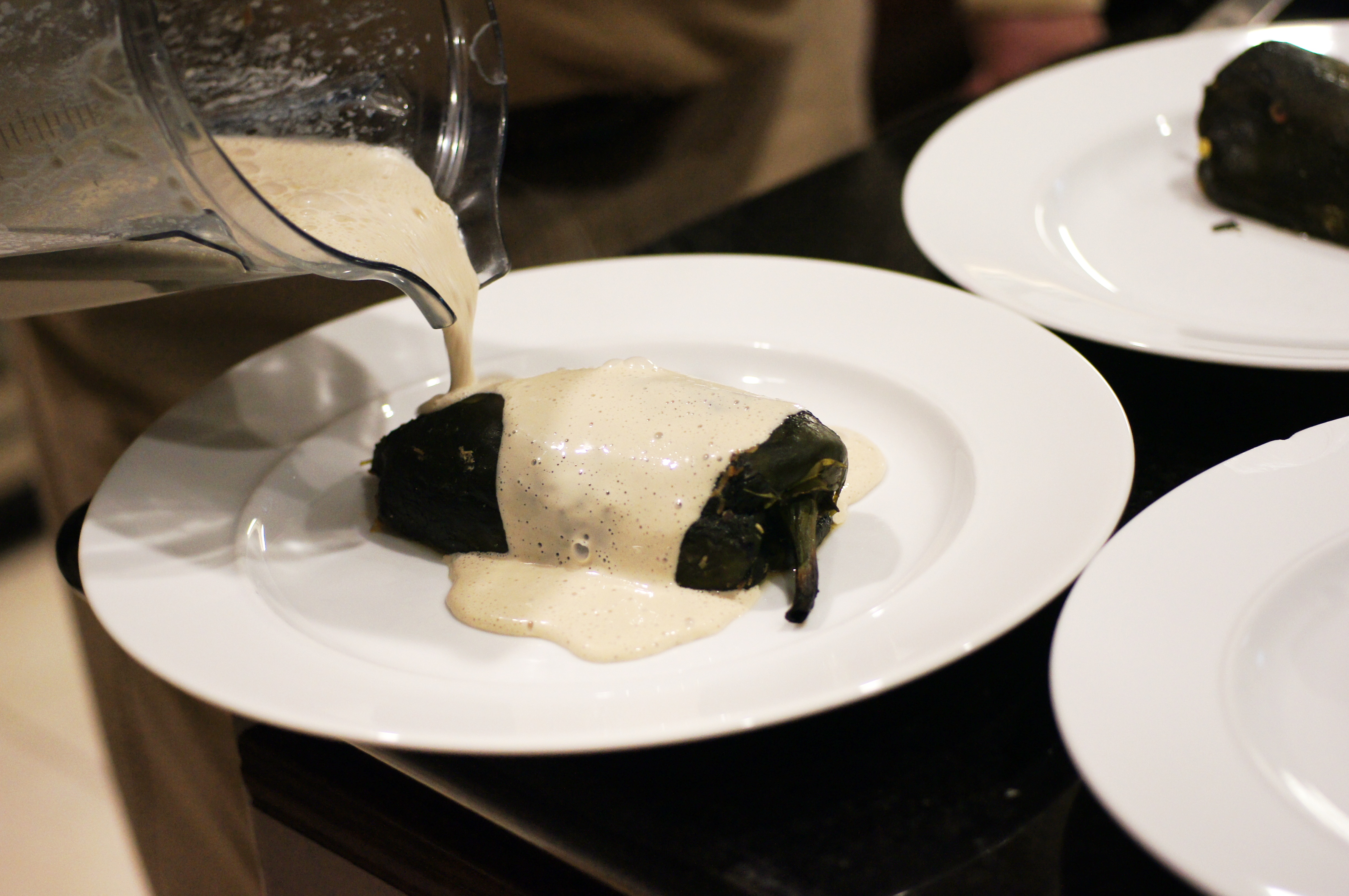 Blend the sauce for 8 minutes at the highest speed. This will liquify the nuts and friction heat the sauce so it will be ready to pour over the rellenos.