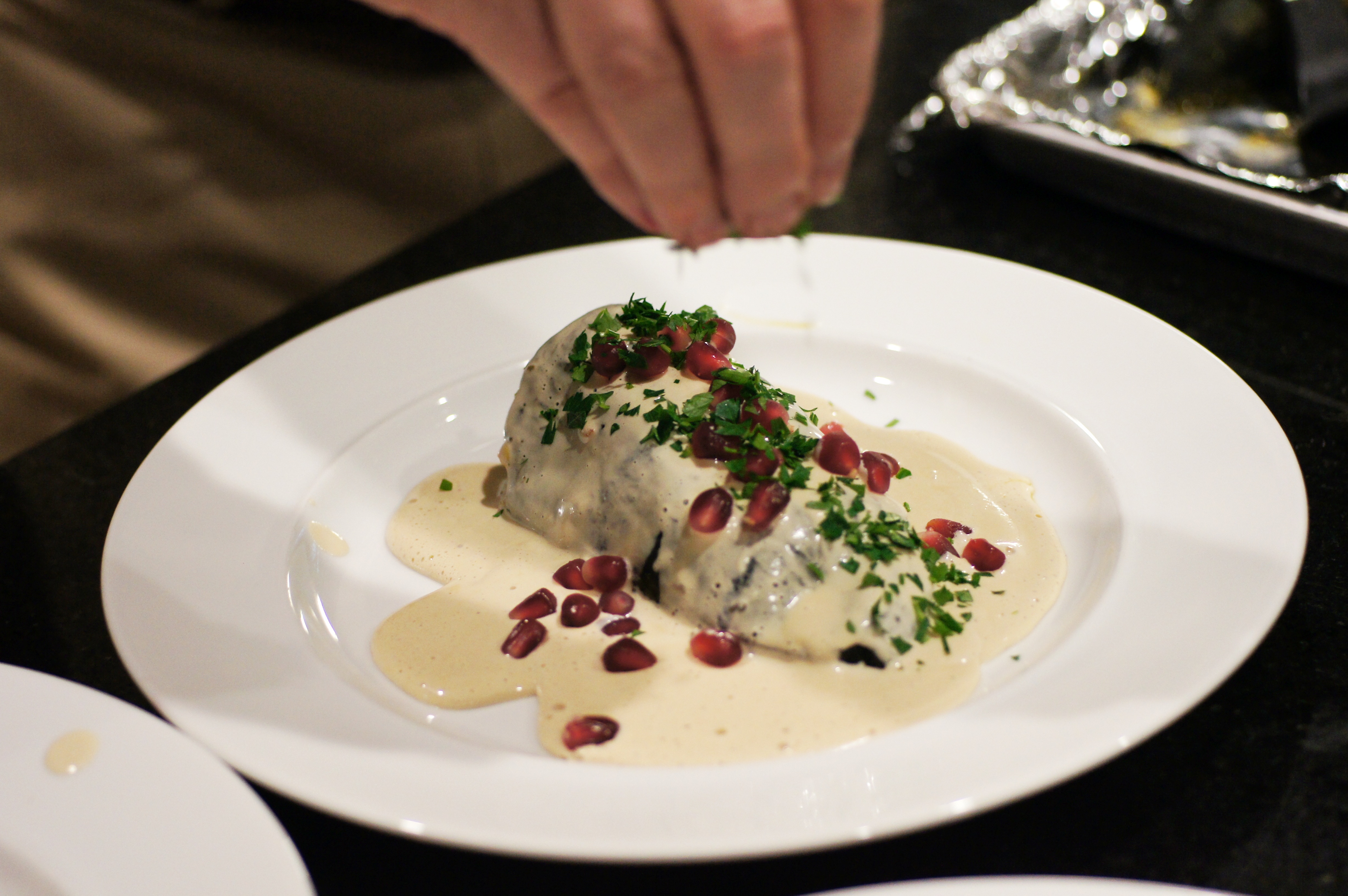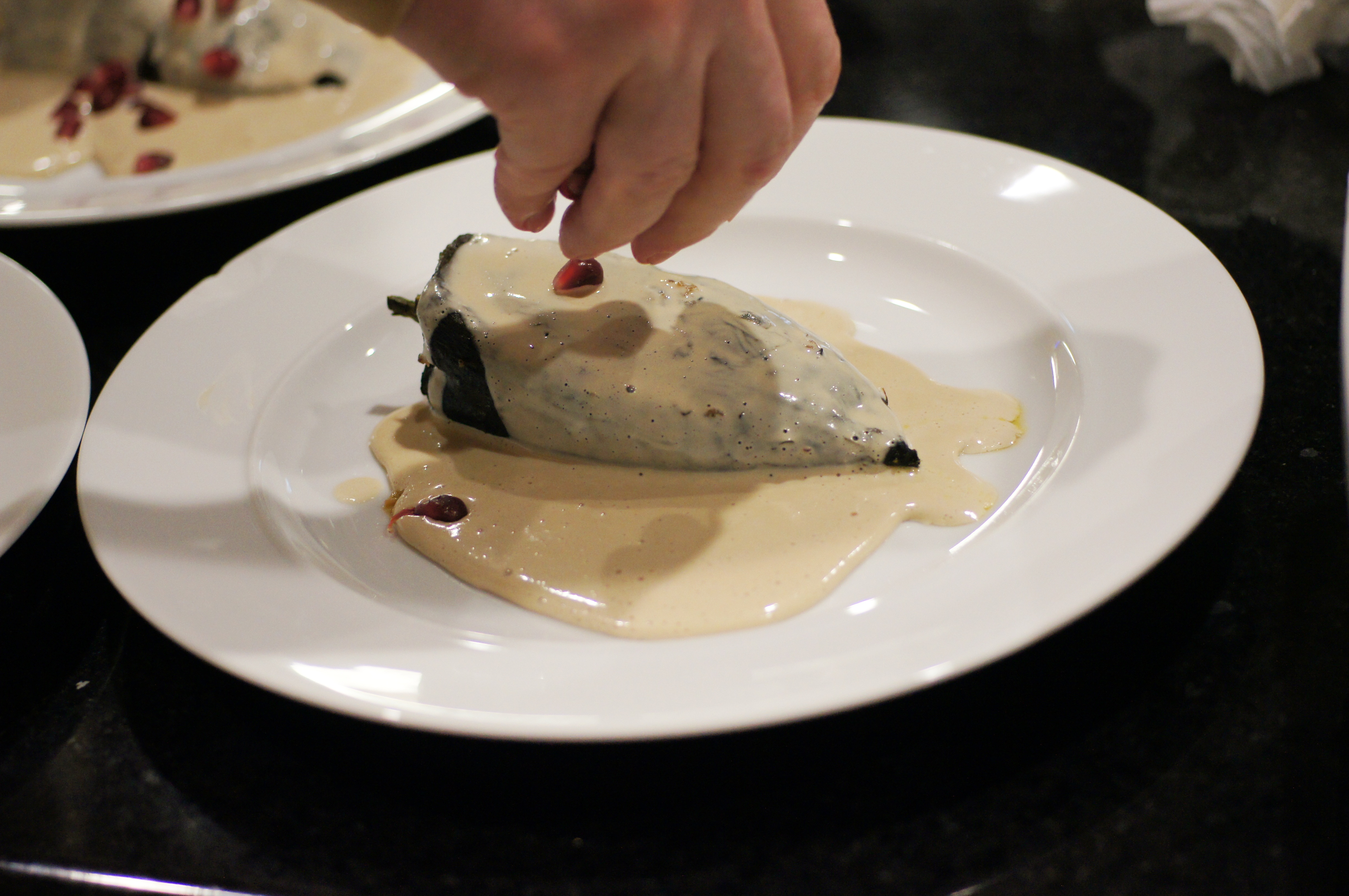 Regardless of the history of the dish, Chile Relleno en Nogada is a seasonal dish. It is made in late Summer to early Fall when walnuts and pomegranates are available. It is also a very festive dish because it is in celebration of Mexican Independence Day (September 16). Once the walnuts and pomegranates begin appearing at the local mercado, you begin to see the restaurants posting “Tenemos Chiles en Nogada!” (We Have Chiles in Walnut Sauce) banners. Inasmuch as we don’t start seeing pomegranates until mid to late October, Chile Relleno en Nogada is a perfect meal for the holiday season. It is a very festive dish and the colors of the Mexican flag also work beautifully with the Christmas season. 🙂 Because pomegranates will keep whole in your fridge for many weeks (up to 2 months) and we have a pomegranate tree that produced beautifully this year, we had everything to make this dish last night, so, with a little planning, we did.