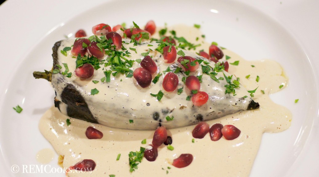 Chile Relleno en Nogada is a classic, traditional Mexican dish. It is a roasted poblano pepper stuffed with a picadillo made of pork, nuts, fruits and veggies covered with a creamy walnut sauce and sprinkled with pomegranates and parsley. Kinda Pretty isn’t it? Tasty, too.