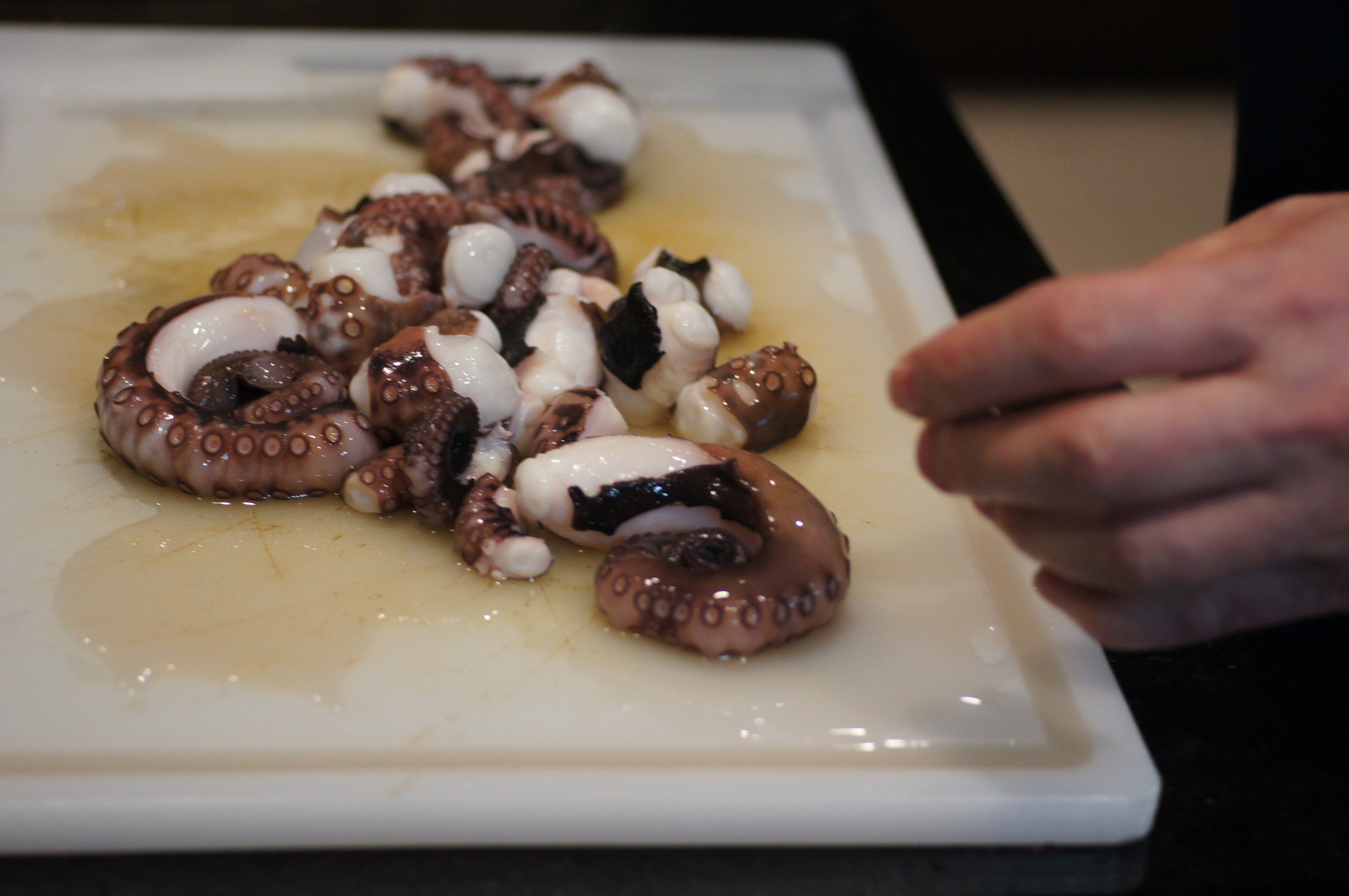 Cook the octopus for 2 – 3 minutes. Remove from the pot and slice the tentacles into roughly 2 inch pieces.