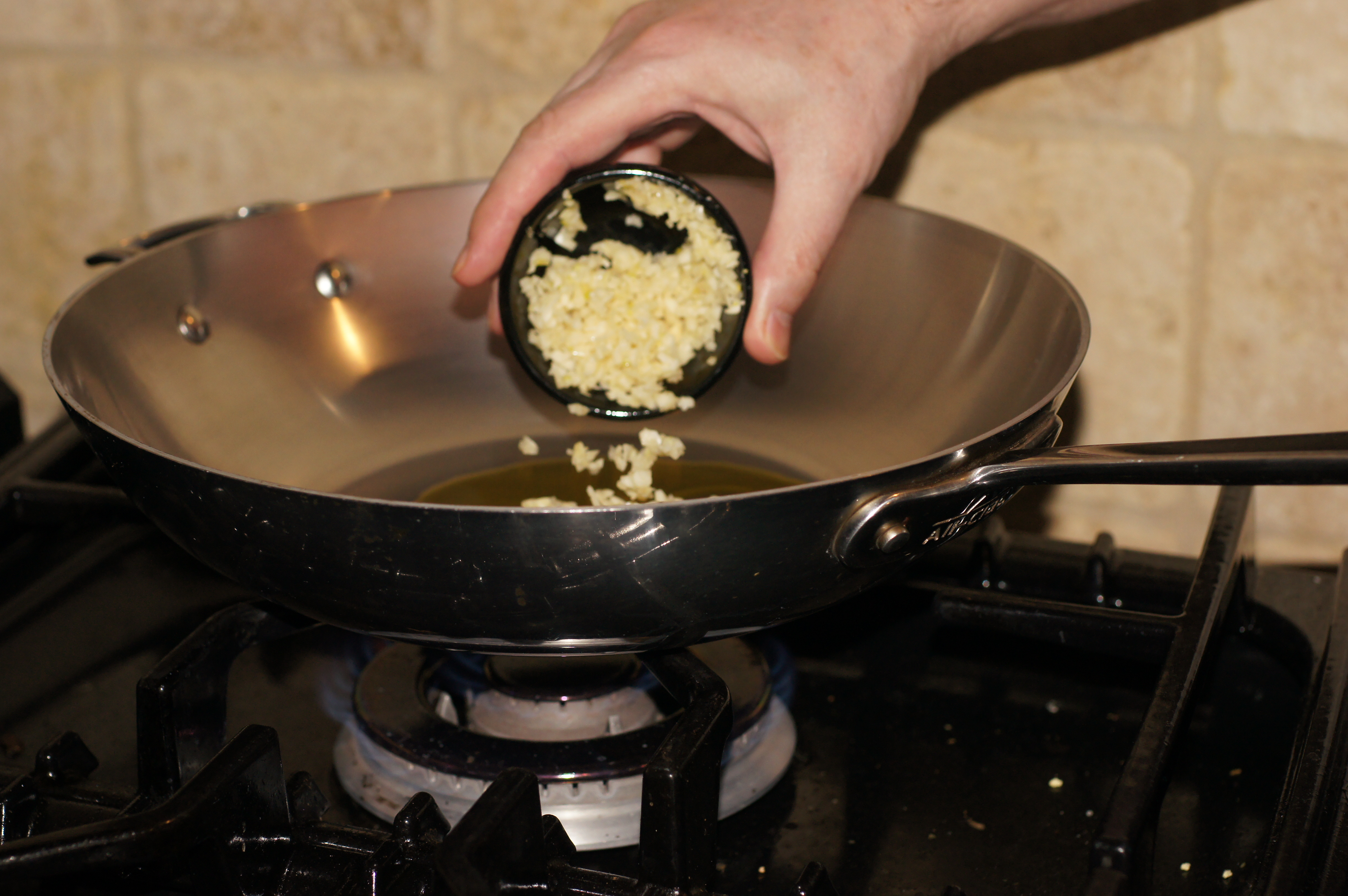 Pour olive oil into a chef’s pan or large pot over medium heat. Add minced garlic.