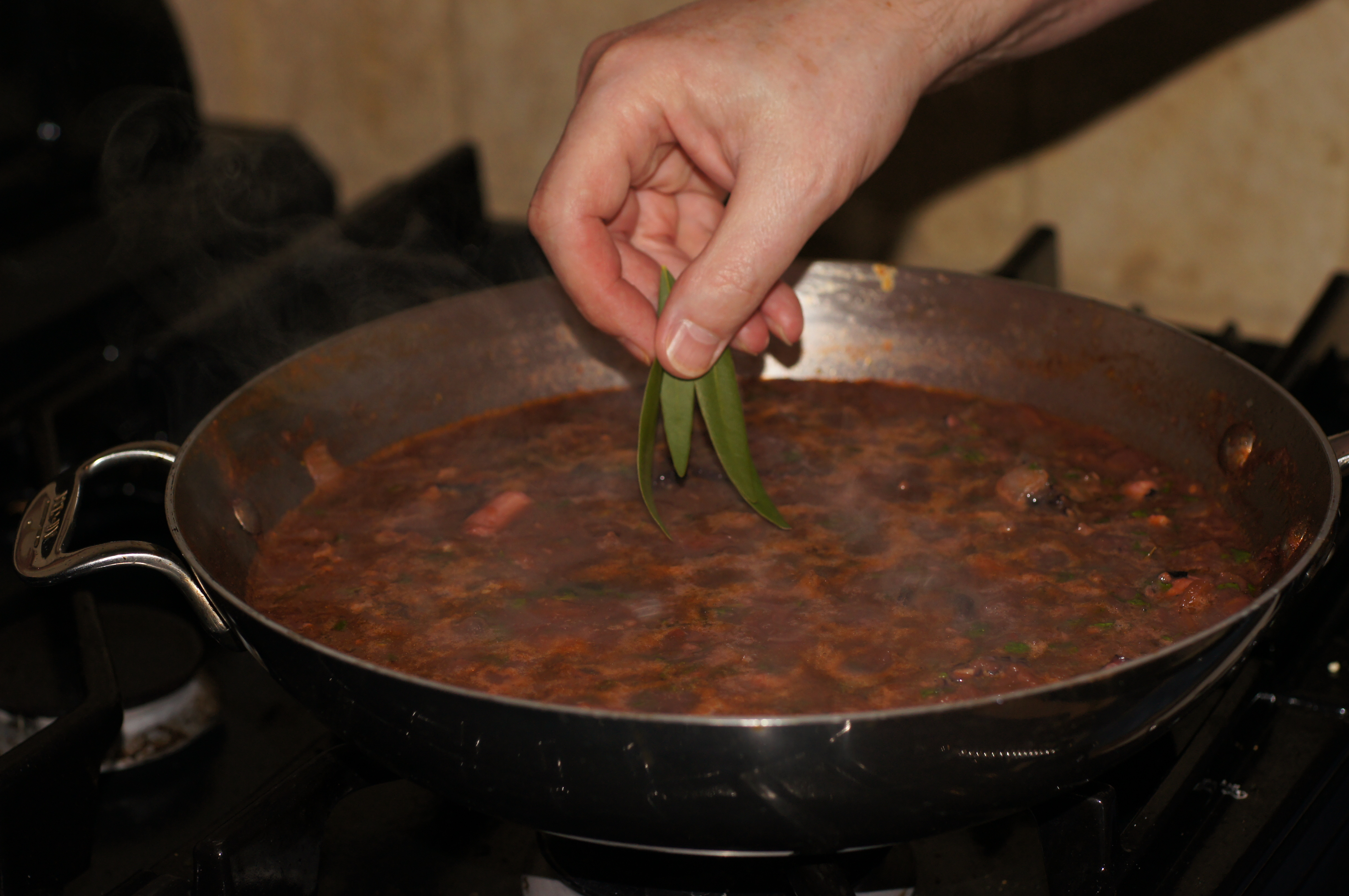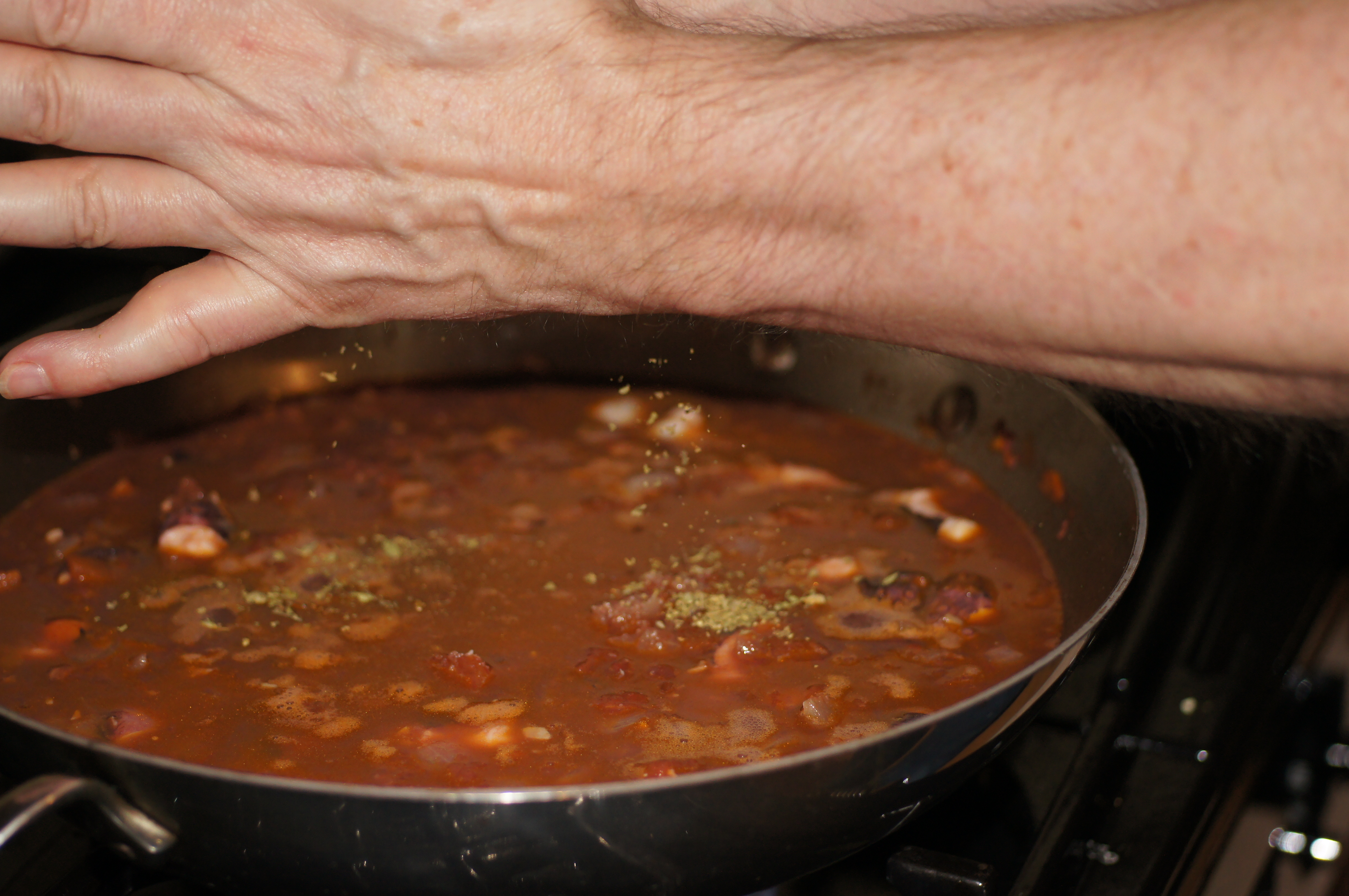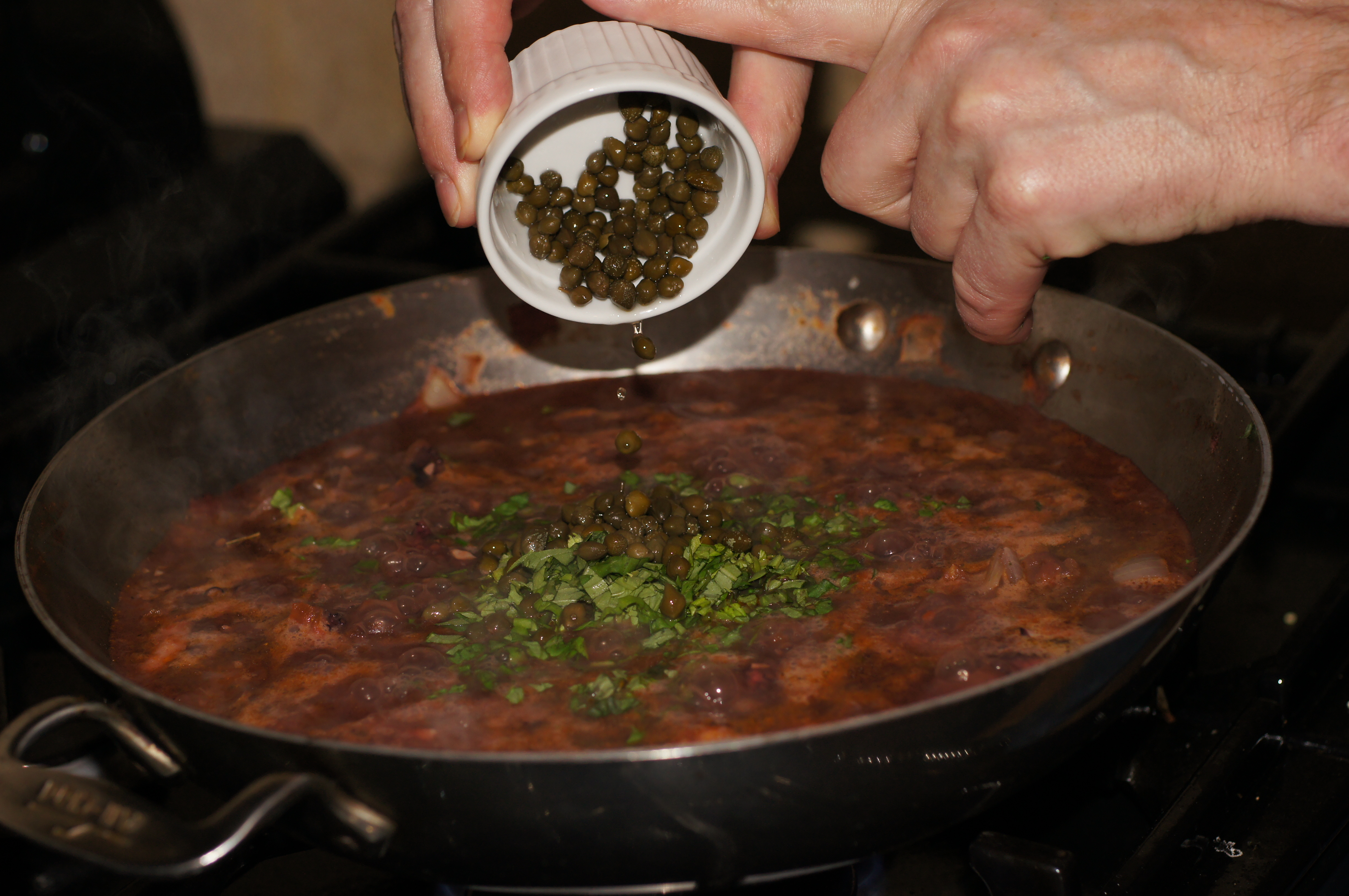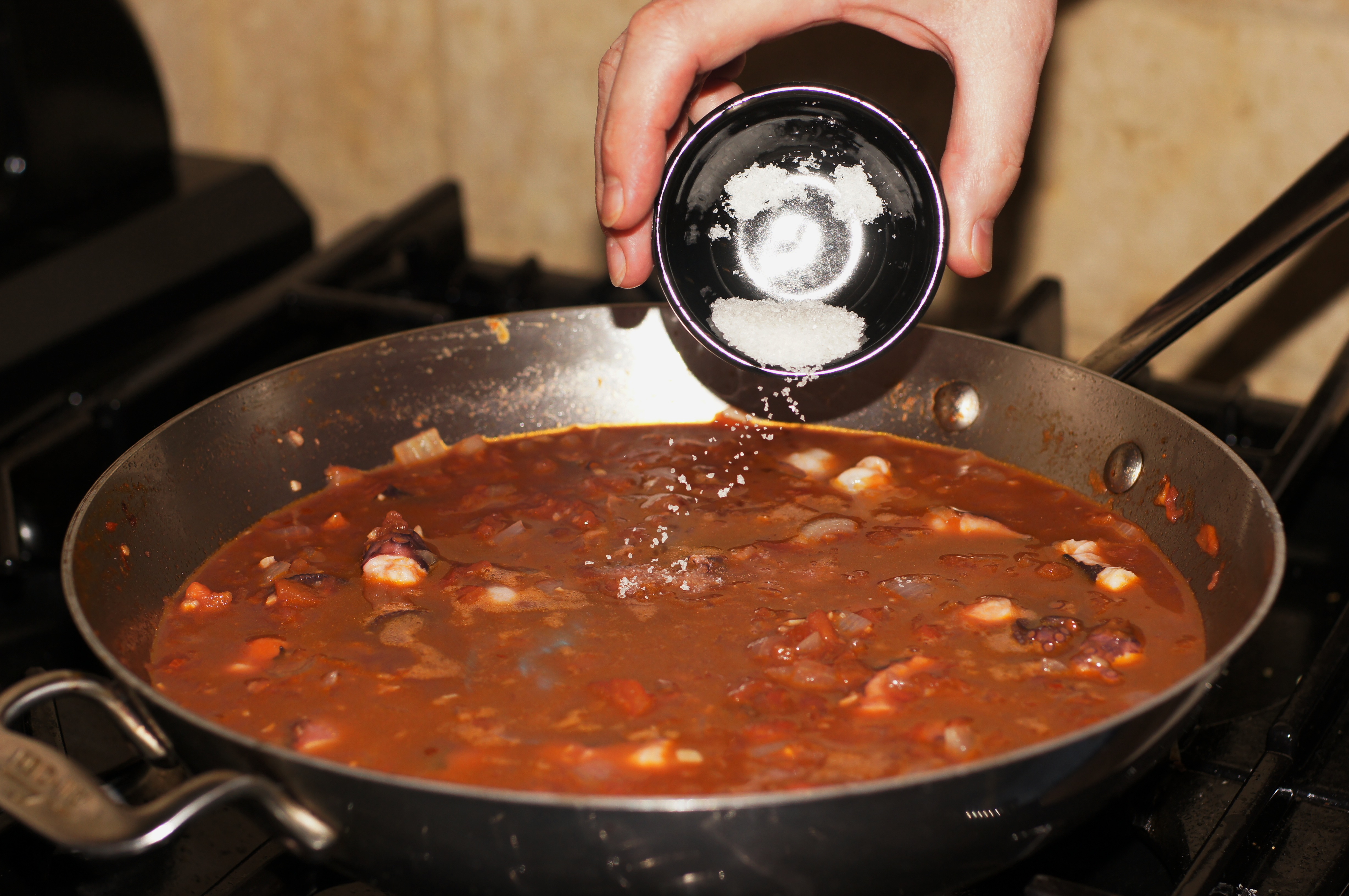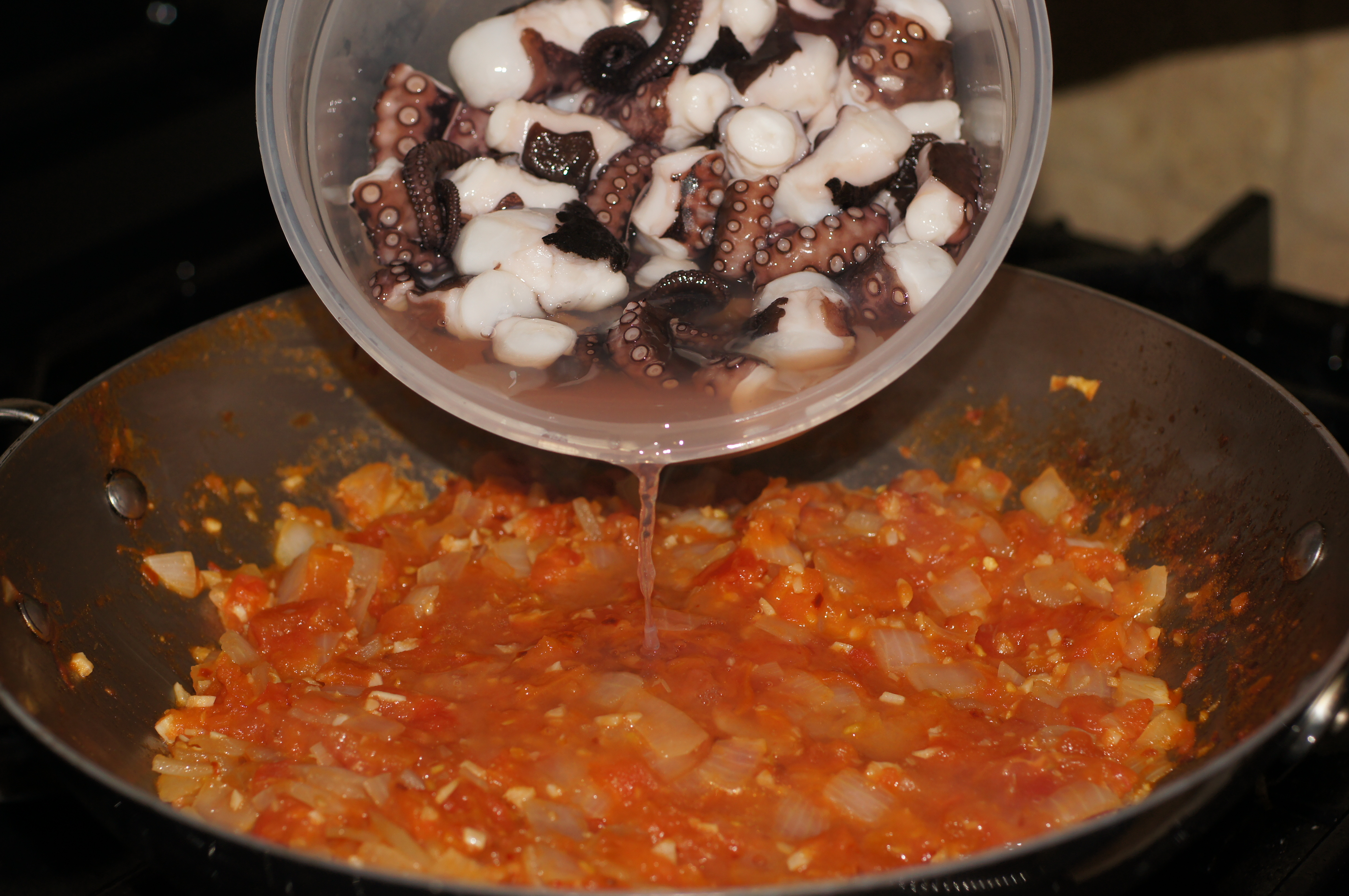 Cook over medium high heat, stirring occasionally, until the tomatoes break down, roughly 10 minutes. Now, add the sliced octopus and any juices.