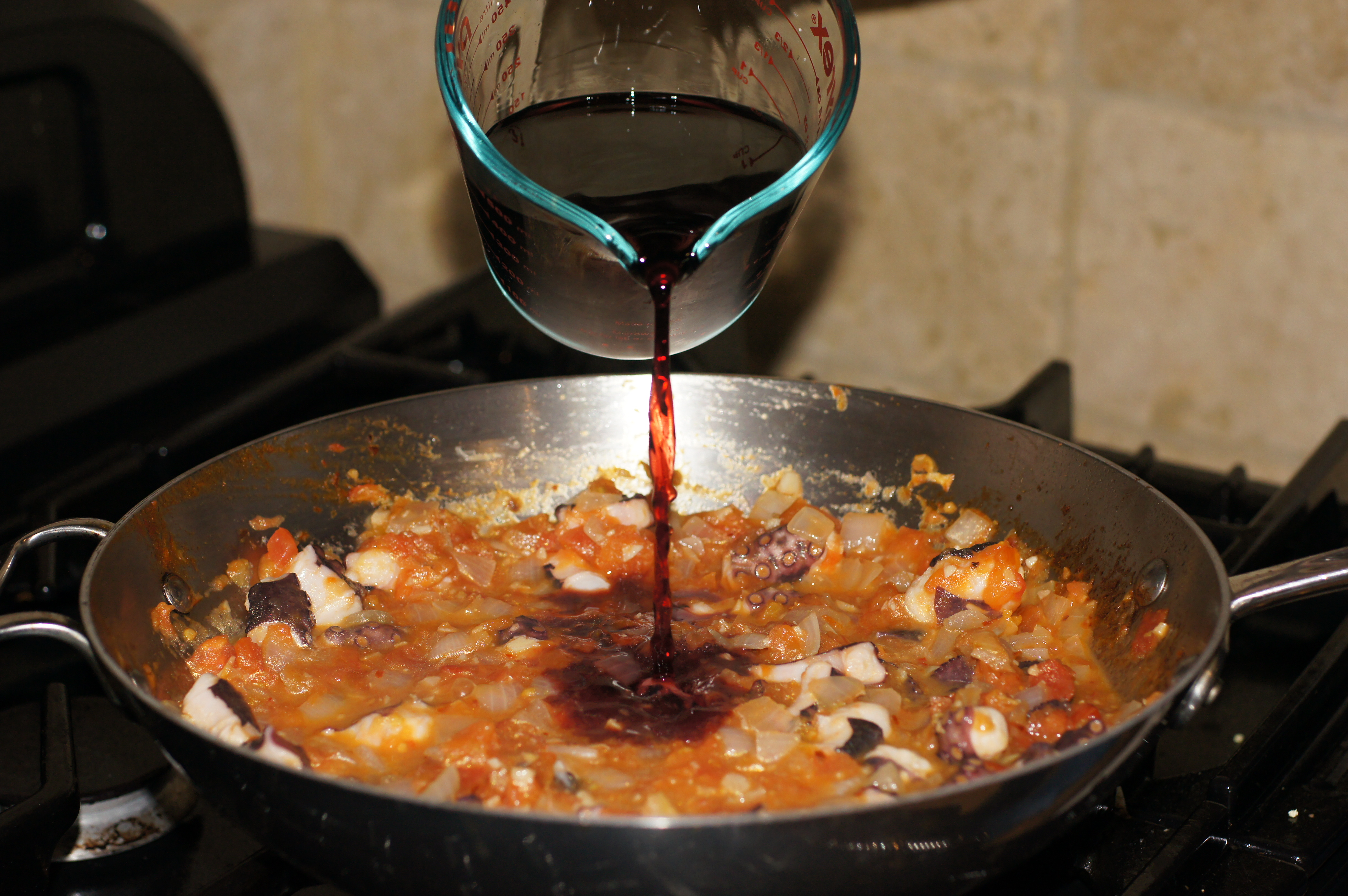 NOTES: You can substitute dry white wine for the red wine. We enjoy the added depth of flavor with the red. Also, if you don’t want your braised octopus spicy either reduce the red pepper flakes to 1 Tbsp or eliminate it all together.