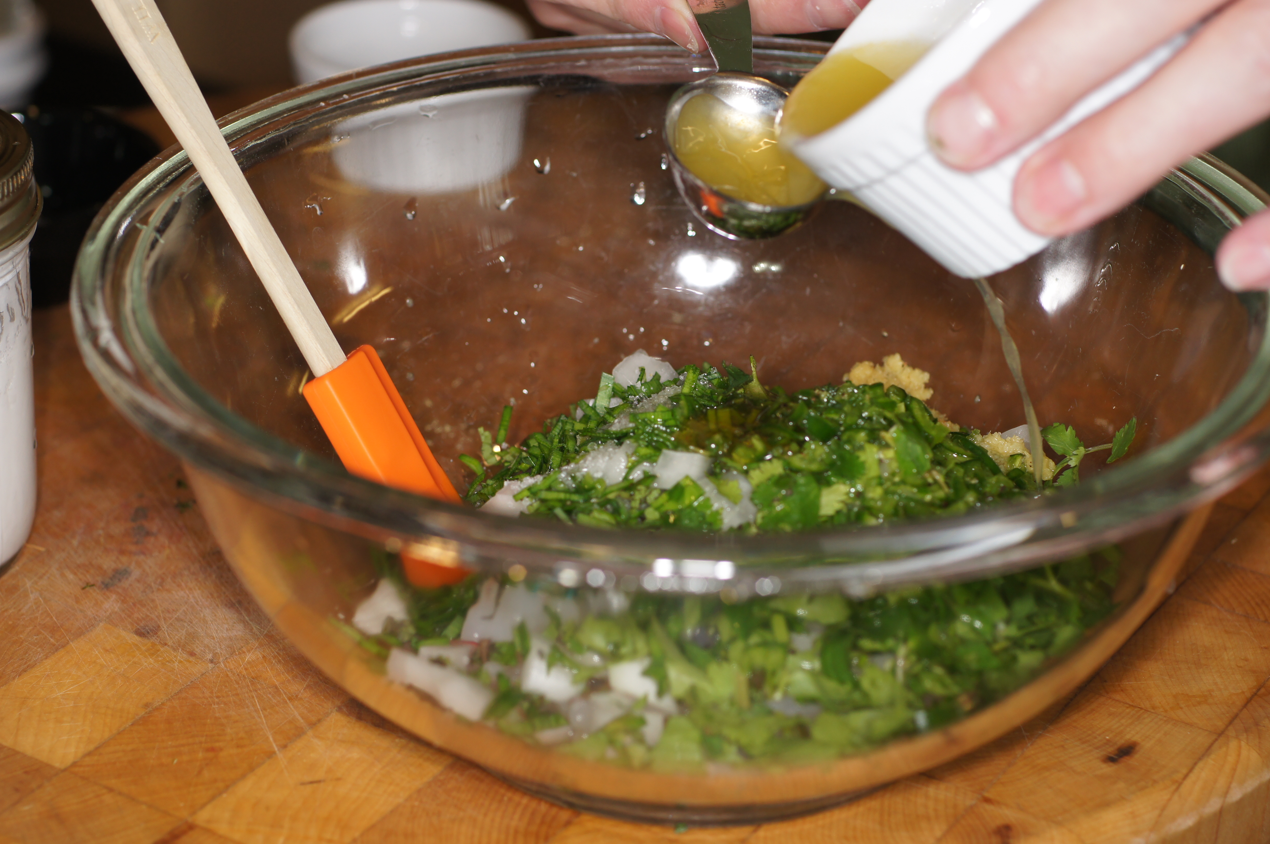 You really can’t get much easier than ceviche. Put the shrimp in a bowl and add the onions, cilantro, mint and chives