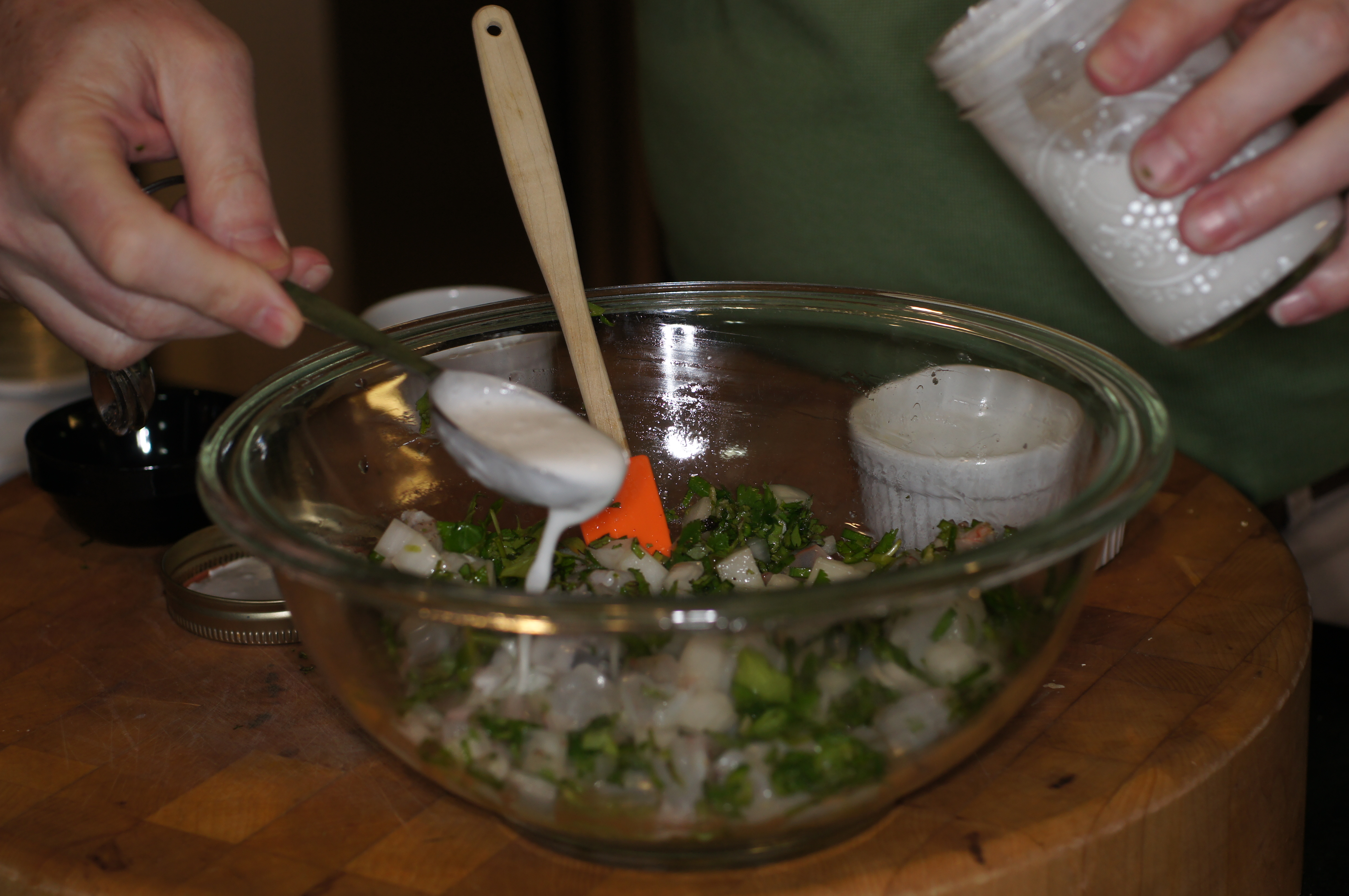 Now, if you have been reading this blog for a while, you know Baby Lady and I love ceviche. It’s such a versatile dish, is simple and has the freshest ingredients. How can you go wrong with that combination? You can serve it for lunch as a salad by itself or on a bed of lettuce, other greens, or veggies. You can serve it as an appetizer at dinner or as a light dinner by itself or with other small plates. Sadly, when most people think of ceviche, all they think of is either shrimp or white fish in lime juice with some hot chiles, maybe some onion and cilantro or parsley. While that is one way to fix ceviche, there are countless ceviche preparations. We’ve featured 3 other, very different, ceviches on the blog and this one is different still. There is just so many different fishes you can use in the ceviche and you can do many different treatments. This one is fun because it is an Asian flair with coconut milk. Now with Spring approaching or already here, give this a try. You will be glad you did.