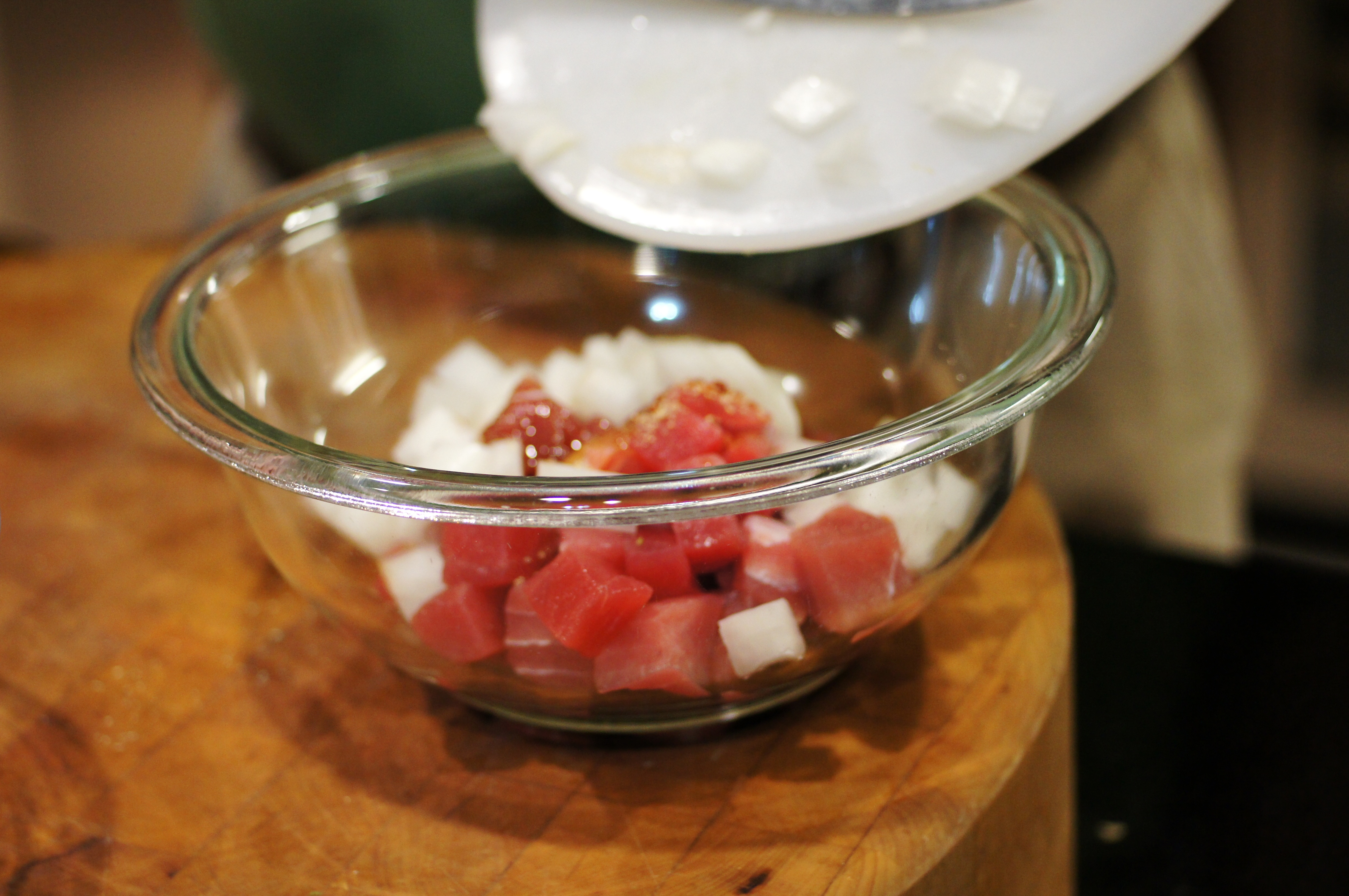 Poke, like ceviche, is a simple dish, basically a no-brainer.” After you have all your ingredients prepped, put the ahi in a large mixing bowl and add the salt, ground white pepper and soy sauce