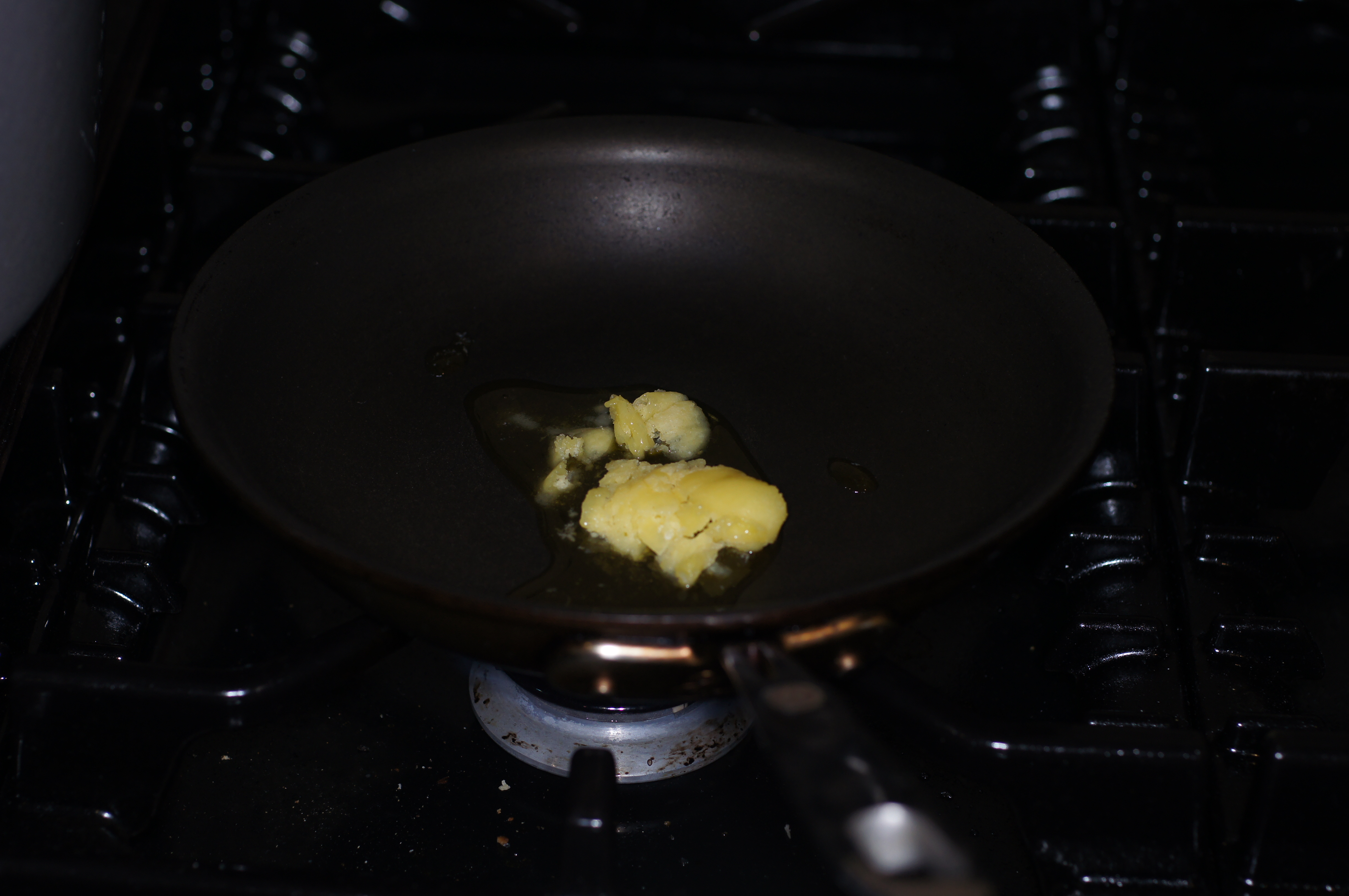 Using an 8 inch egg pan, add the clarified butter to the pan over medium-high heat.