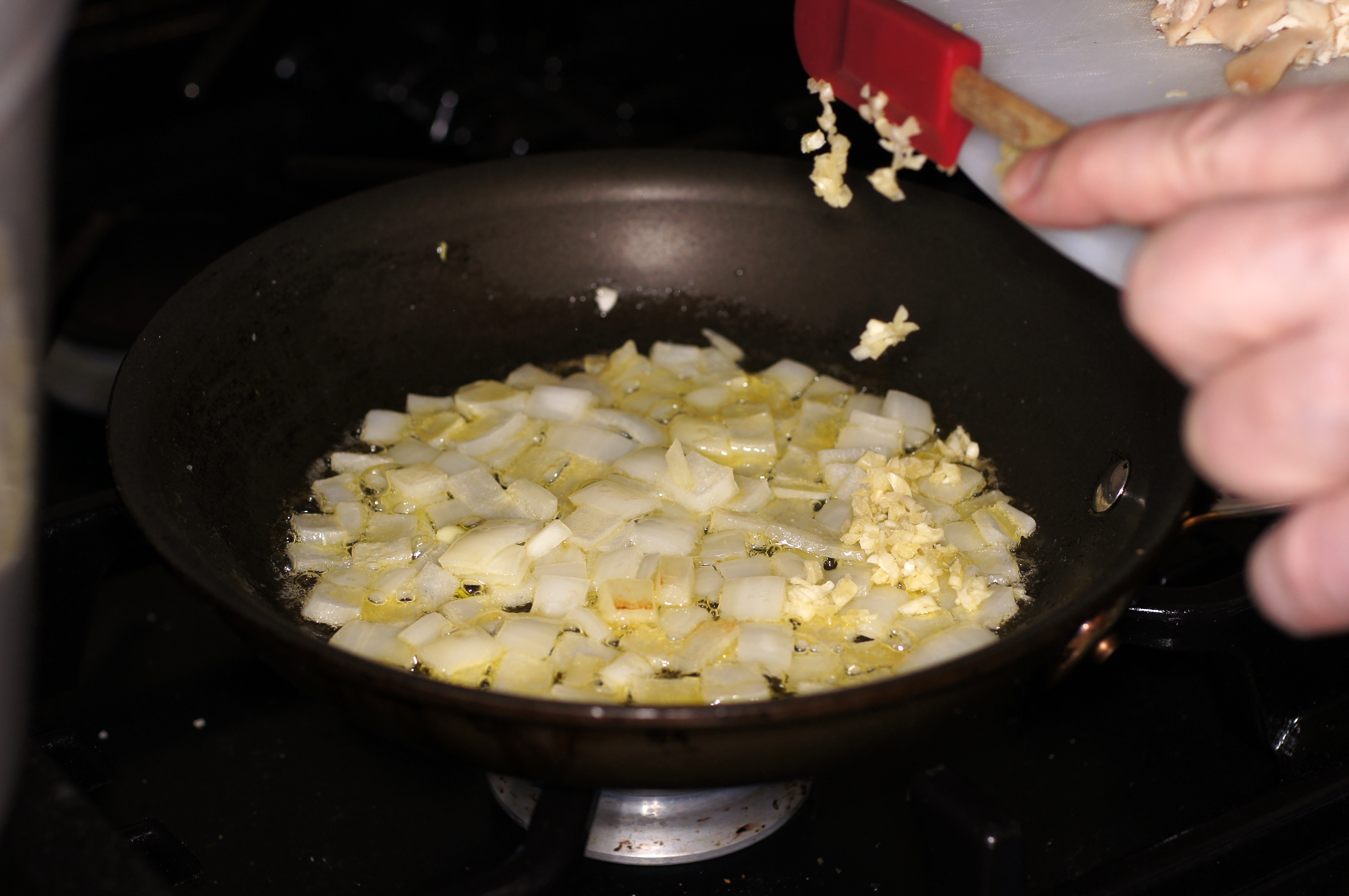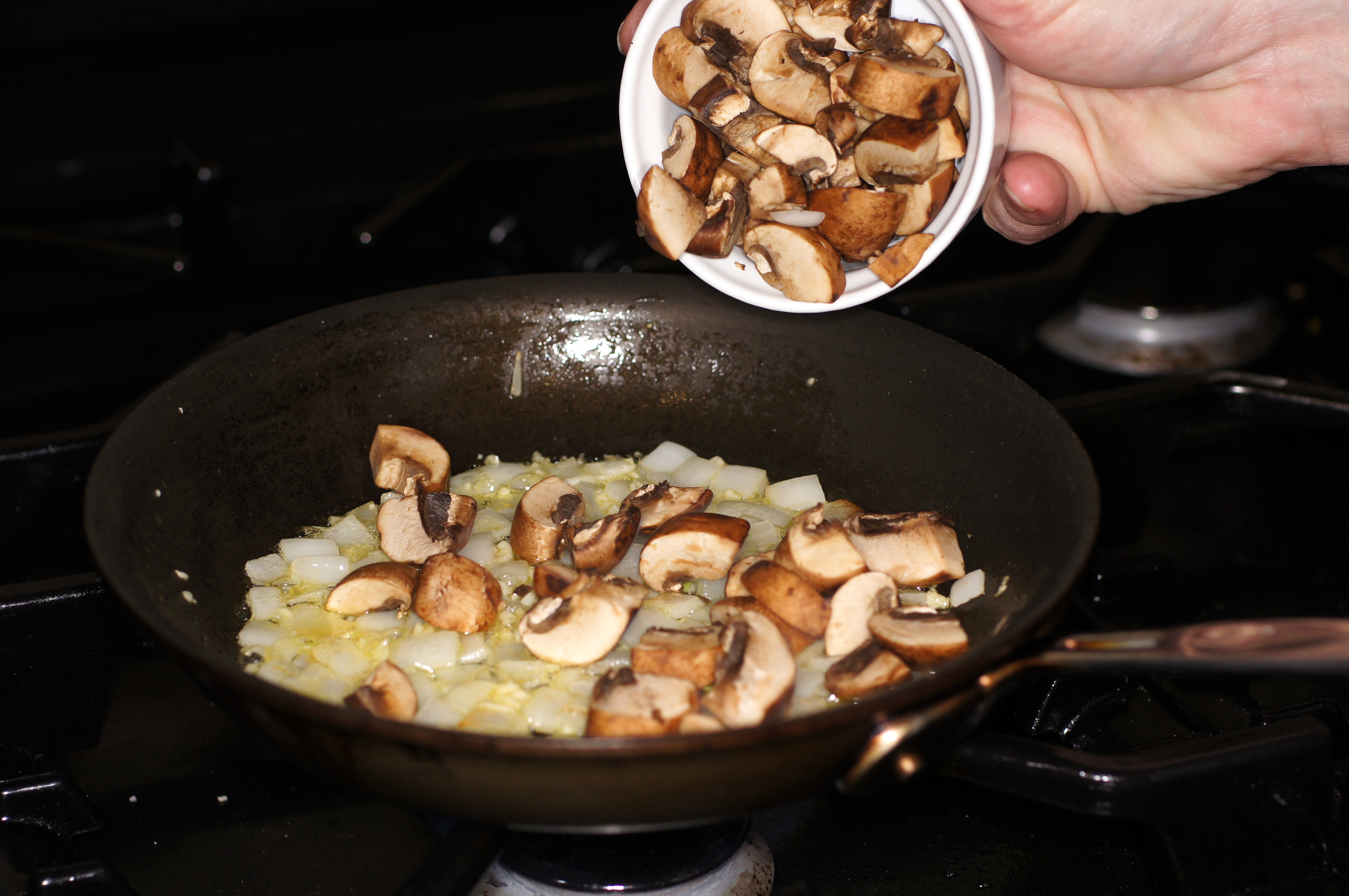Cook over medium-high heat until onions are translucent and the garlic has become aromatic, roughly 2 – 3 minutes. Now add the mushrooms