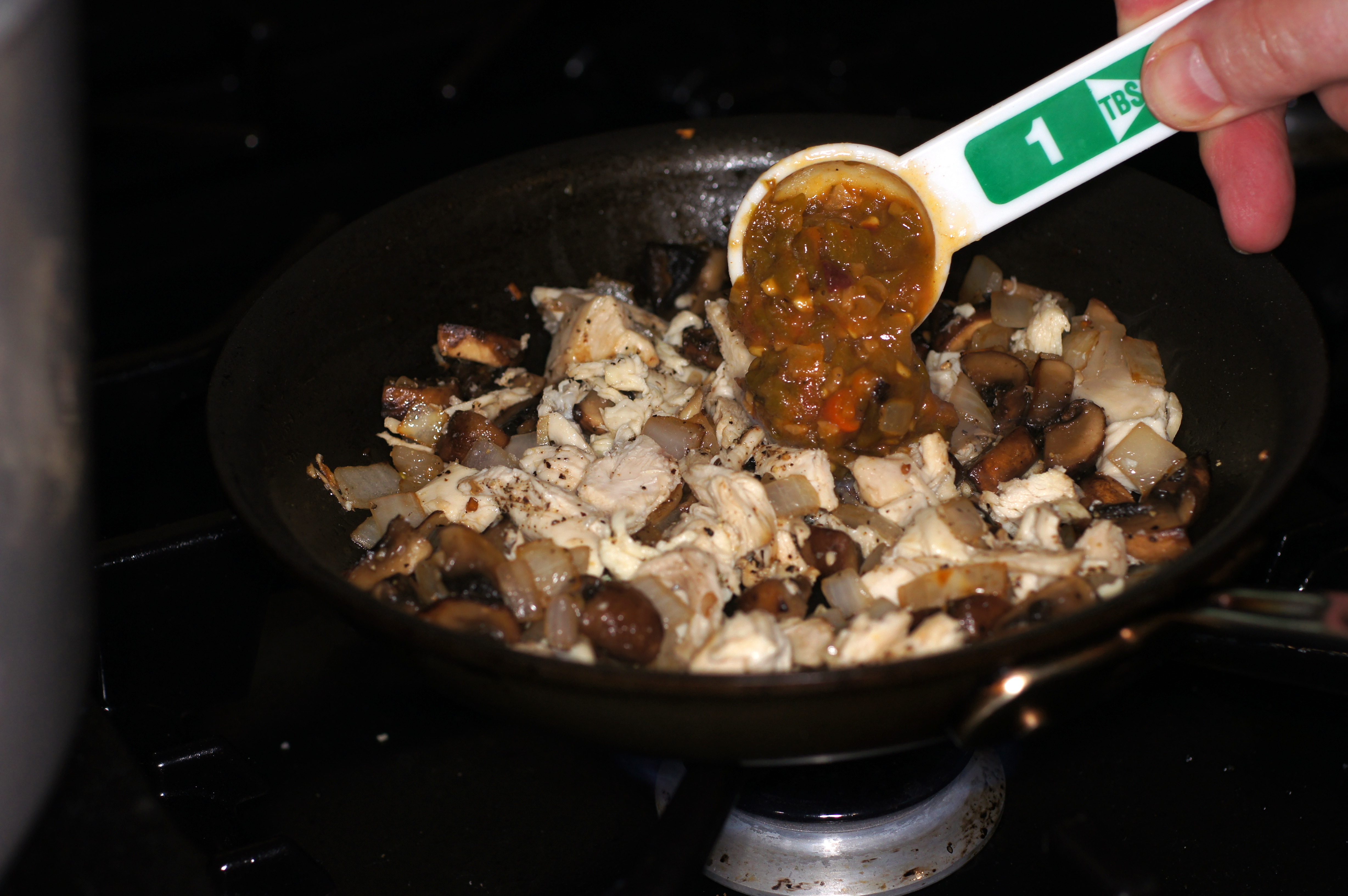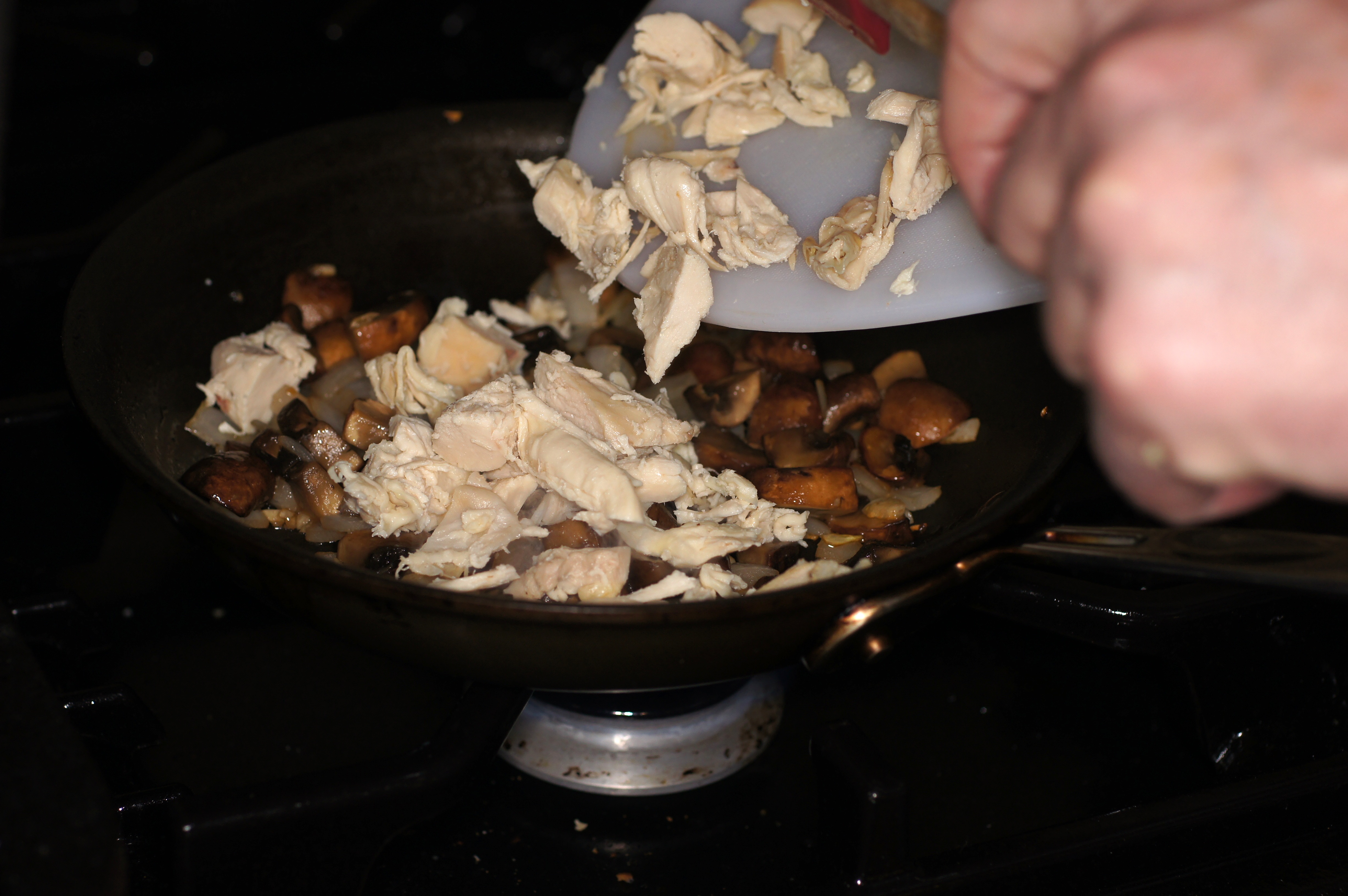 Cook over medium-high heat until the mushrooms have browned, released their liquid and have reduced in volume by 1/2, roughly 2 – 3 minutes. Now add the chicken.