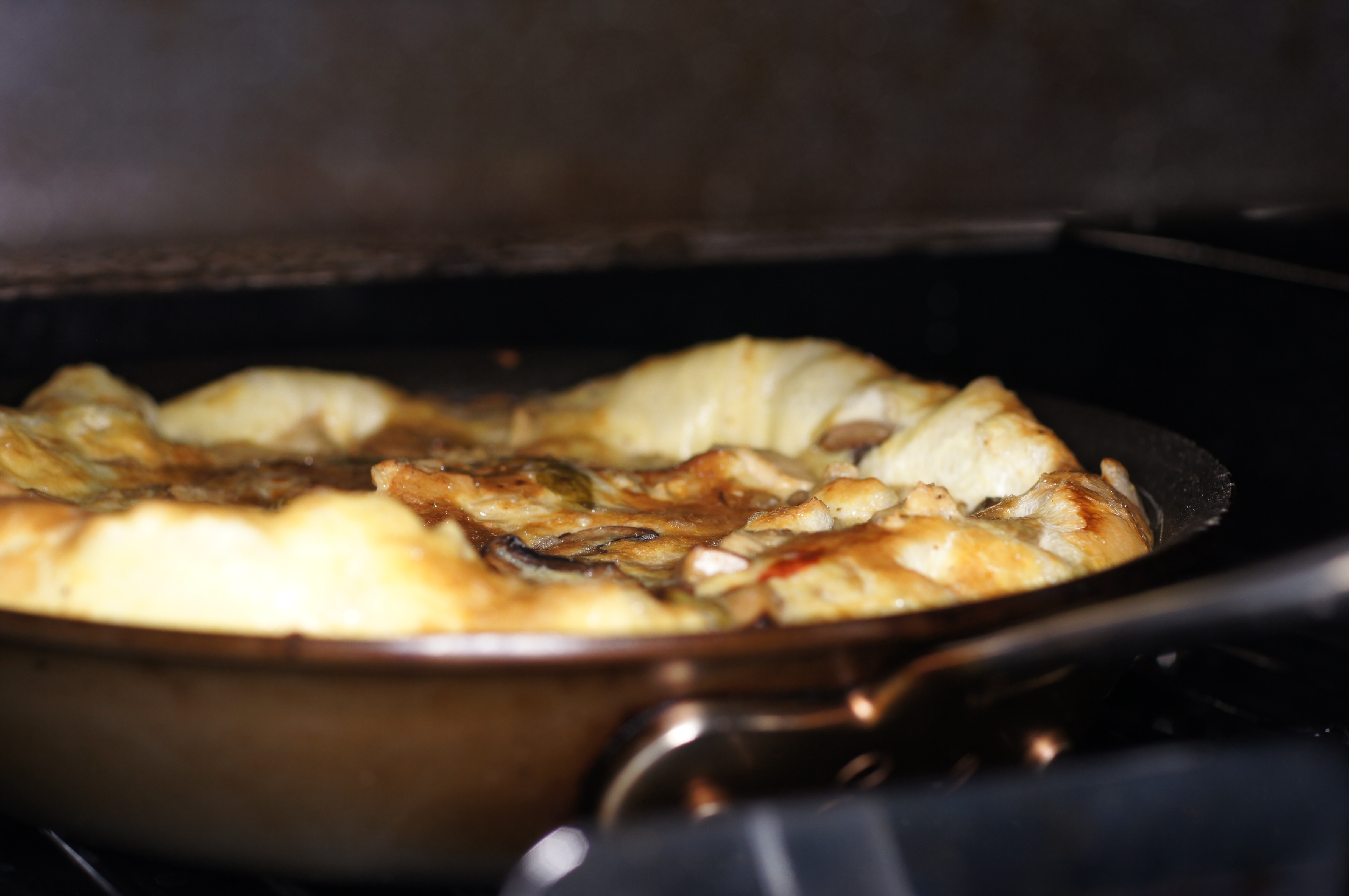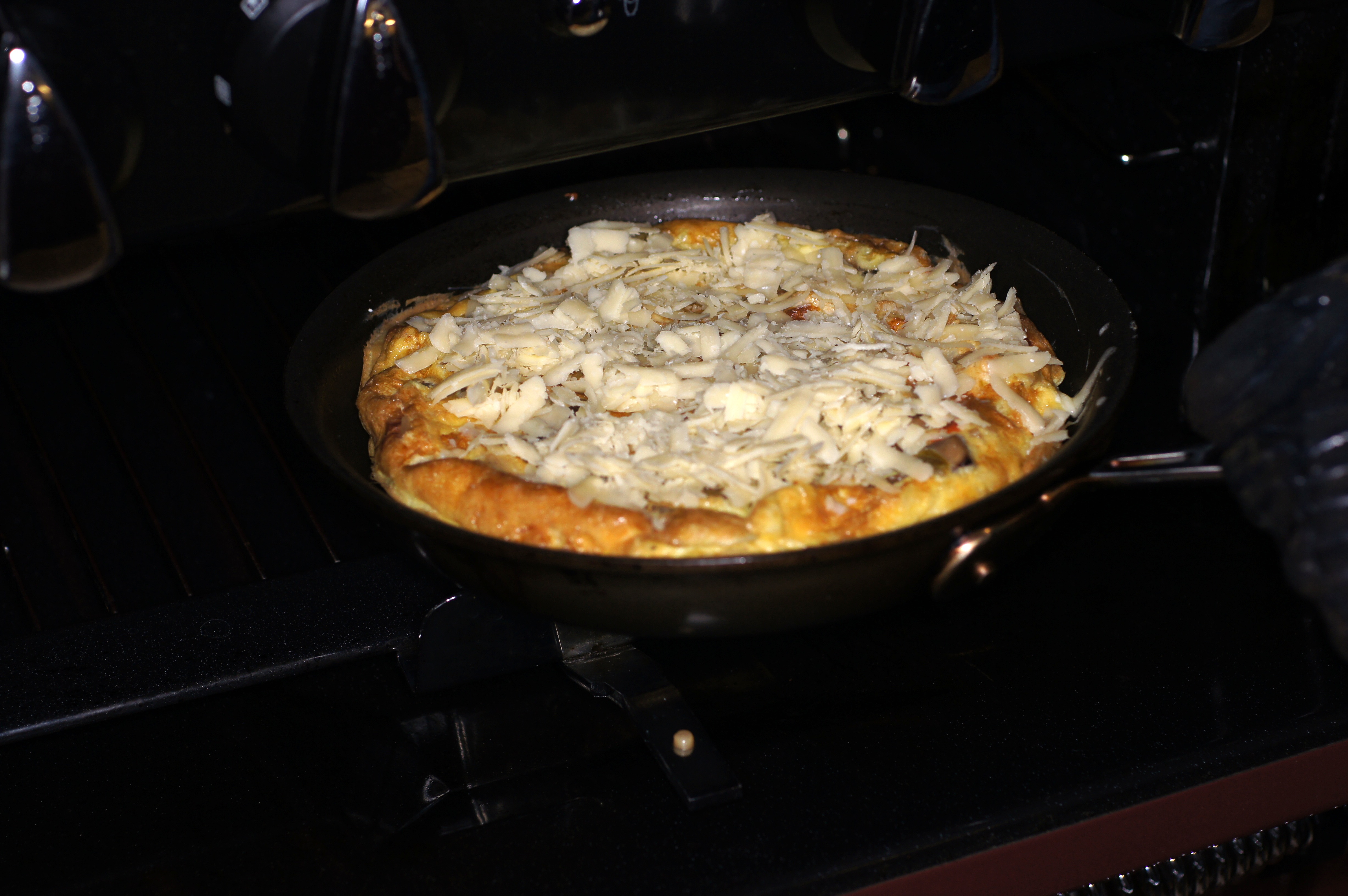 Having cooked the eggs on the bottom and developed bulk it’s time to cook the eggs from the top. This enables the eggs to now rise and form an airy, eggy treat. Look how much the eggs rise under the broiler.