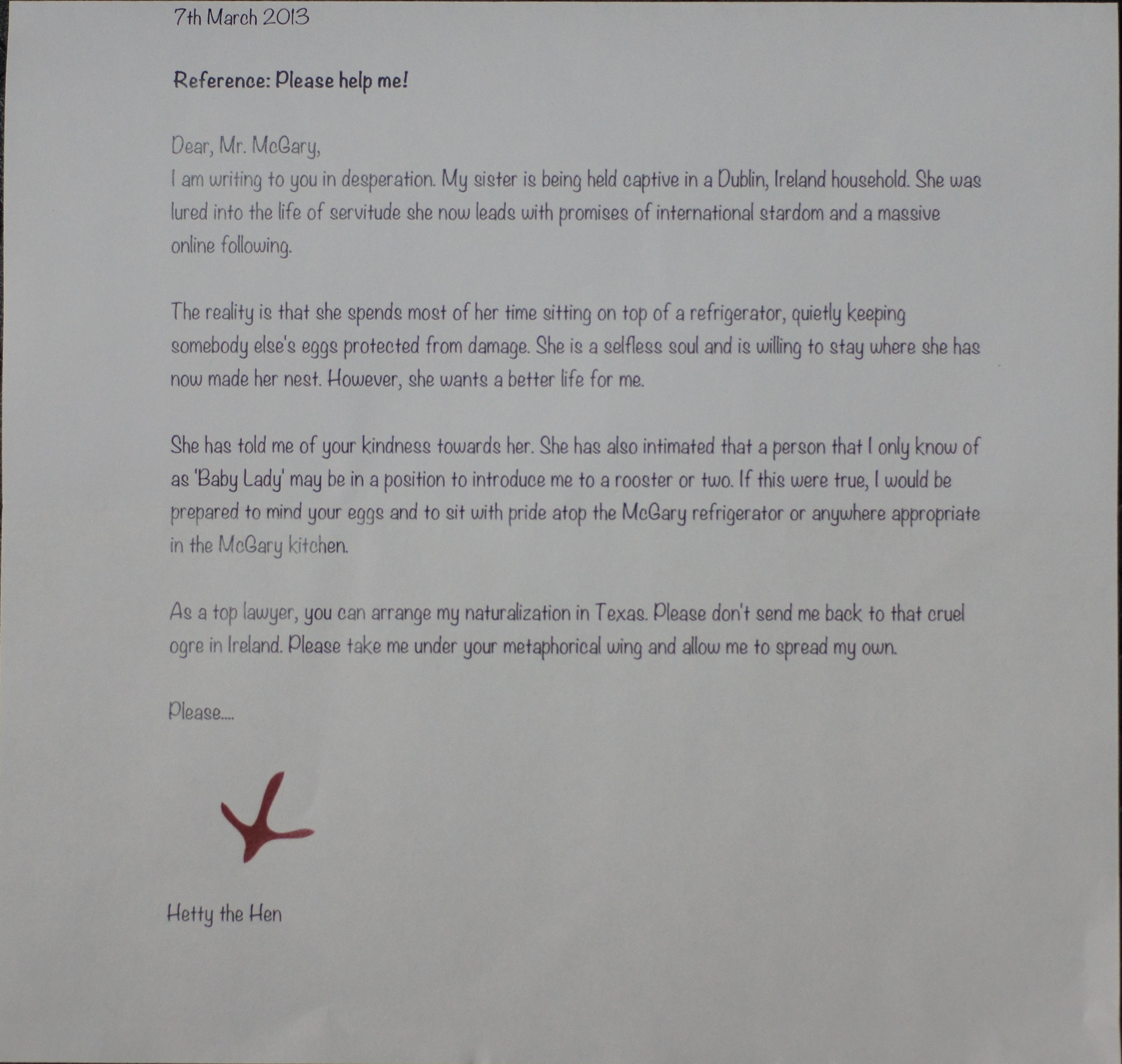 Now, in 1999, Texas became the first state to pass a Baby Safe Haven law. Under the safe haven law, someone who has a child under 60 days old that they do not want can take the child to an EMS provider and drop the child off, no questions asked. The EMS will notify the Department of Protective and Regulatory Services who will immediately take possession of the child and place the child for adoption. Nothing about the safe haven law deals with Irish hens or law offices! Imagine my surprise to find a forlorn, lonely hen seeking adoption in the US. Also, having only recently becoming empty nesters, I was startled to see I would now be responsible for another being, replete with immigration issues no less! Nevertheless, after calming down from the initial shock and everyone dropping by to see what was the hysterical commotion in my office, being the gullible soul that I am and knowing Baby Lady would love to have a hen in the kitchen, I took Hetty home with me where she currently resides. Baby Lady adores Hetty and treats her as one of her own. Her naturalization is going forward although I am having some difficulty obtaining a temporary work visa because holding eggs atop a refrigerator for some reason doesn’t qualify as a job classification. Go figure. As such, we are in intense negotiations with the Office of Customs and the Department of Immigration and Naturalization Services to assure Hetty’s continued legal status in DFW. It may ruin any political aspirations I may have but we will never relinquish Hetty for deportation back to Dublin. I have been assured not to worry, however, because Hetty take up so little space, is beloved by all and may be entitled to political asylum. In the meantime, Hetty has made herself quite at home and rules the roost with several nice roosters who have been wanting a little female companionship.