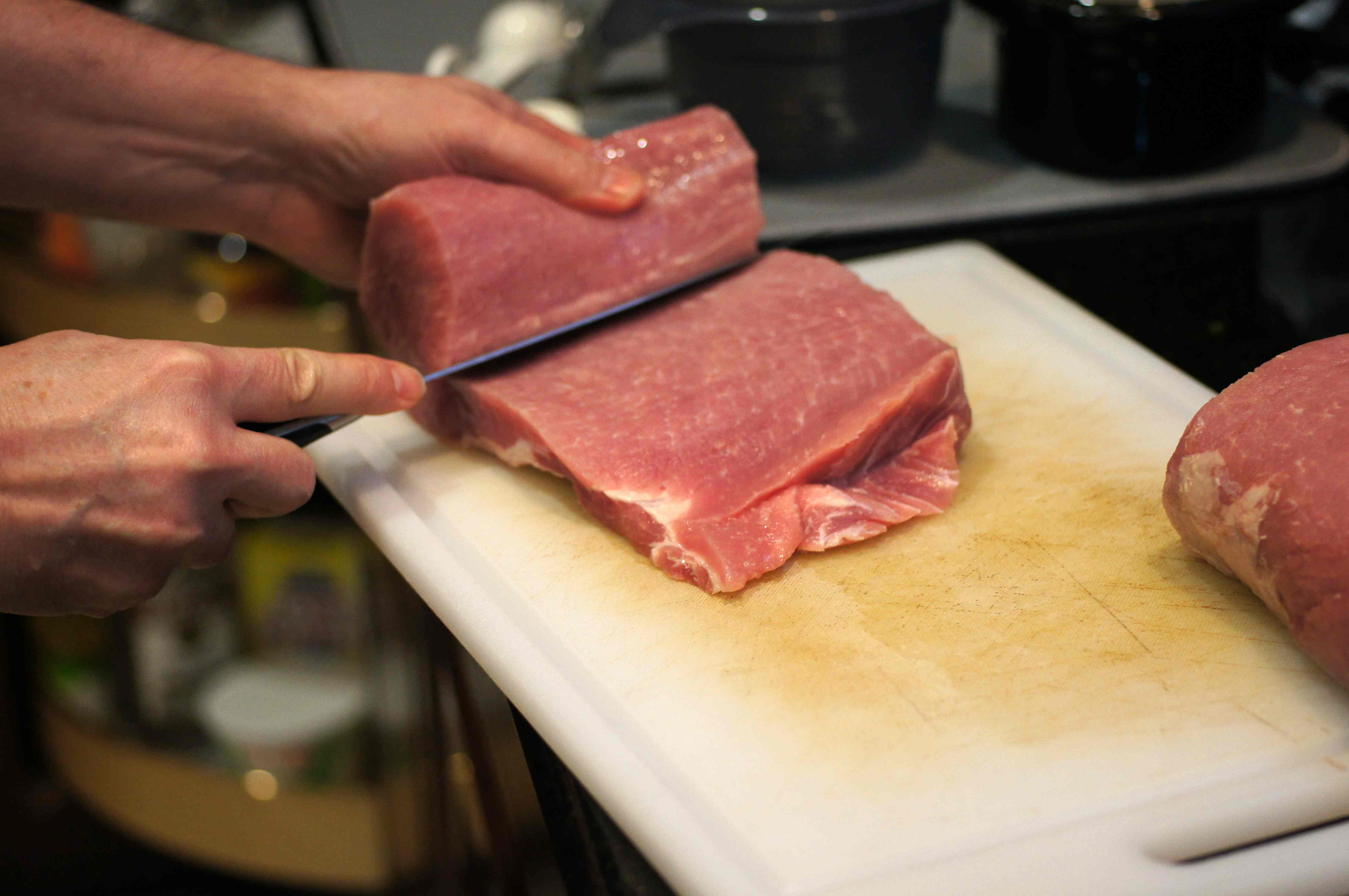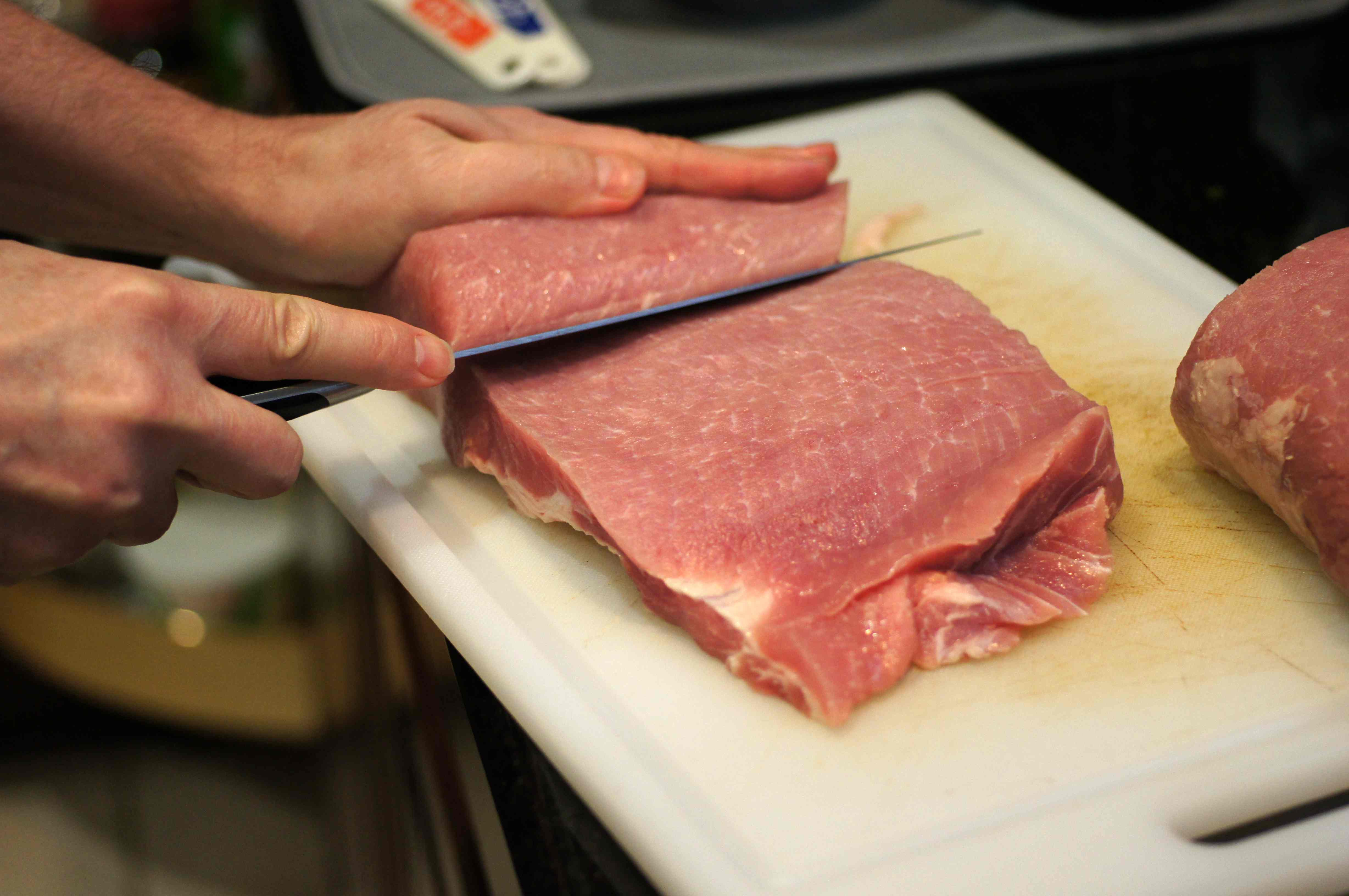 Take the pork loin. Do NOT trim it as you want what little fat is on the top layer. Using a very sharp knife, slice the pork loin, rolling it as you go. You want the pork loin to roll out flat, roughly 1/2 inch thick.