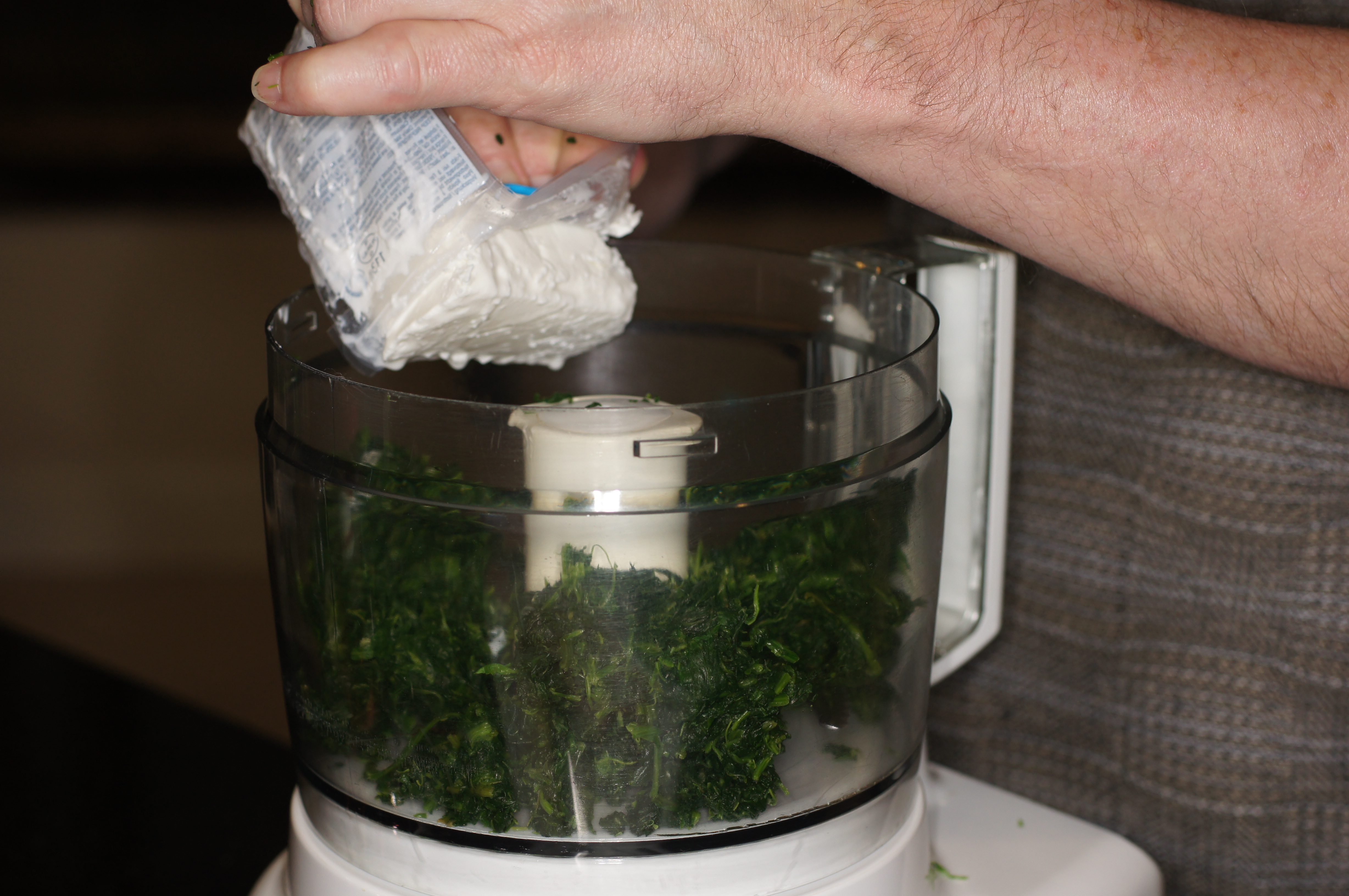 First, make the filling. Place the spinach into the food processor and add the goat cheese.