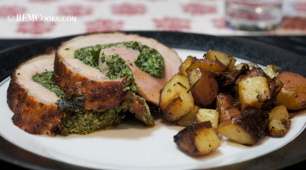 Berbere Seasoned Pork Loin Roulade Stuffed with Spinach & Goat Cheese