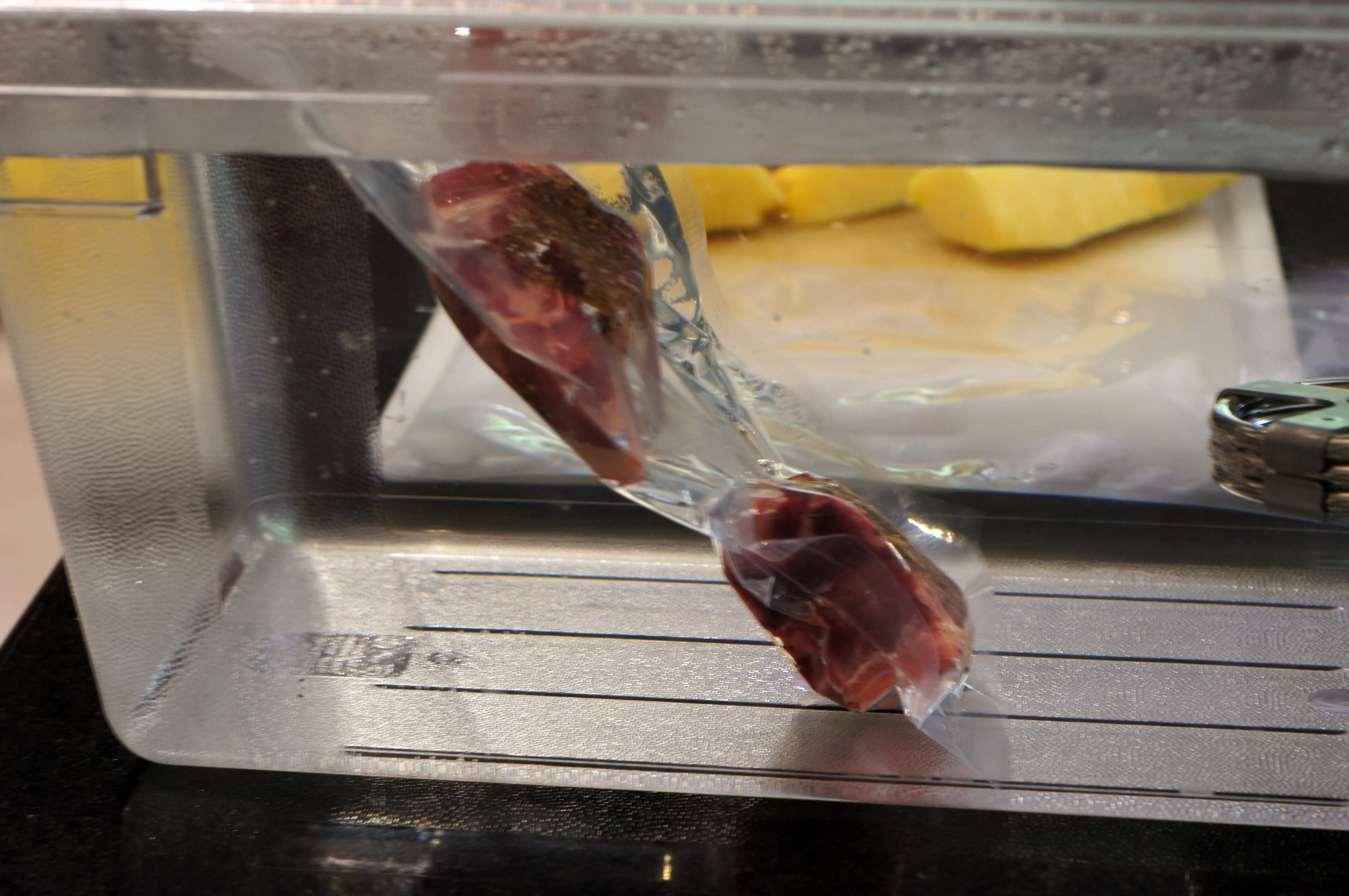 The lack of insulation on the Lexan tub causes the heat to radiate into the surrounding area thereby raising the ambient temperature in the kitchen. It also causes the circulator to work a little harder to hold a steady temperature. The fact that it’s a 12 x 18 tub helps in that regard but you would be surprised how much heat is given off in the surrounding area. I am working on an aesthetically pleasing way to insulate the tub. The clear lexan is nice to shoot photos but there is a give and take. I would prefer less increase of the ambient temperature of the surrounding area; however, it aint happening anytime soon. Hopefully, I will have it figured out by the time we start cranking out 100 F this summer.