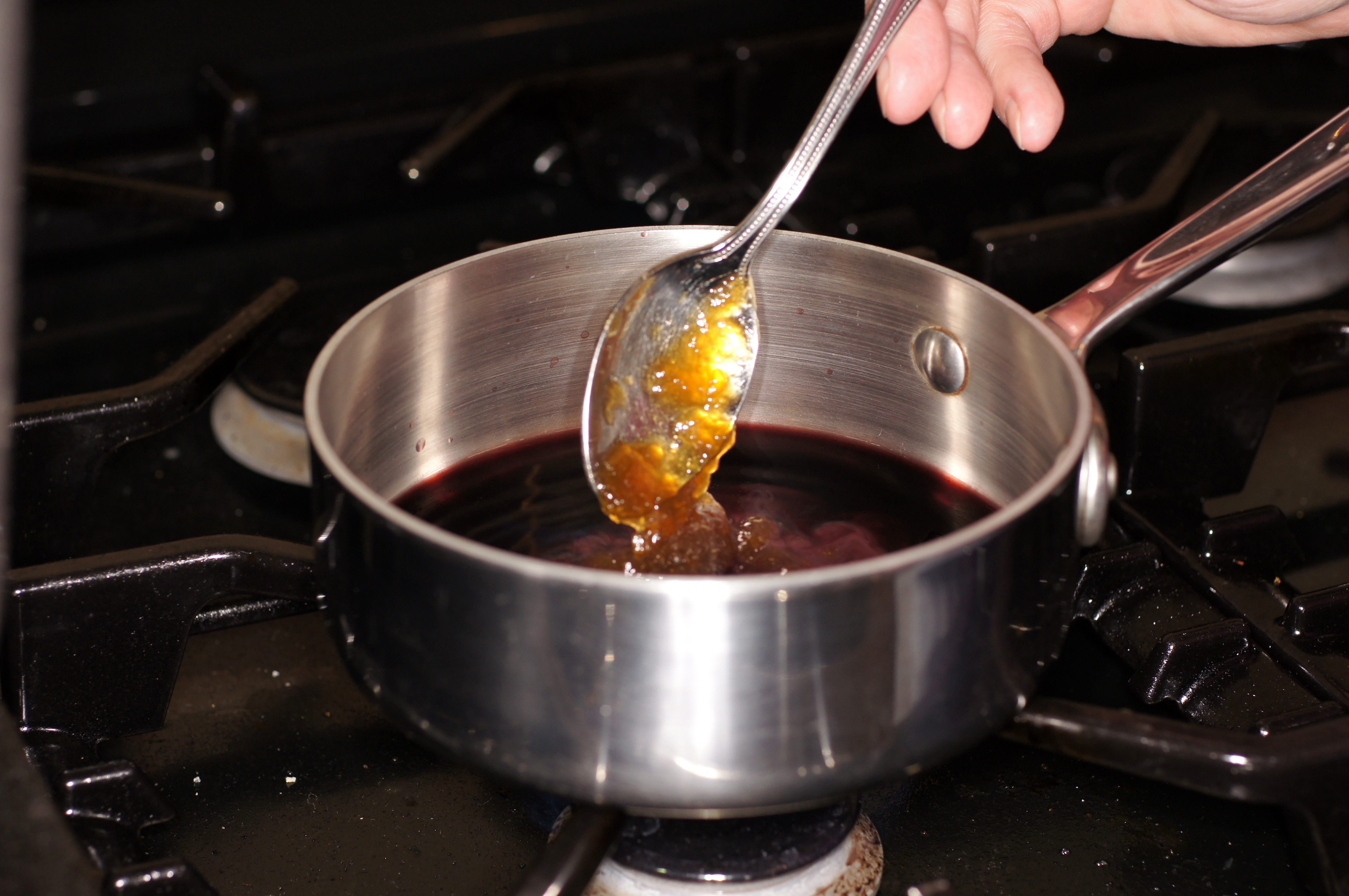 While you are cooking the meat sous vide, you have a lot of time on your hands. So, once you put the lamb into the water, pour 1/2 cup of good dry red wine into a saucepan.