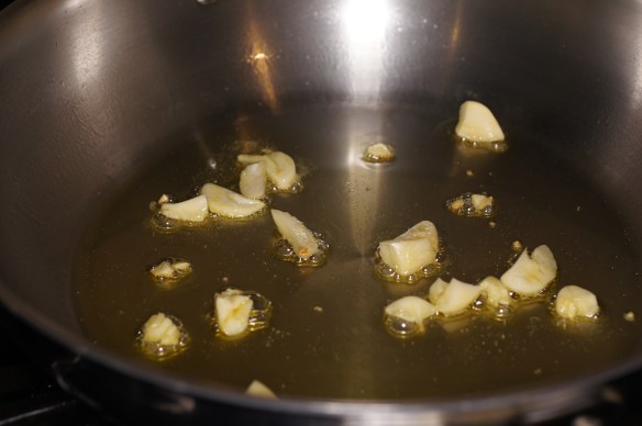 Meanwhile, in a large skillet, heat remaining 2 tablespoons olive oil over medium-high heat. Add smashed garlic and sauté until just golden, about 1 to 2 minutes.