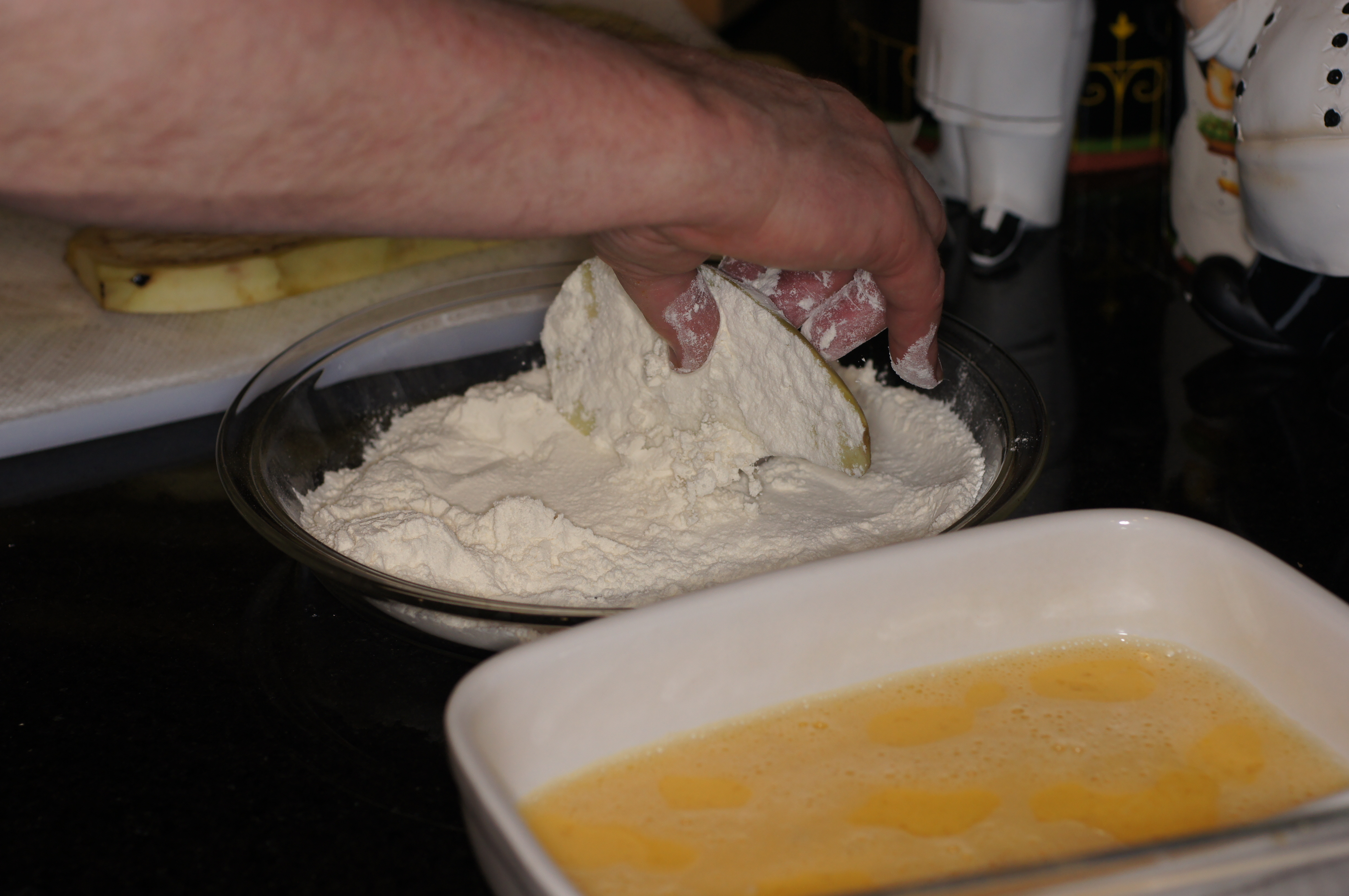 Set up your assembly line. Dredge the eggplant slices in flour