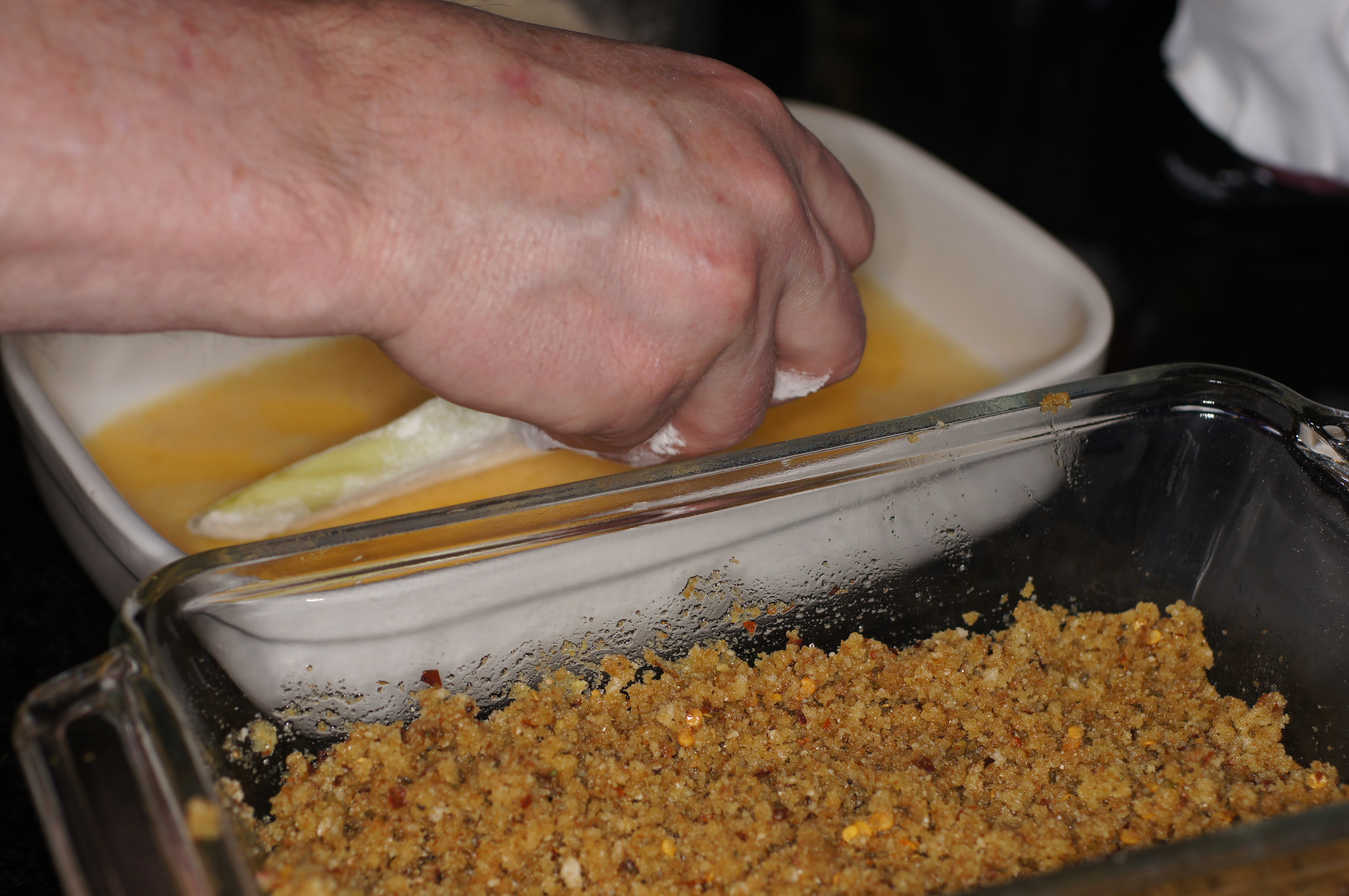 In a large vessel, toss together the breadcrumbs, panko and olive oil. Mix together.