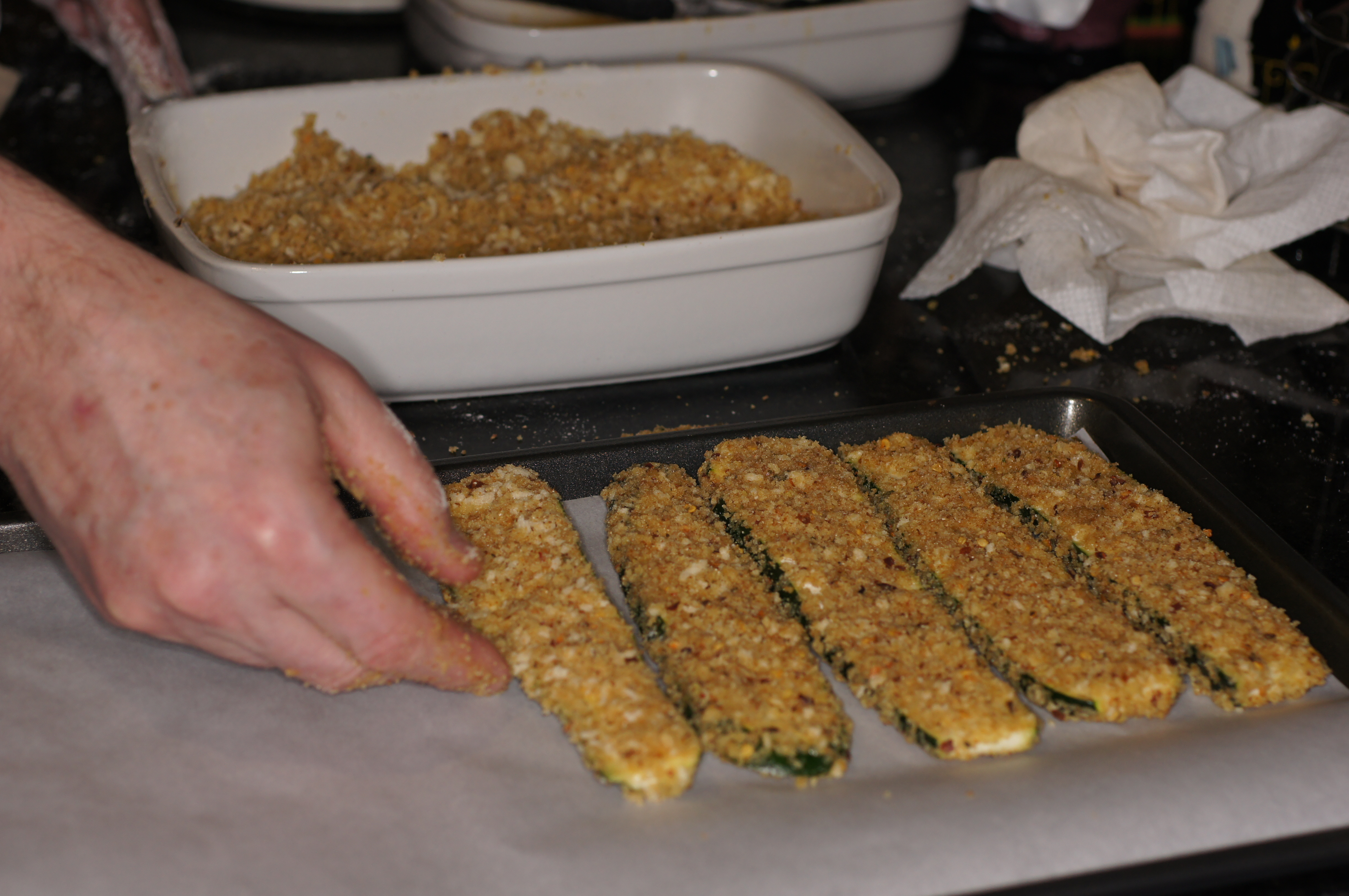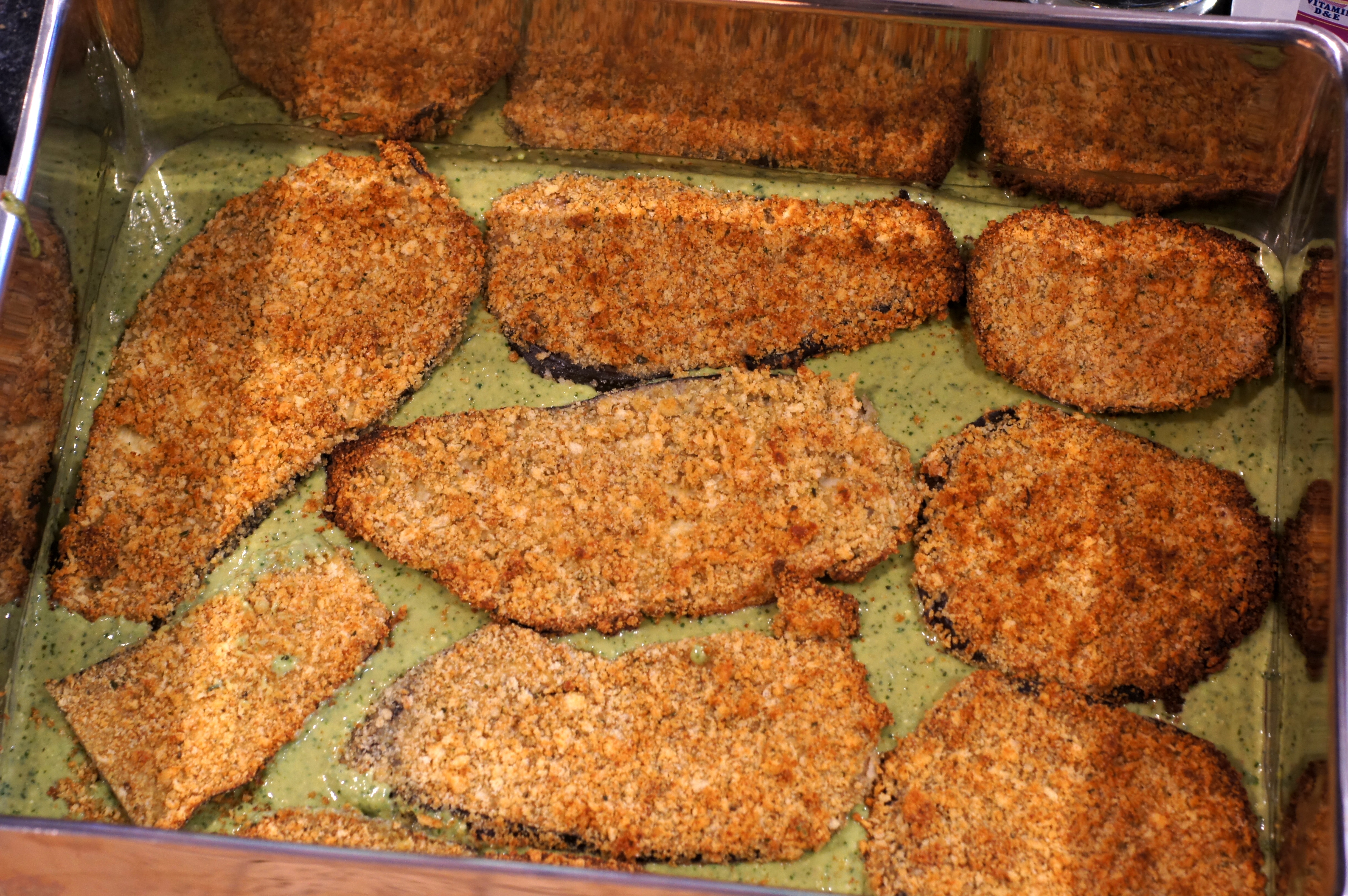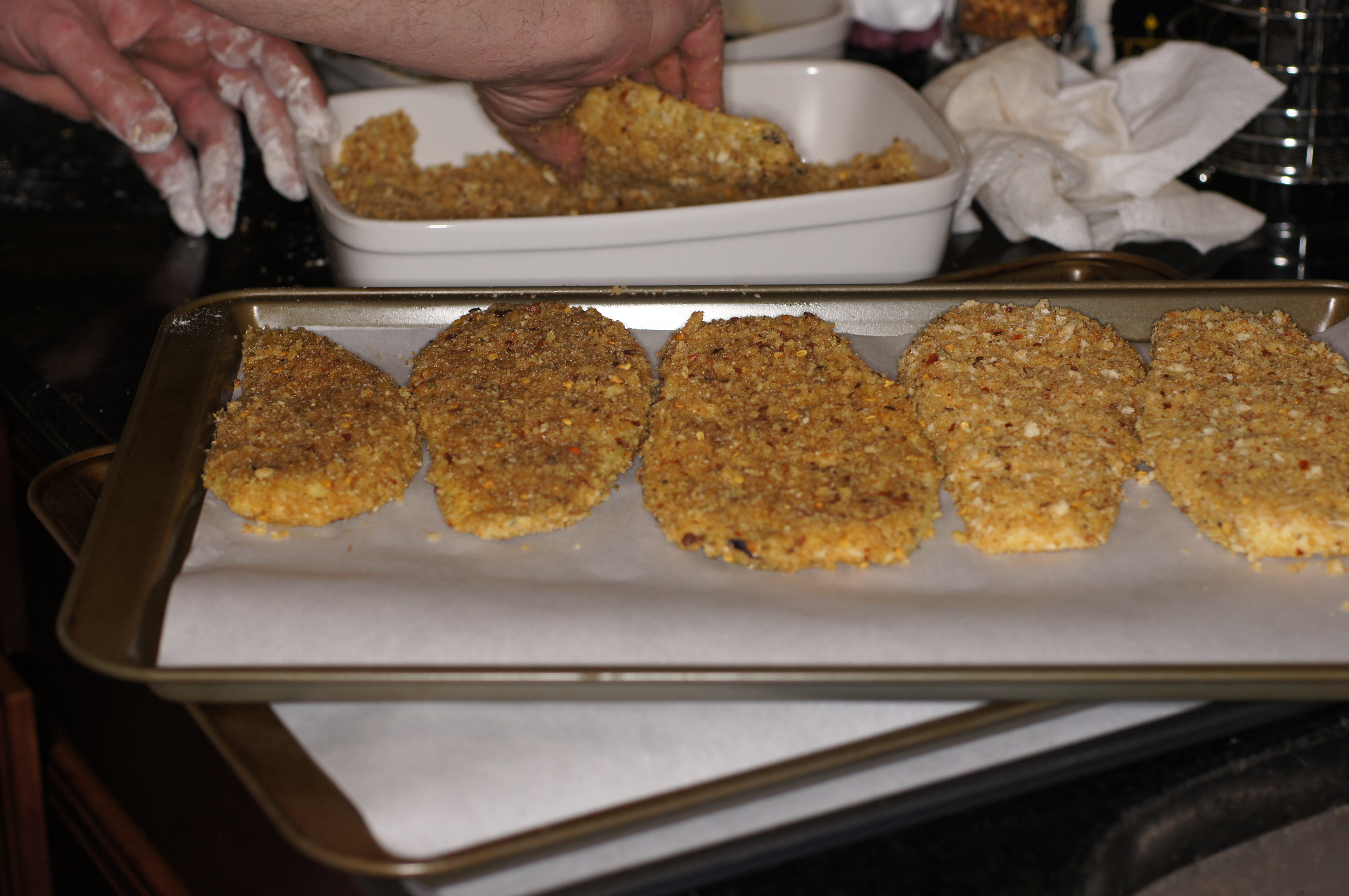 Gently shake the excess breadcrumbs off the zucchini and lay the eggplant slices on parchment lined sheet pans, without touching.