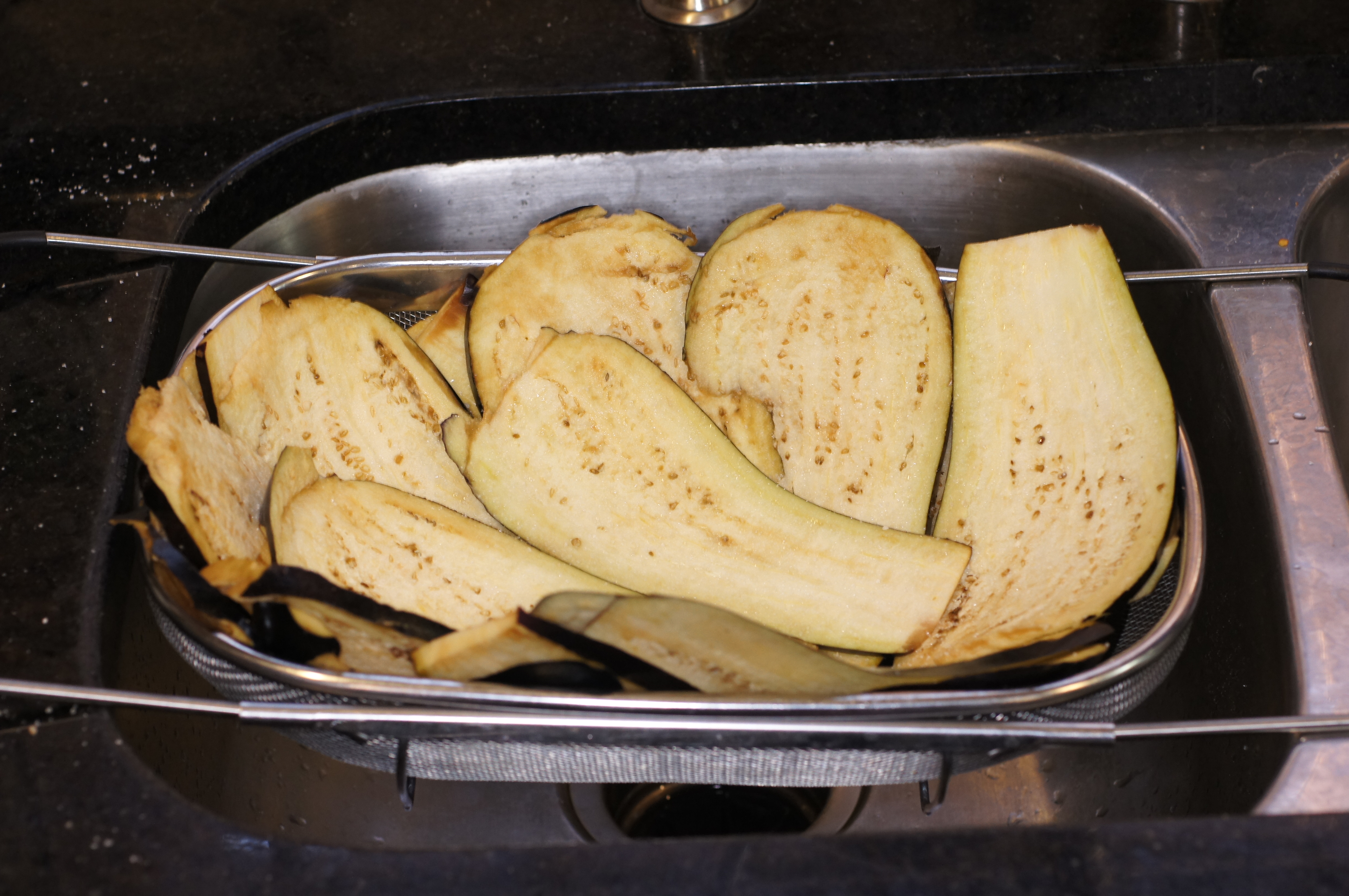 Lay a plate over the eggplant and weight the top with cans to help press out excess liquid. Let drain about ½ hour, then rinse and pat dry.
