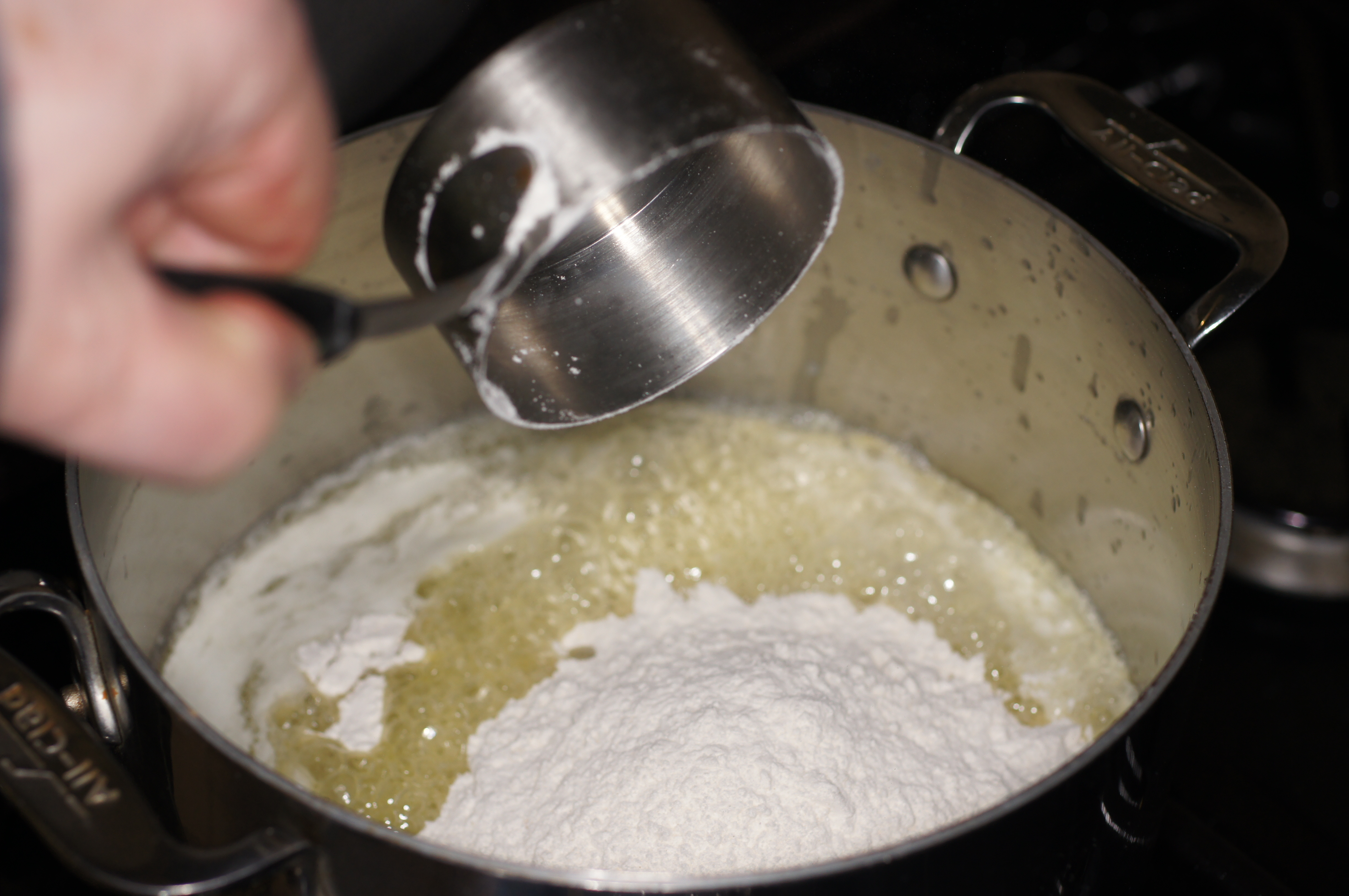 Increase heat to medium-high and stirring frequently, cook the liquid until the flour “cooks out” and the sauce thickens. Add the nutmeg.