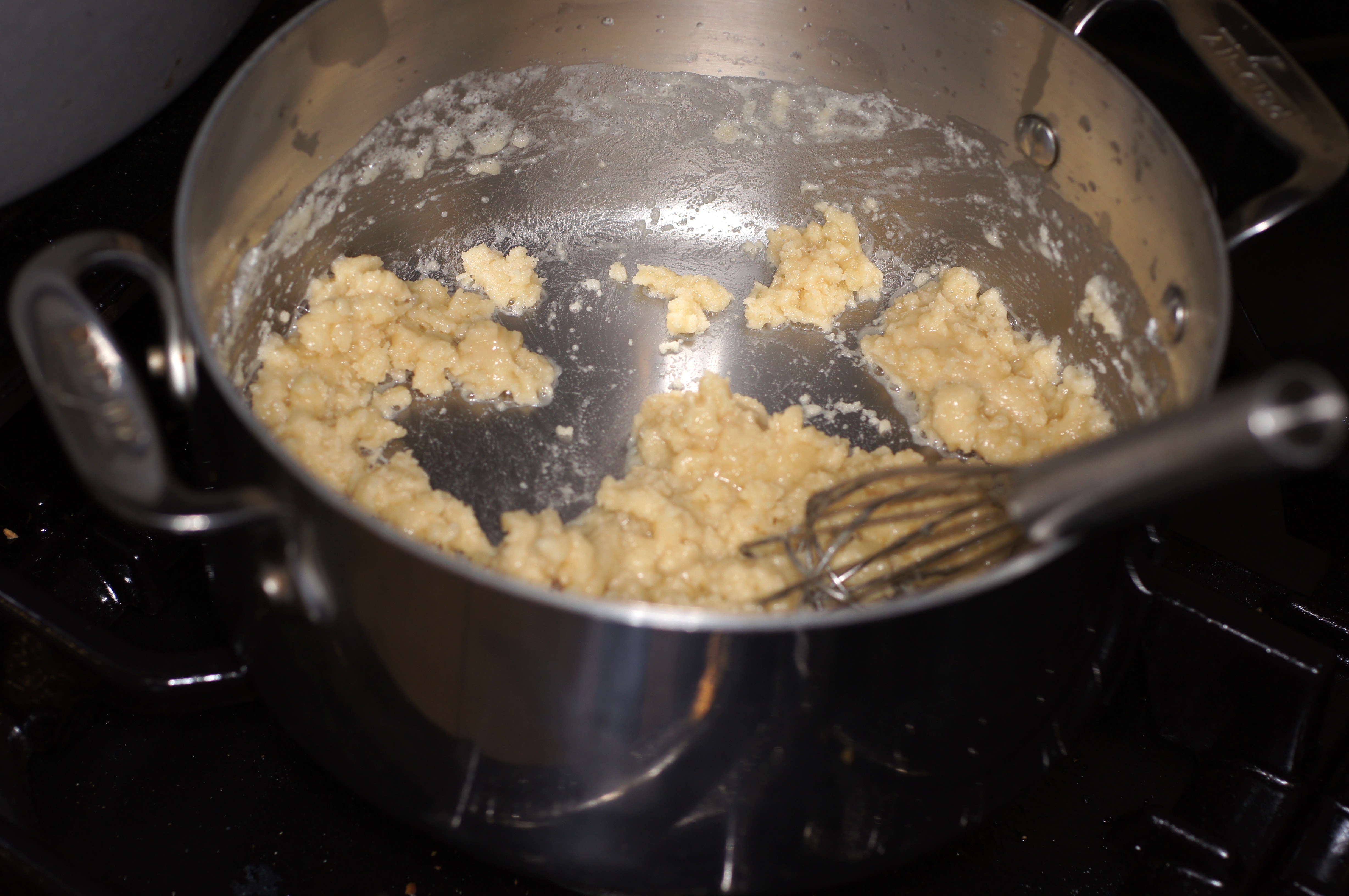 Now, notice the roux is thick as opposed to thin and creamy. This is because there is more flour than butter. Also, inasmuch as it is not clarified butter, the milk solids are absorbed into the flour. Because this dish is going to have a lot of oil and fats from the pesto, milk and cheese, you simply don’t need as much butter in the roux and a thicker roux won’t alter the taste or mouthfeel.