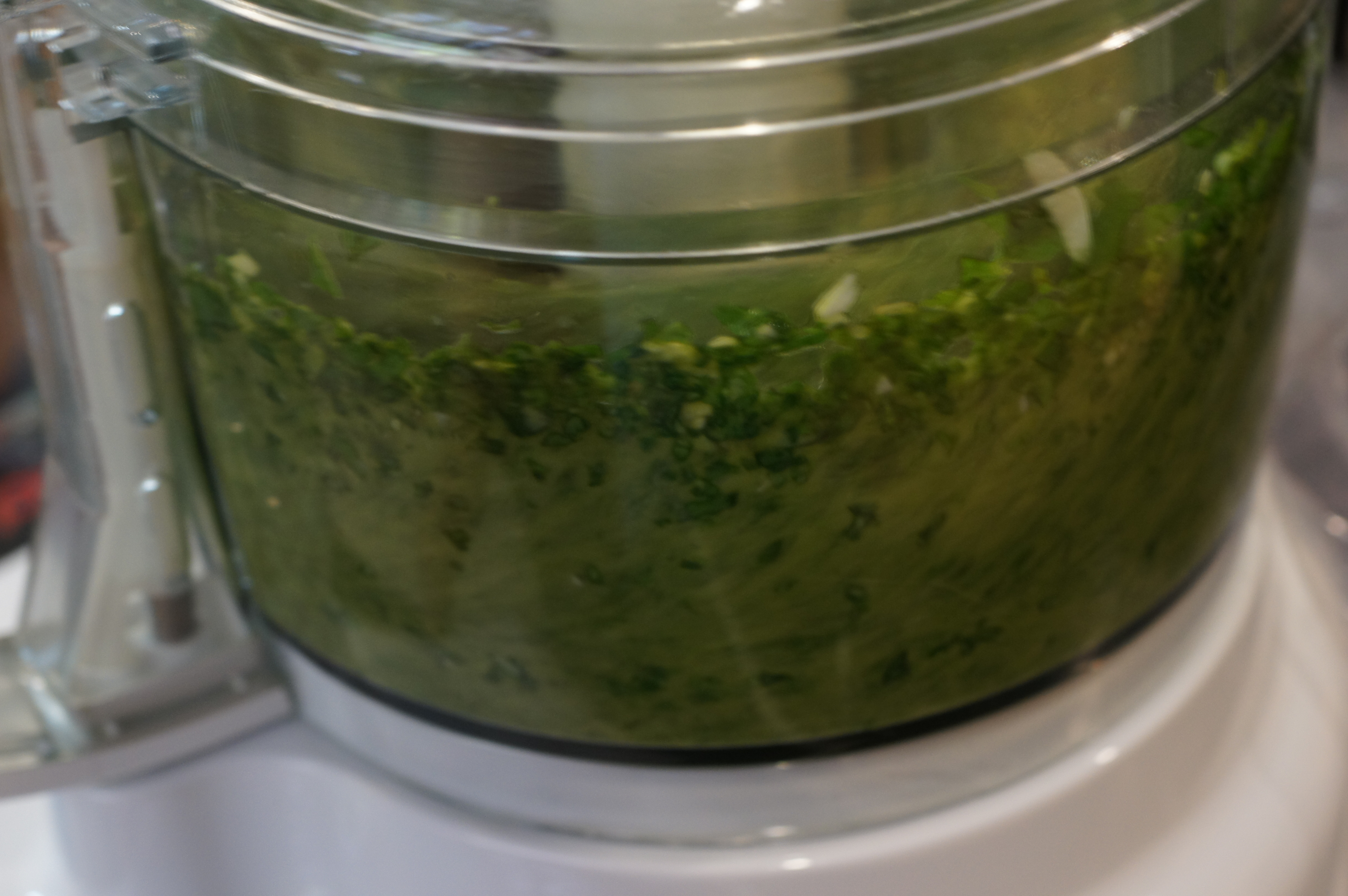 Because this makes a lot of pesto, I processed it in stages. So, add the garlic, basil, salt and olive oil to the food processor.