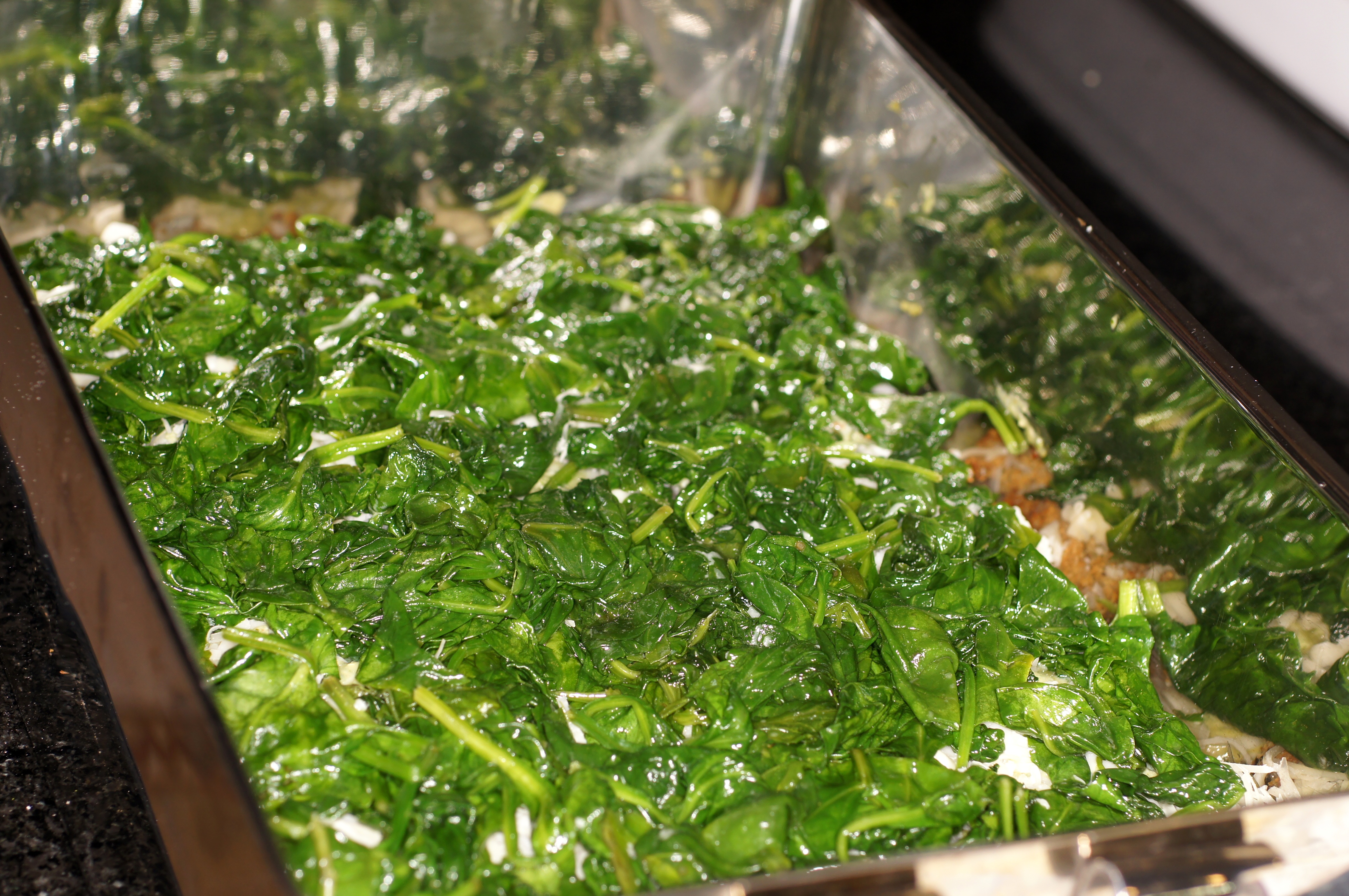 Repeat with another layer of eggplant, sauce and cheese then add the spinach.