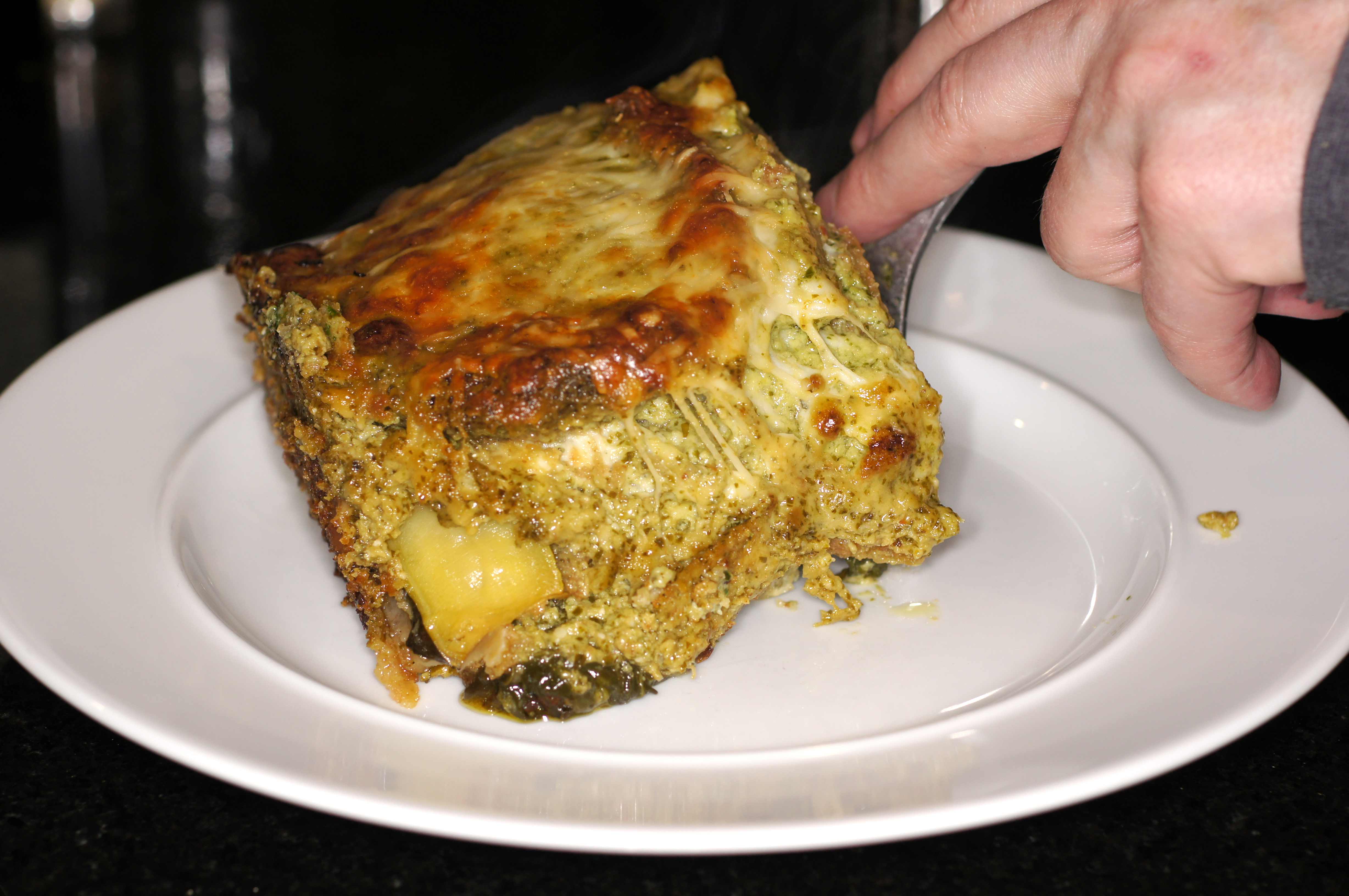 This dish is so good, it’s hard to put into words. It’s rich and unctuous, with an umami character and beautiful aroma that is filling and soul satisfying. Because of its richness, sliced fresh tomatoes with a little salt and pepper forms the perfect foil for this dish. Although it takes a while to prepare, you can make the pesto béchamel sauce a day in advance. Put in tightly sealed storage containers and refrigerate. Now, mind you this is going to make 12 cups of sauce. So, make sure you have the storage capacity. Another nice thing about this dish is that it refrigerates well and is ideal for entertaining guests. You will be able to feed 12 people with this recipe. Just make sure you have a deep dish lasagna pan. My lasagna pan is 15″ x 11″ x 4 1/4″ and it’s 3/4 full with this recipe. I’ve already told you about the leftovers.