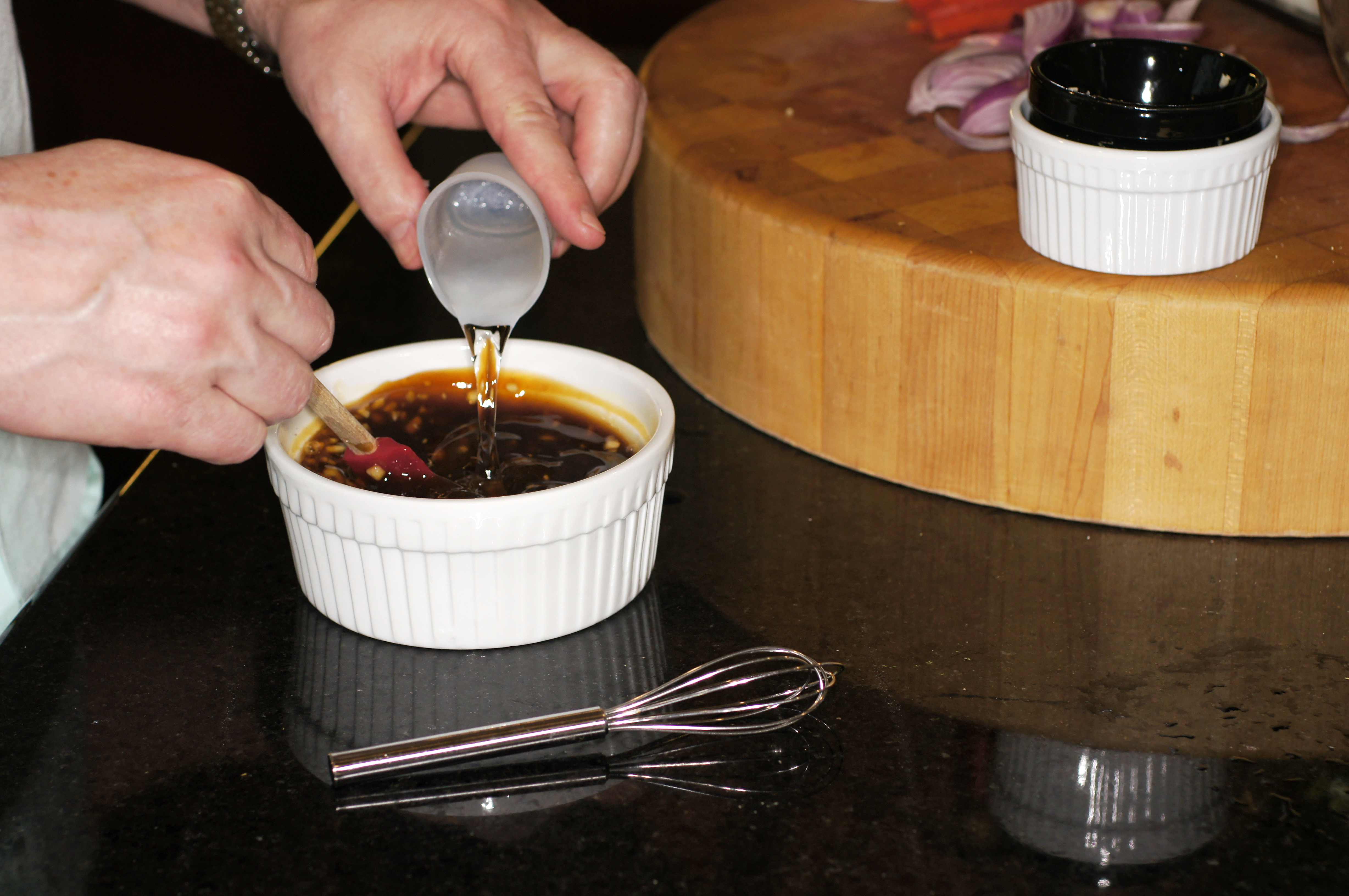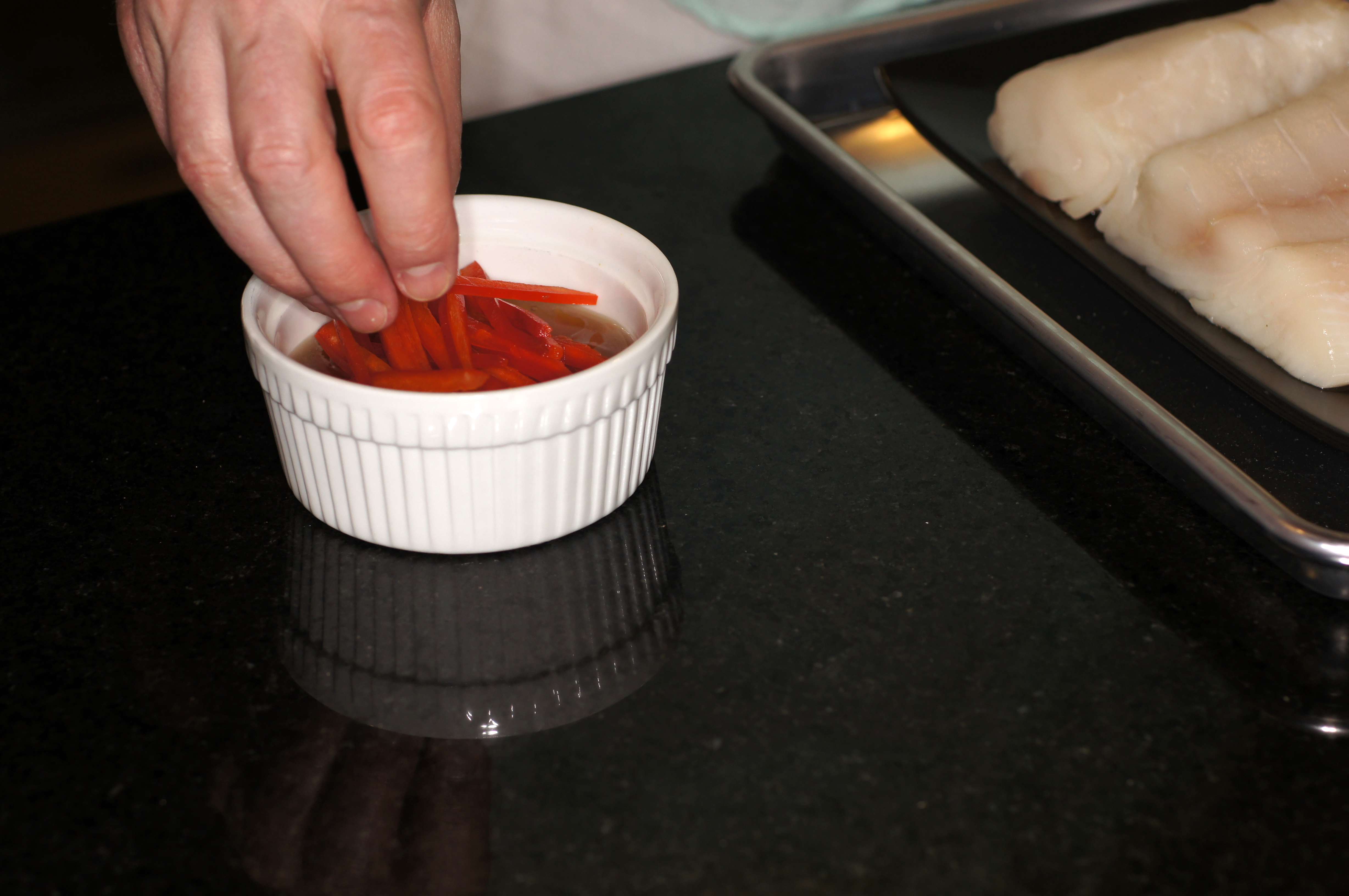 Whisk to incorporate and add the julienned red peppers. Set aside to pickle until ready to serve.