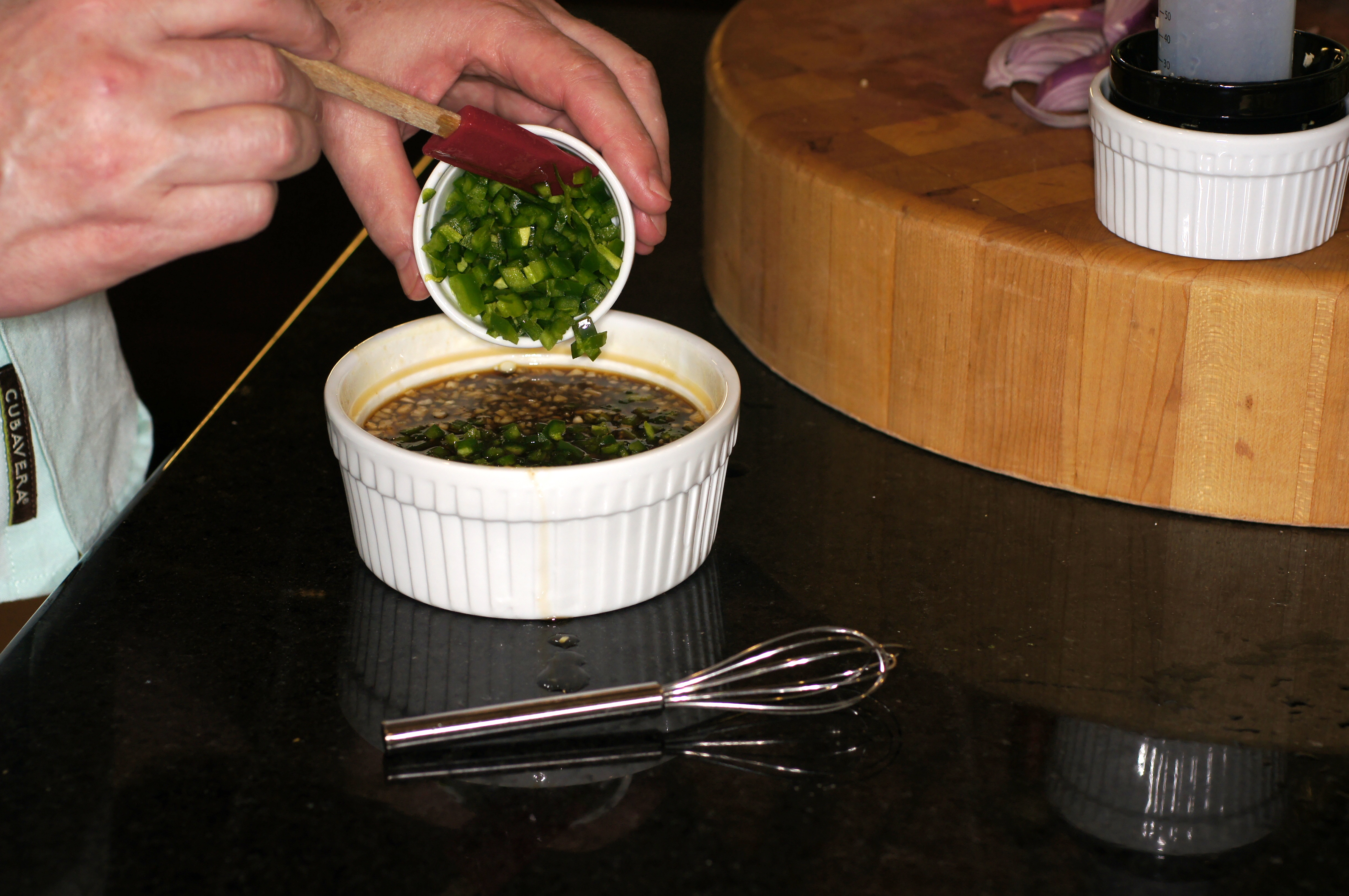 As I have mentioned previously, Baby Lady loves halibut. It’s probably her favorite fish. So, when I was at the market they had just received a batch of fresh, wild Alaskan halibut. As such, I had to buy it. Once I bought it I had to decide what to do with it. The garden swiss chard is doing beautifully given the nice, cool climate we have been having. Ergo, swiss chard had to be included in the meal. Still, I had yet to figure out how to prepare the dinner. It was beautiful outside. In fact, it was clear, beautiful blue skies, 83 F and a perfect grilling day. Also, halibut is such a mild fish and I didn’t want anything overpowering. I then remembered that beautiful Grilled Swordfish with Orange Ginger Swiss Chard we had prepared last June and it got me to thinking along those lines. Instead of orange, however, I wanted more of a Thai flavor. So a light Thai based sauce was in order. Now, in making a Thai dipping sauce, in essence what this is, you must bear in mind Thai dipping sauce recipes include savory, sweet, salty and spicy notes. The base is usually soy sauce, fish sauce, rice vinegar or a combination of them. Herbs, spices and seasonings are the next thing you need to consider. Traditional Thai dipping sauce recipes may contain lemongrass, ginger, garlic, chives, and hot pepper flakes. A sweet sauce might contain ginger, lemongrass, and a sweetener (typically sugar or honey – more often sugar) mixed with rice vinegar and a little soy sauce. A more savory recipe might contain a base of fish sauce and soy sauce mixed with garlic, hot pepper flakes, and chives. Also, while dried or powdered herbs may be used, as with most cooking, fresh ingredients tend to provide an essence of freshness and greater depth of flavor. Remember, however, that fresh herbs ore fully infuse into the liquid the longer they sit. Pick and play to see what you like. It’s what we do. 🙂
