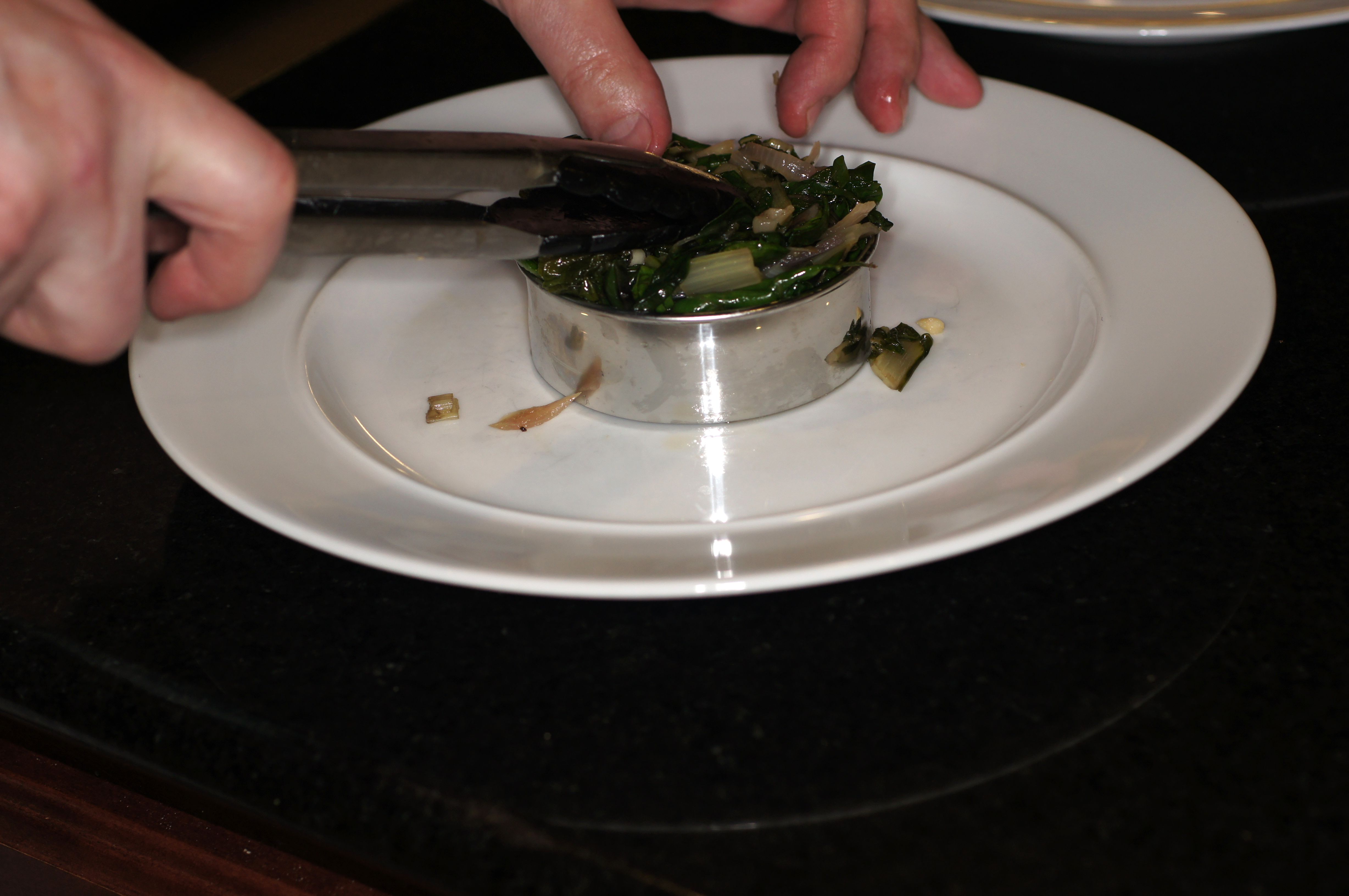 Quickly reheat the swiss chard. Get a ring mold and place a ring of spinach in the center of a plate. Alternatively, place a mound of swiss chard on the plate.