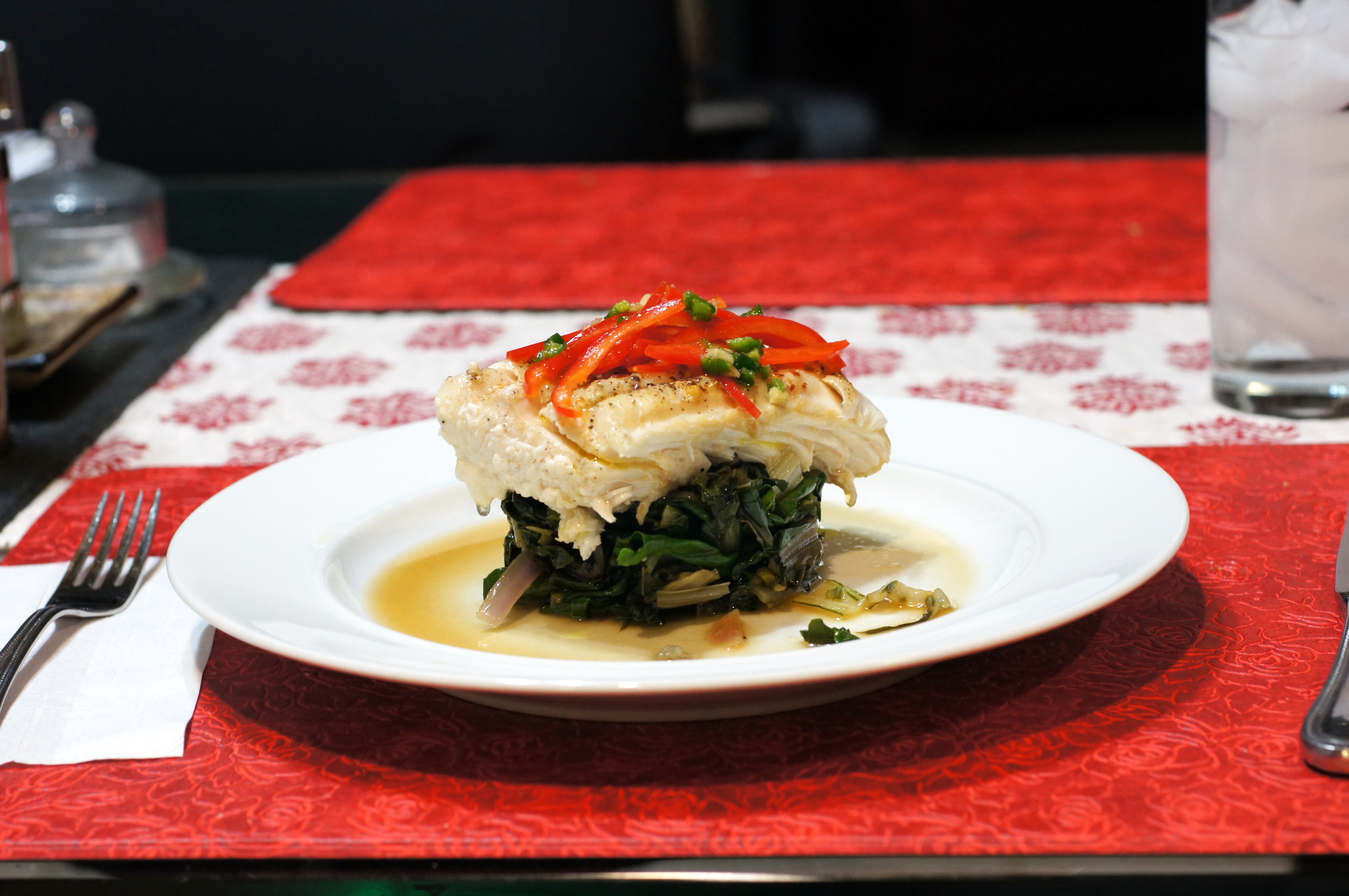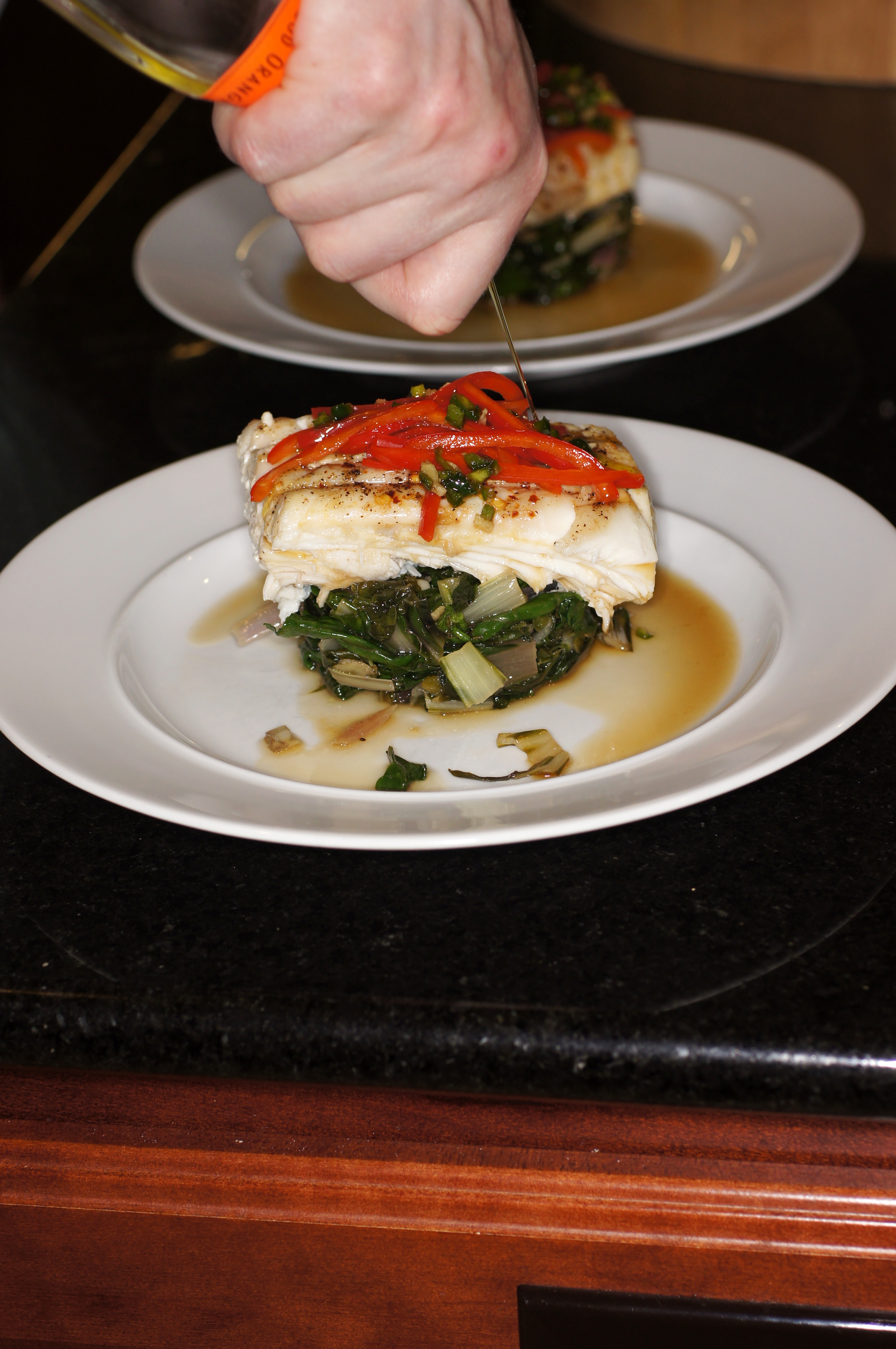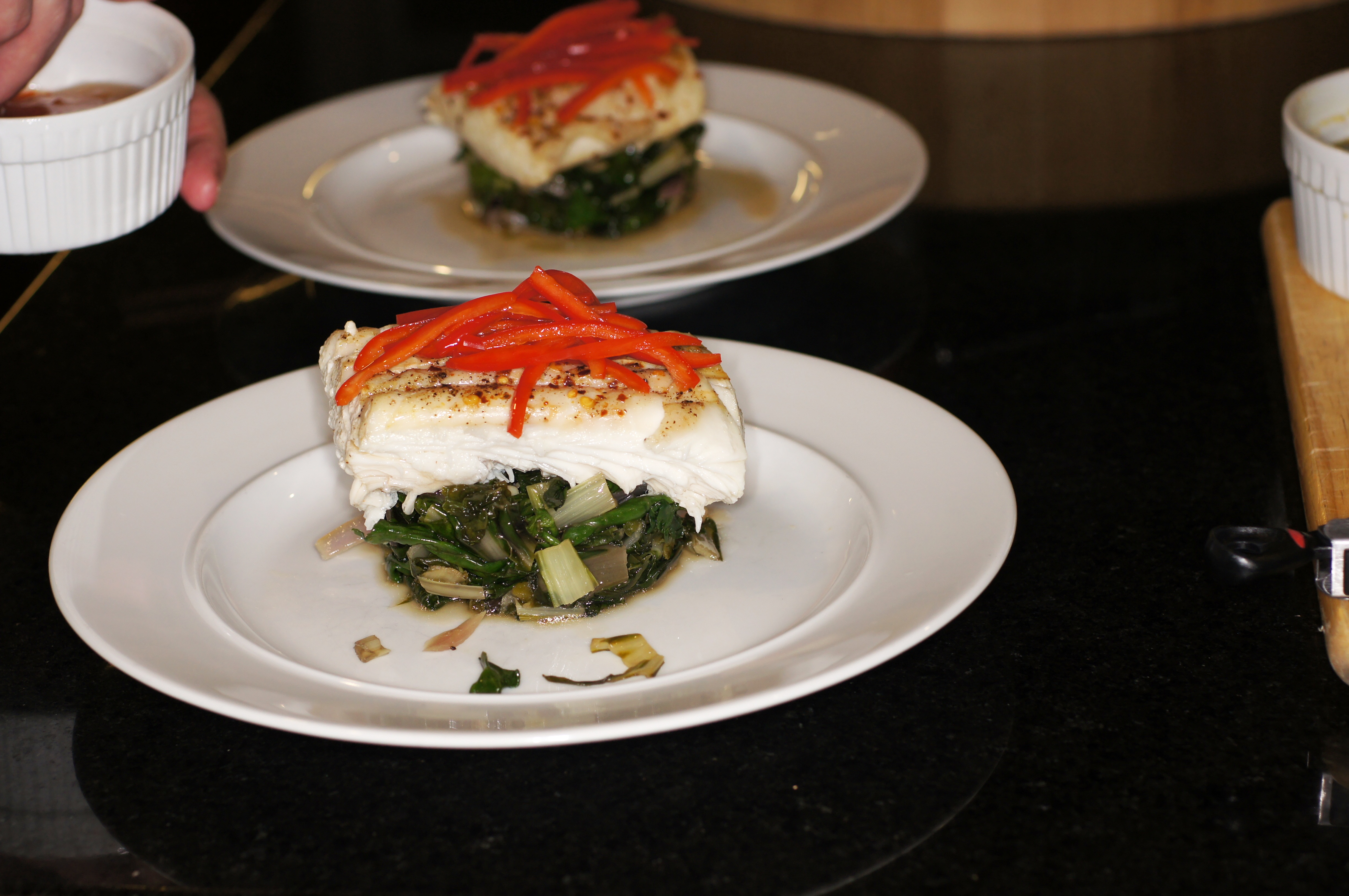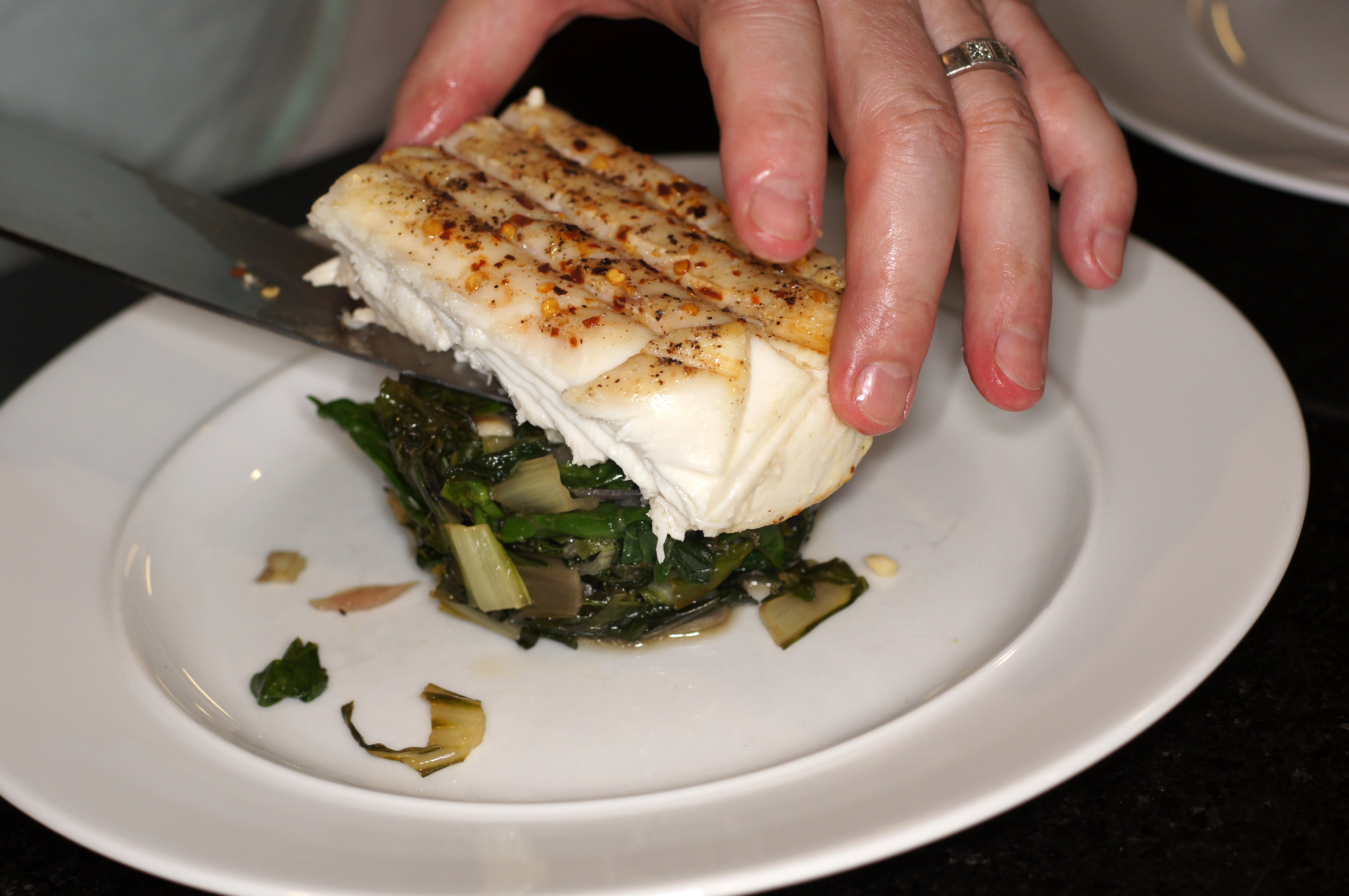 Cut the fish into 3 equal slices. Place a slice of fish on top of the swiss chard.