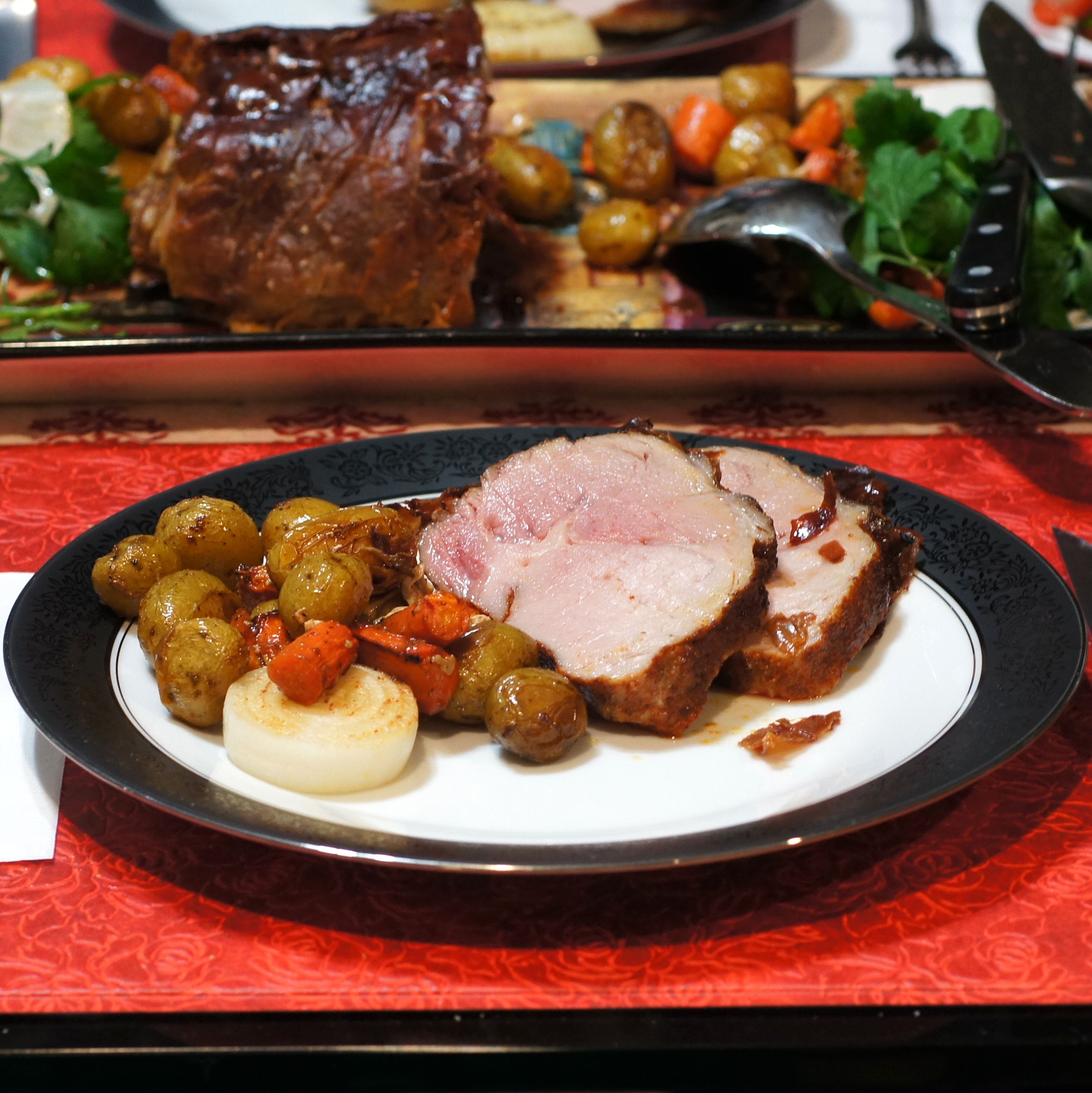 Prosciutto Wrapped, Berbere Seasoned, Roasted Pork Loin with Root Vegetables