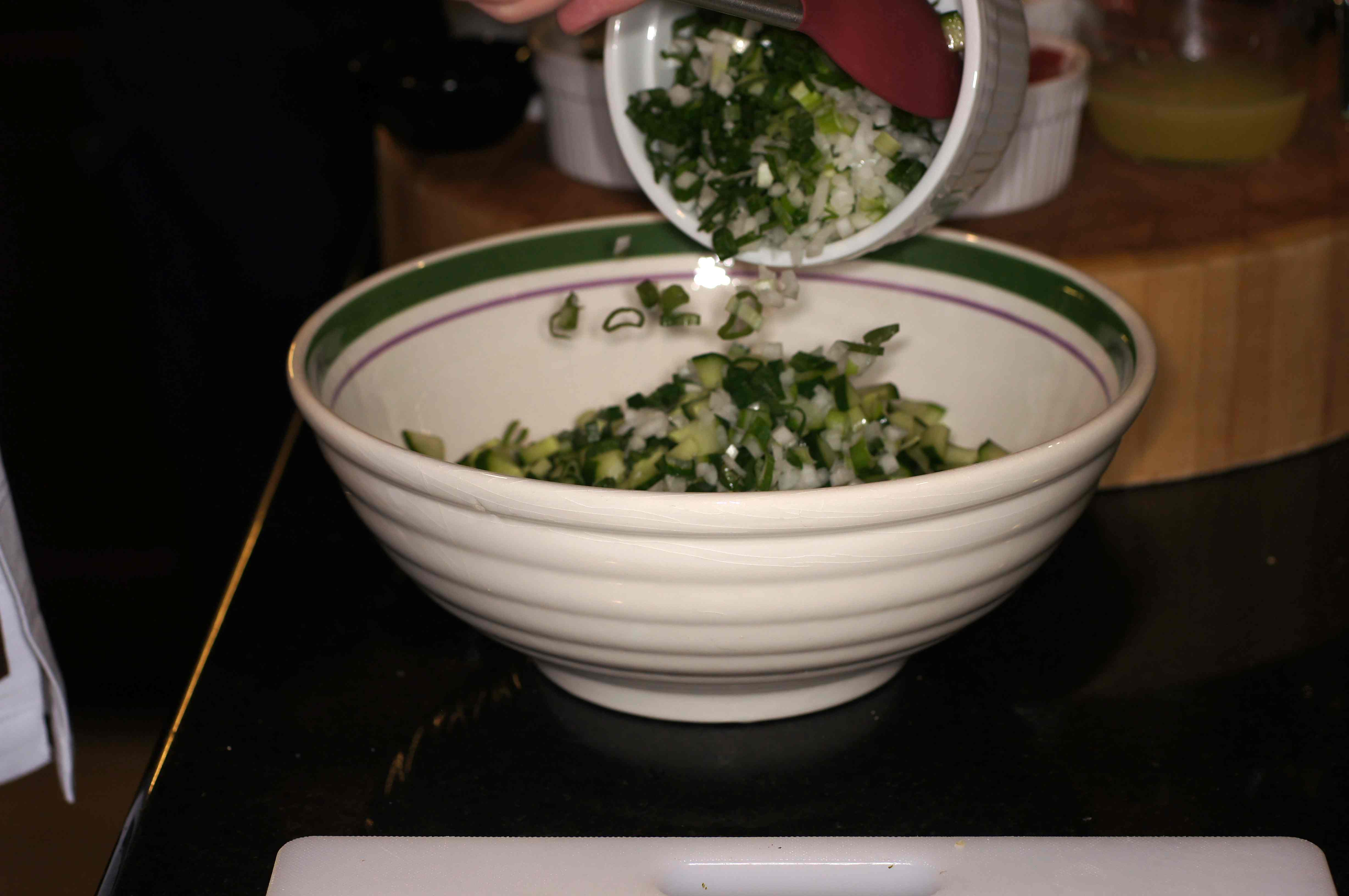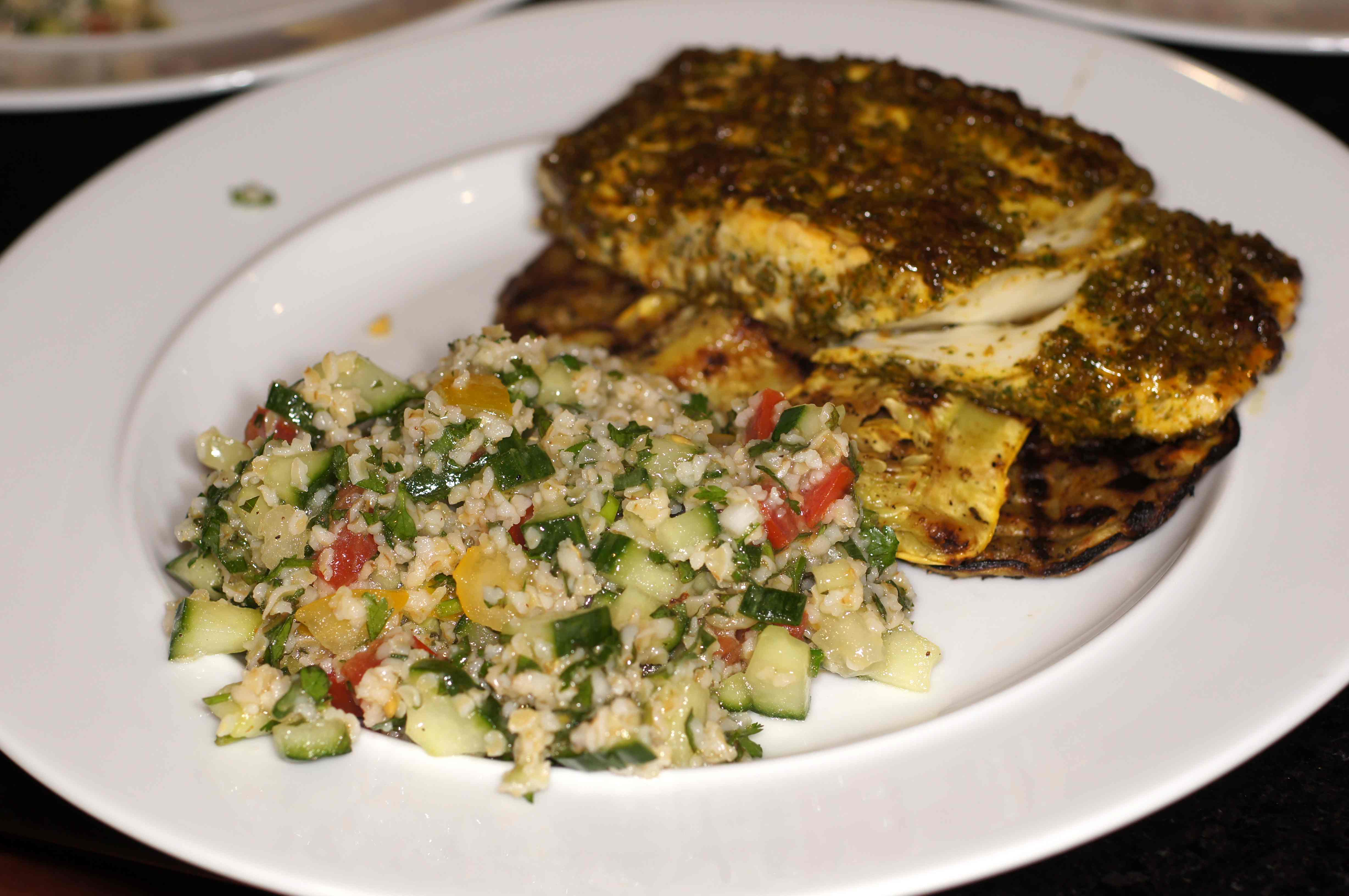 It was then I realized tabbouleh would be the perfect accompaniment for the Moroccan Style Grilled Fish and I could use my lovely fresh mint. Indeed, some people consider tabbouleh to be the ideal food of the Mediterranean diet. Although it originated in the mountains of Lebanon and Syria, it spread in favor throughout the Middle east and Mediterranean region. In fact, tabbouleh is widely popular in Middle Eastern cuisines and is a primary ingredient in kibbeh and tabbouleh. It is also used with falafels, among other dishes. In Turkey you will find a red tabbouleh (Kısır) made with tomato paste or sauce. Not surprisingly, it became immensely popular in the US, as well. Of course, once introduced to the US, it gets “americanized.” Nowadays you see tabbouleh used in a variety of settings from a simple salad, to a side dish like we did here, to a main entree with chicken, fish or other heartier ingredients. It really is pretty versatile and every kitchen should have at least one tabbouleh recipe. This is our basic recipe.