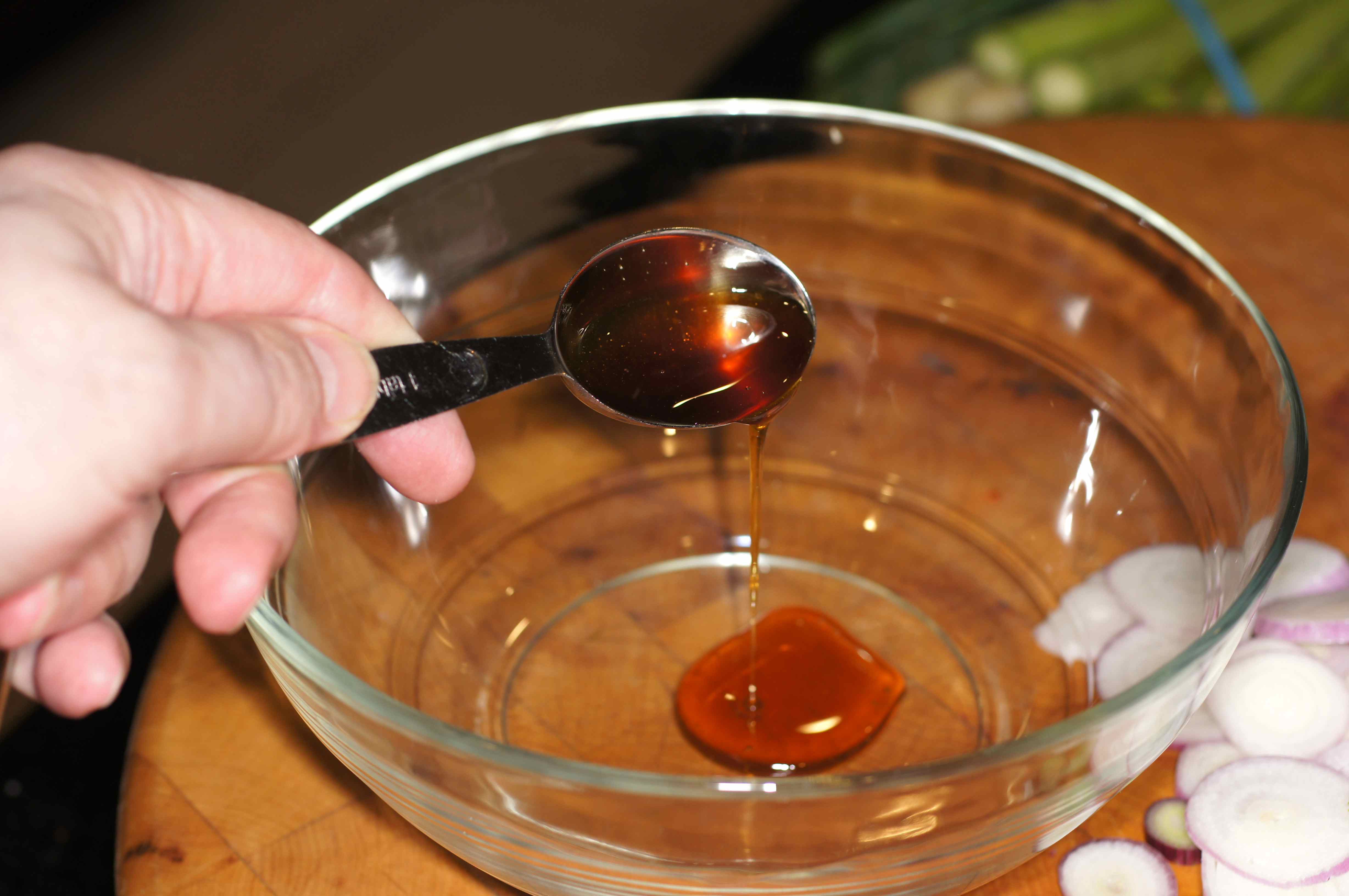 While the potatoes are cooking, make the pickled onions. First, add honey to a medium size mixing bowl