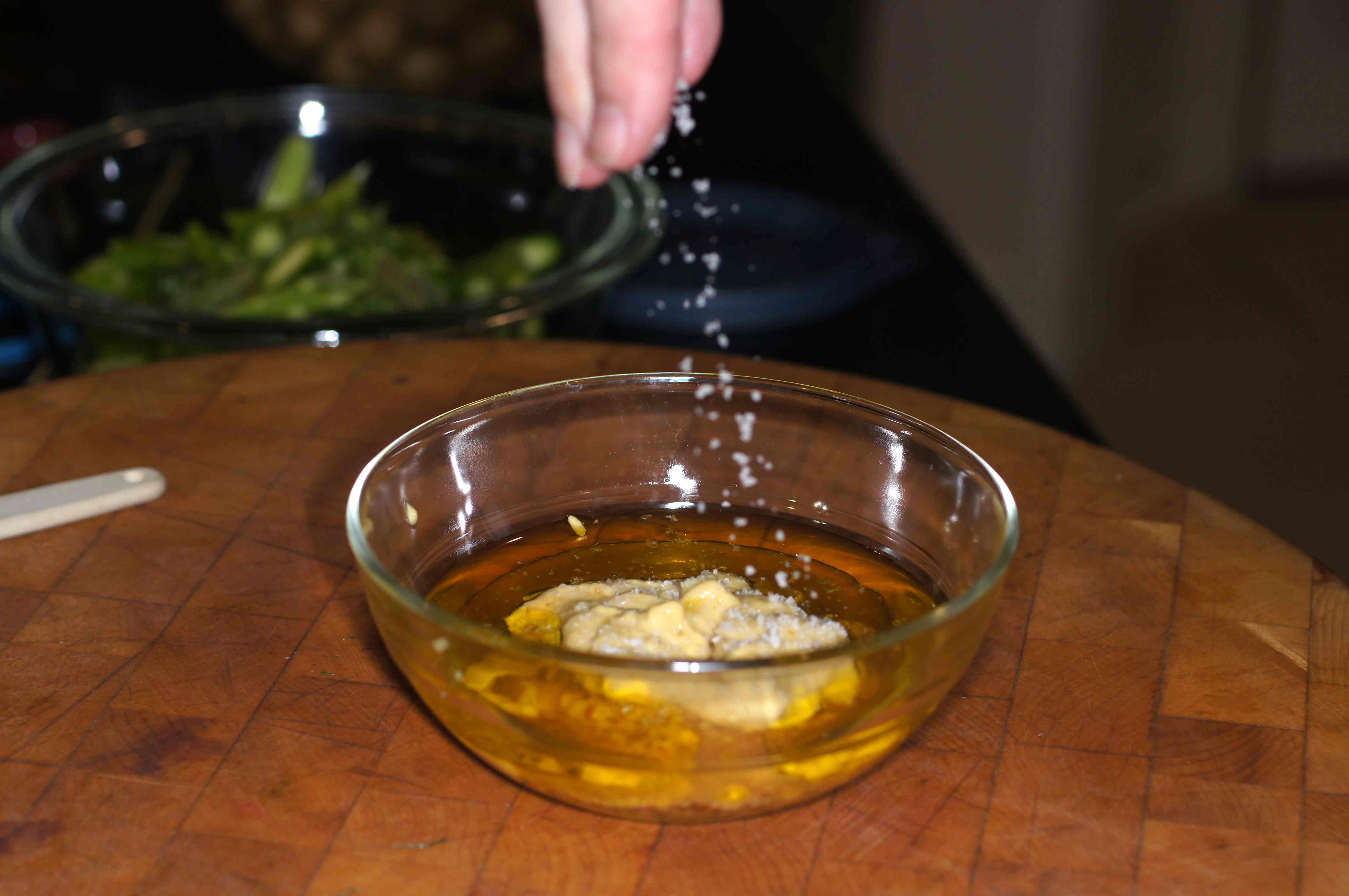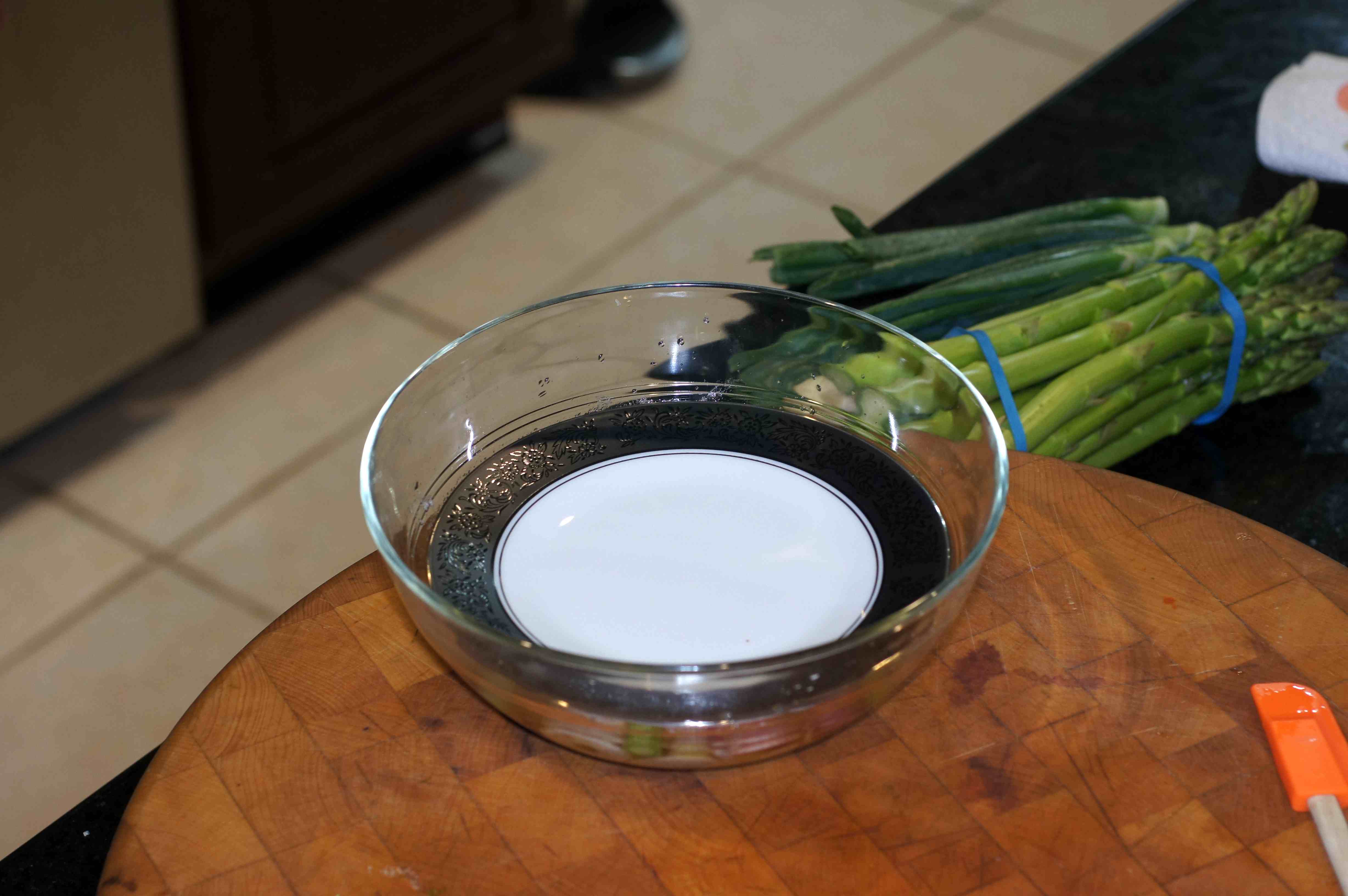 Cover and refrigerate for 2 hours until ready to serve. When ready to serve, par blanche the asparagus by pouring the asparagus into salted, boiling water with 1/2 tsp baking soda to preserve the color of the asparagus.