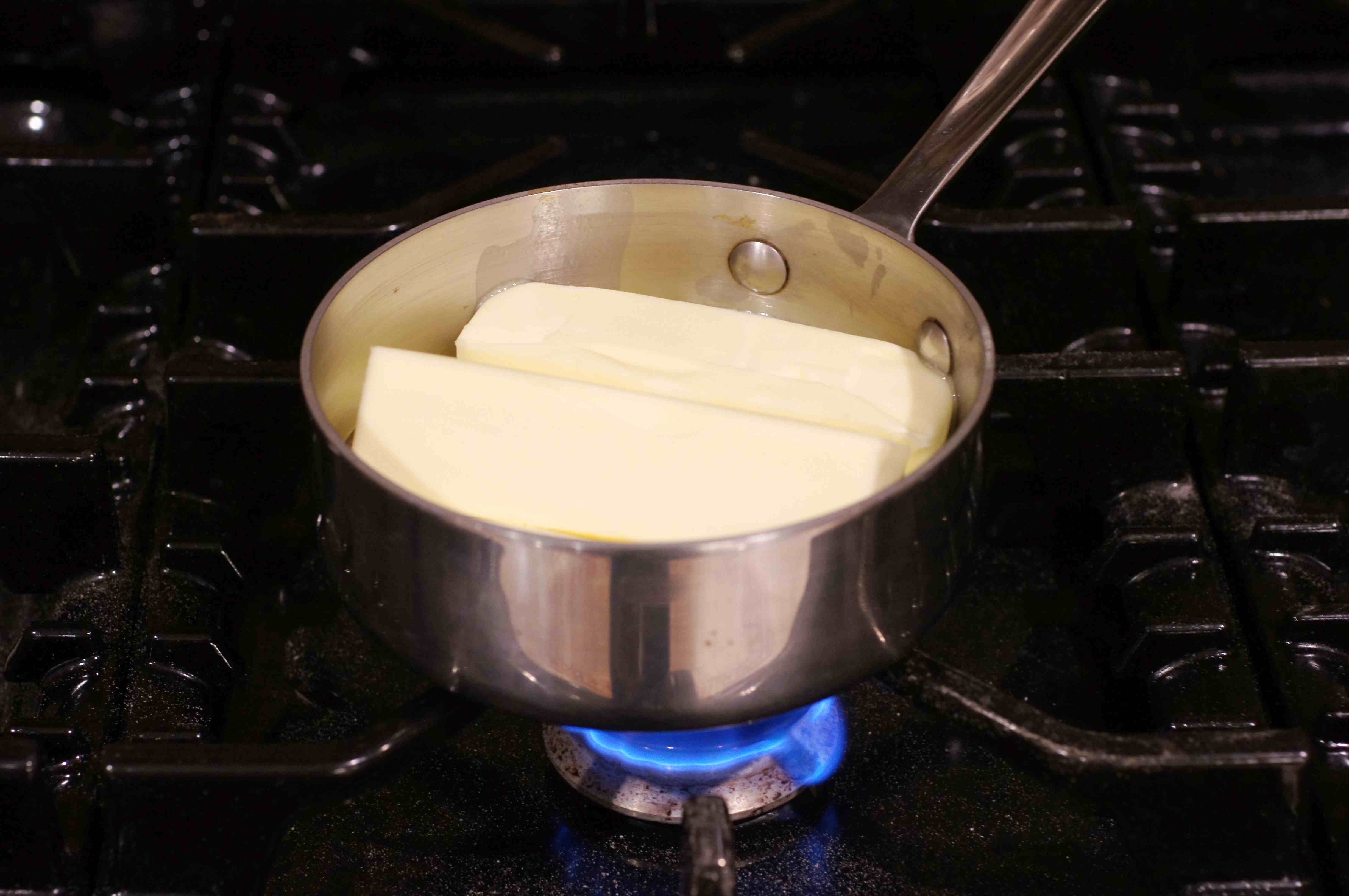 Melt the butter slowly without disturbing. When melted you will have 3 layers. The top layer is foamy and is a part of the milk solids that rose to the top. The next layer and layer with the largest volume is the butter fat. The bottom layer is water along with the remaining milk solids. When completely melted turn off heat.