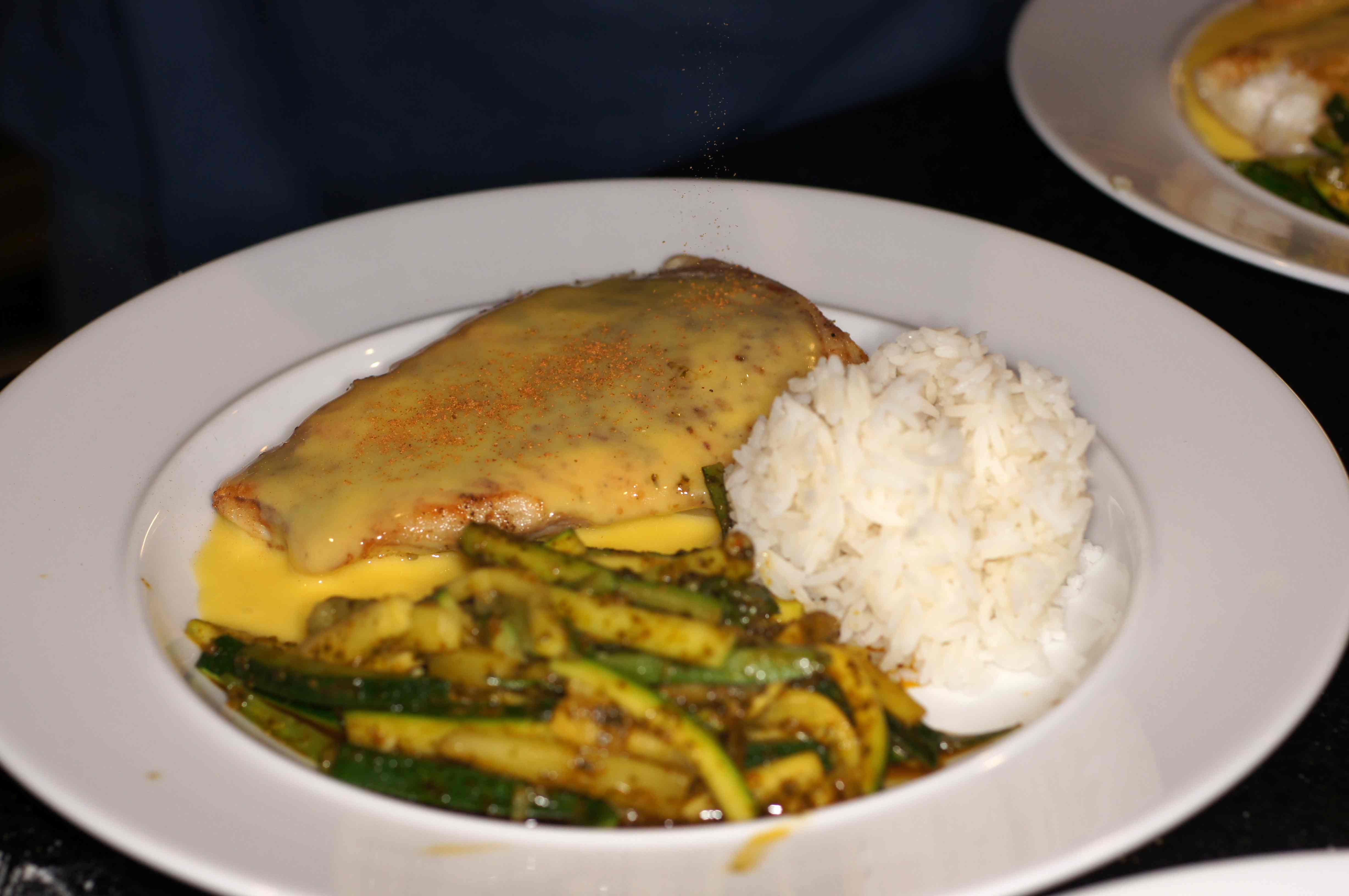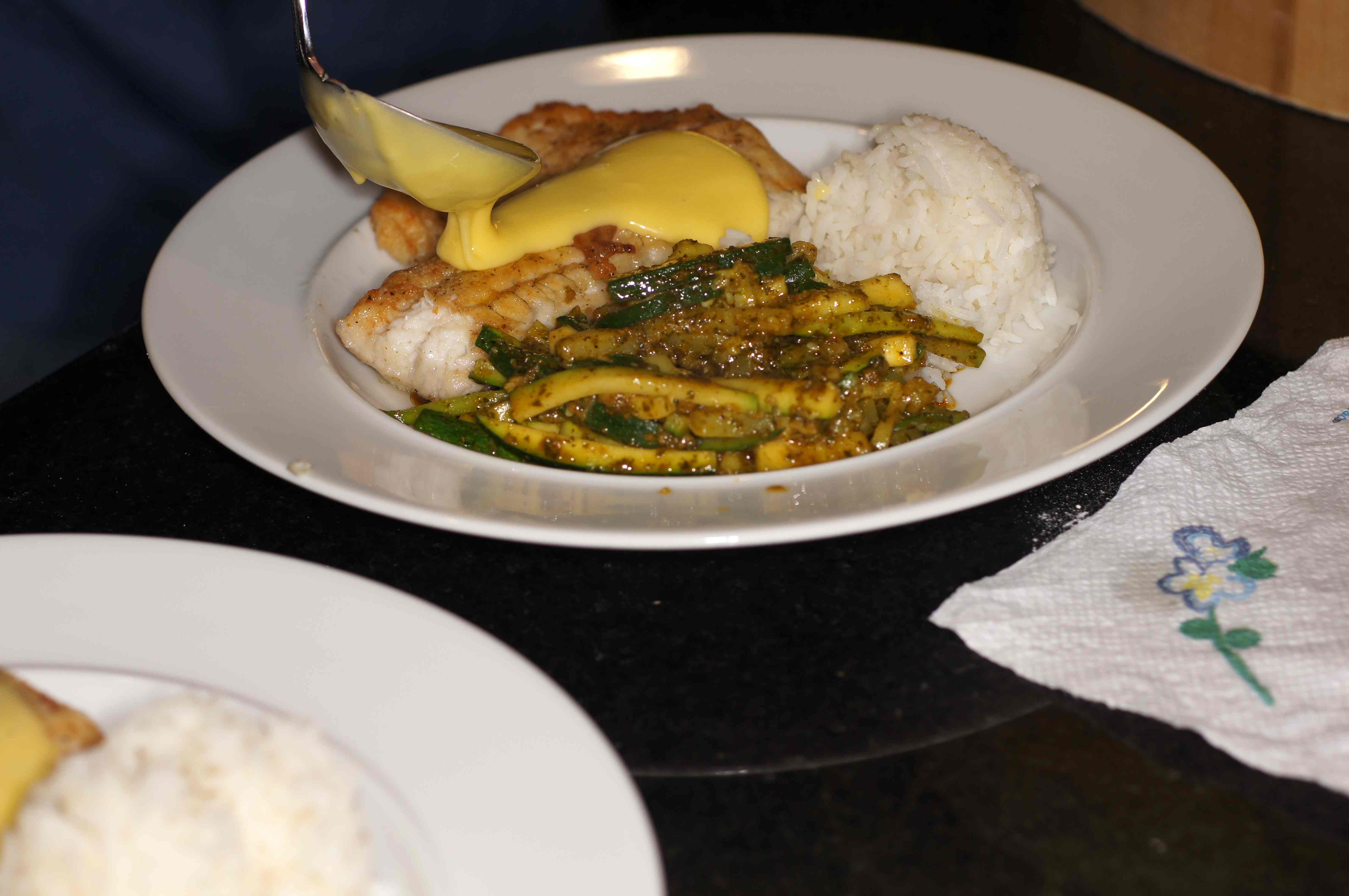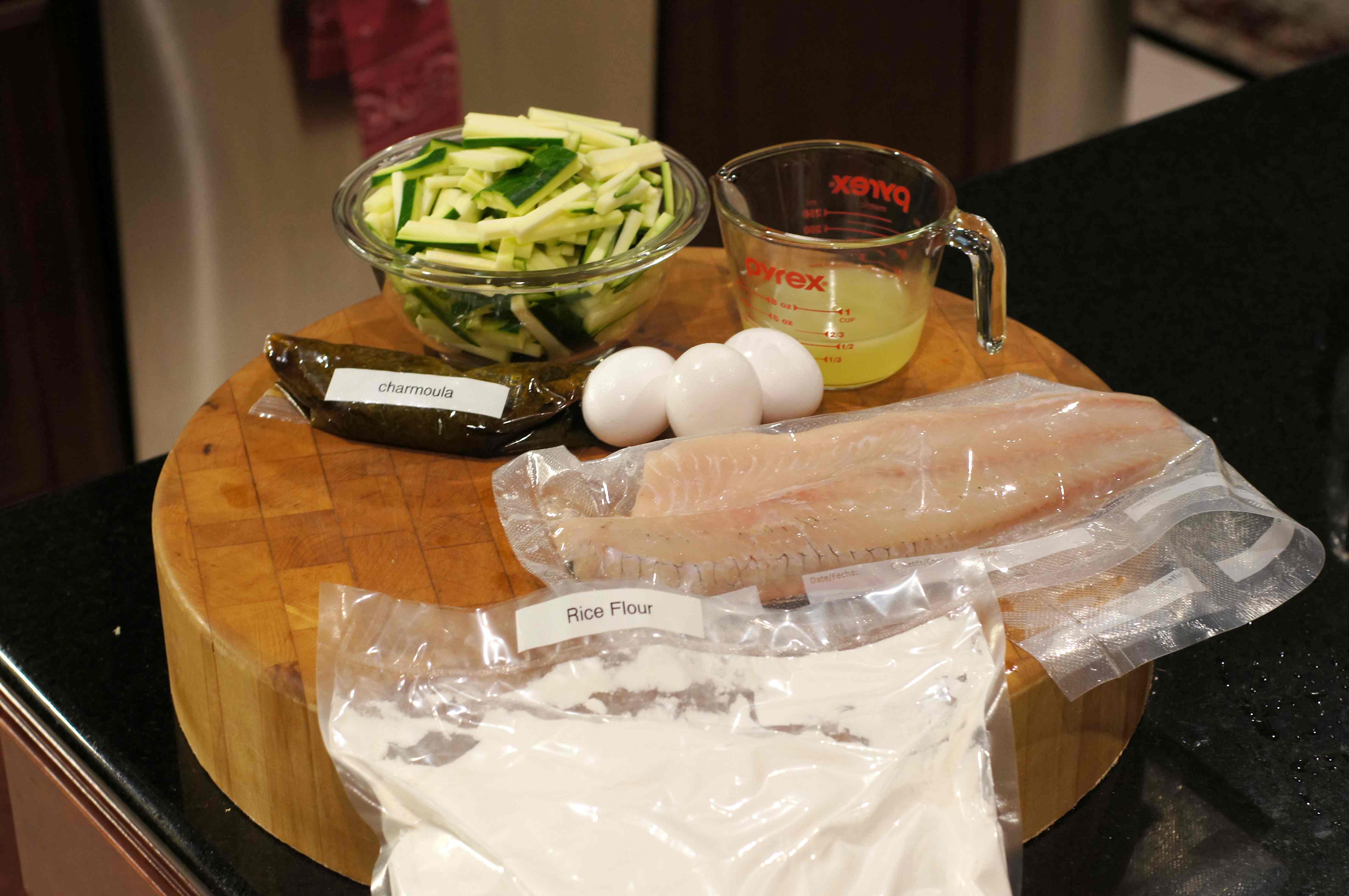 Walleye are also called Yellow Pike and Walleye Pike, however, it’s not a pike. In fact, walleye belongs to the perch family and is the largest member of that family. It has an olive back with gold sides, a white belly, black strips on the upper sides and a white dot on the tail fin. Walleye has a sweet, mild flavor with a fine flake and is highly regarded in most culinary communities. It is quite versatile, can be cooked using most methods and prepared similarly to sole, flounder and other flatfishes. Given it’s versatility, I decided to to a pan fried walleye in clarified butter. Inasmuch as I was going to make clarified butter, then a hollandaise sauce was in order. Then I remembered the charmoula in the freezer and knew it would be perfect with zucchini and we would have a Mediterranean style meal. It was absolutely delicious and this is what we did.