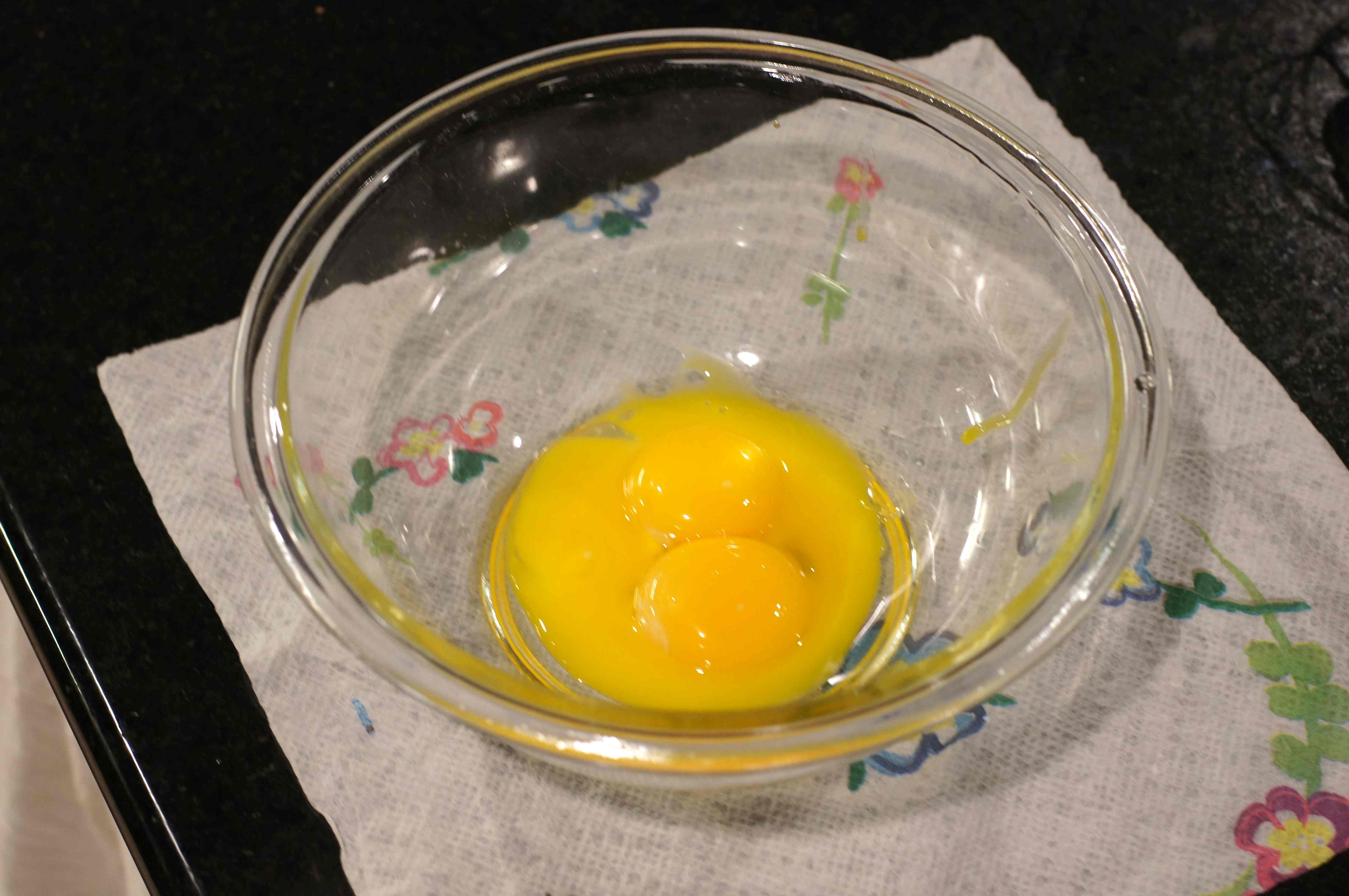 Now, many people make hollandaise sauce in a blender because it is quick and easy. I gently cook the yolks and whisk in the butter and lemon juice. So, separate 3 eggs and put the yolks into a small mixing bowl.
