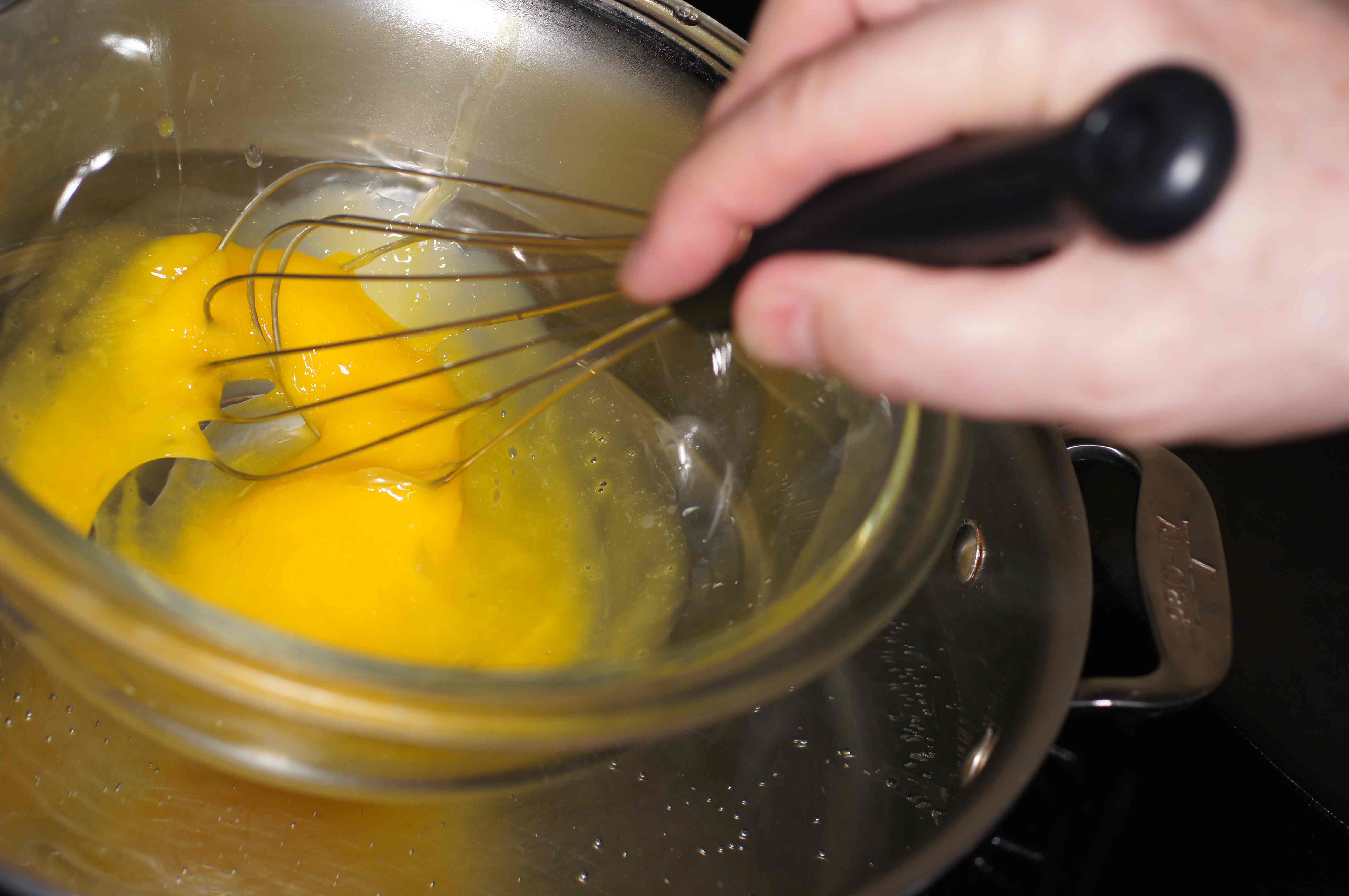 Heat a pot of water over high heat. Do NOT bring the water to a boil. Some recipes will tell you to bring the water to a simmer and pace the bowl over the water but not into it. If you’re doing this for the first time, I would recommend that approach. I have done this so many times that I know what I want so I heat the water to roughly 185 F and then set the bowl with the egg yolks into the water and rapidly whisk to keep the eggs from cooking to scrambled eggs. You want to heat the eggs and cause them to thicken slightly.