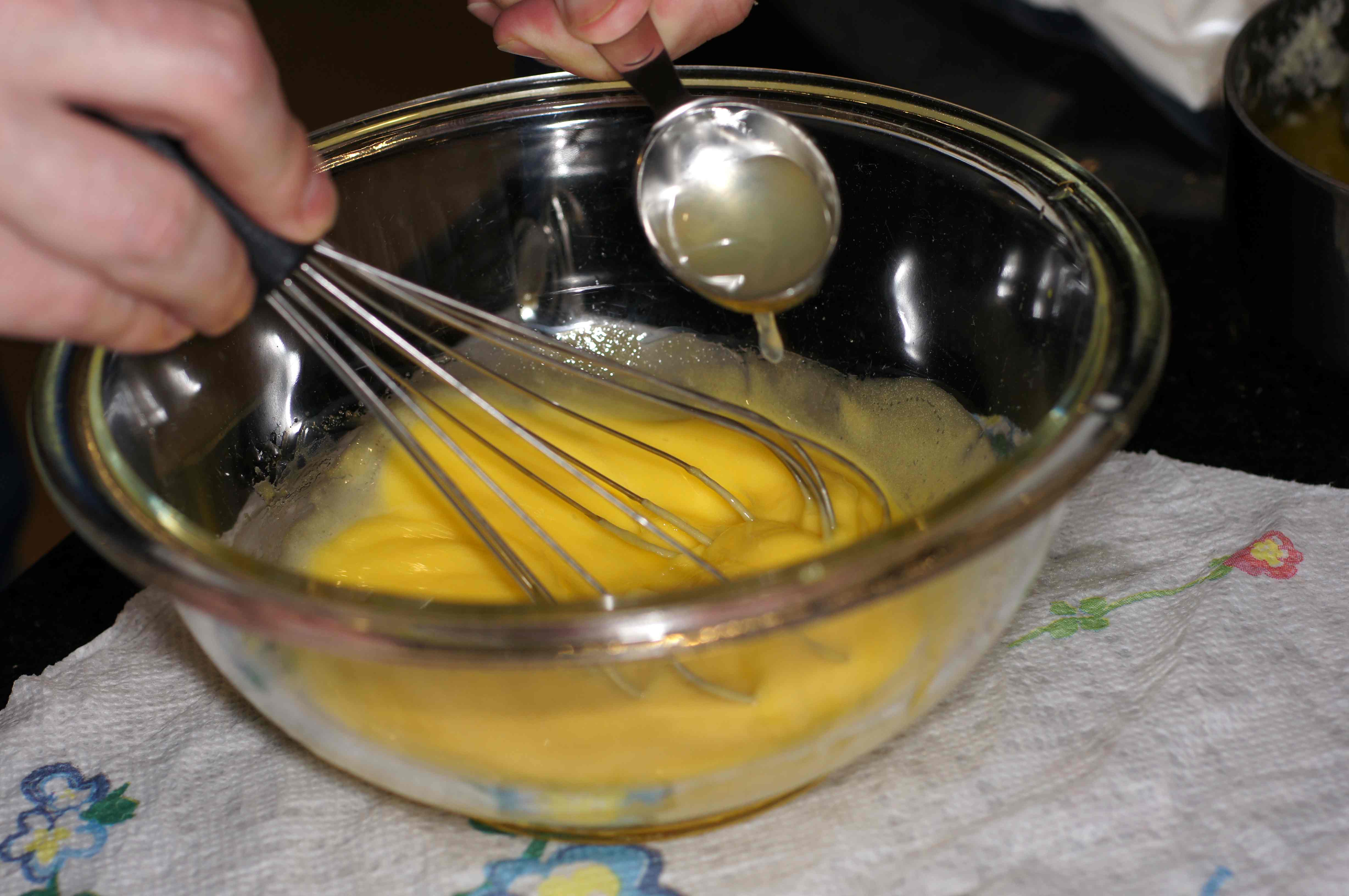 When slightly thickened remove from the heat and continue to whisk as residual heat will continue cooking the eggs. Now drizzle the clarified butter into the egg yolks to create the emulsification being careful not to break the sauce.